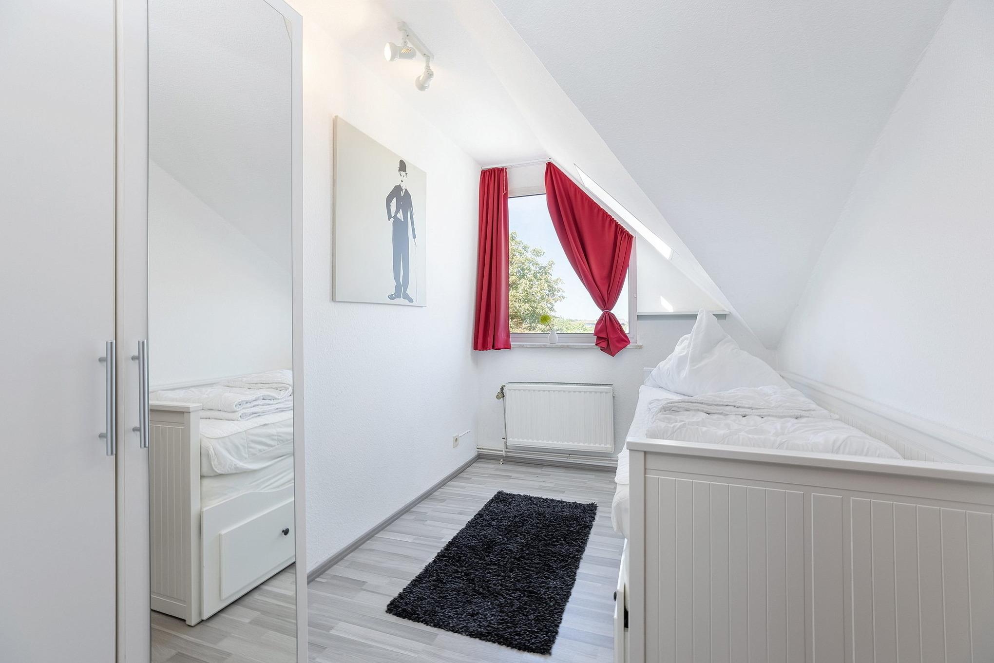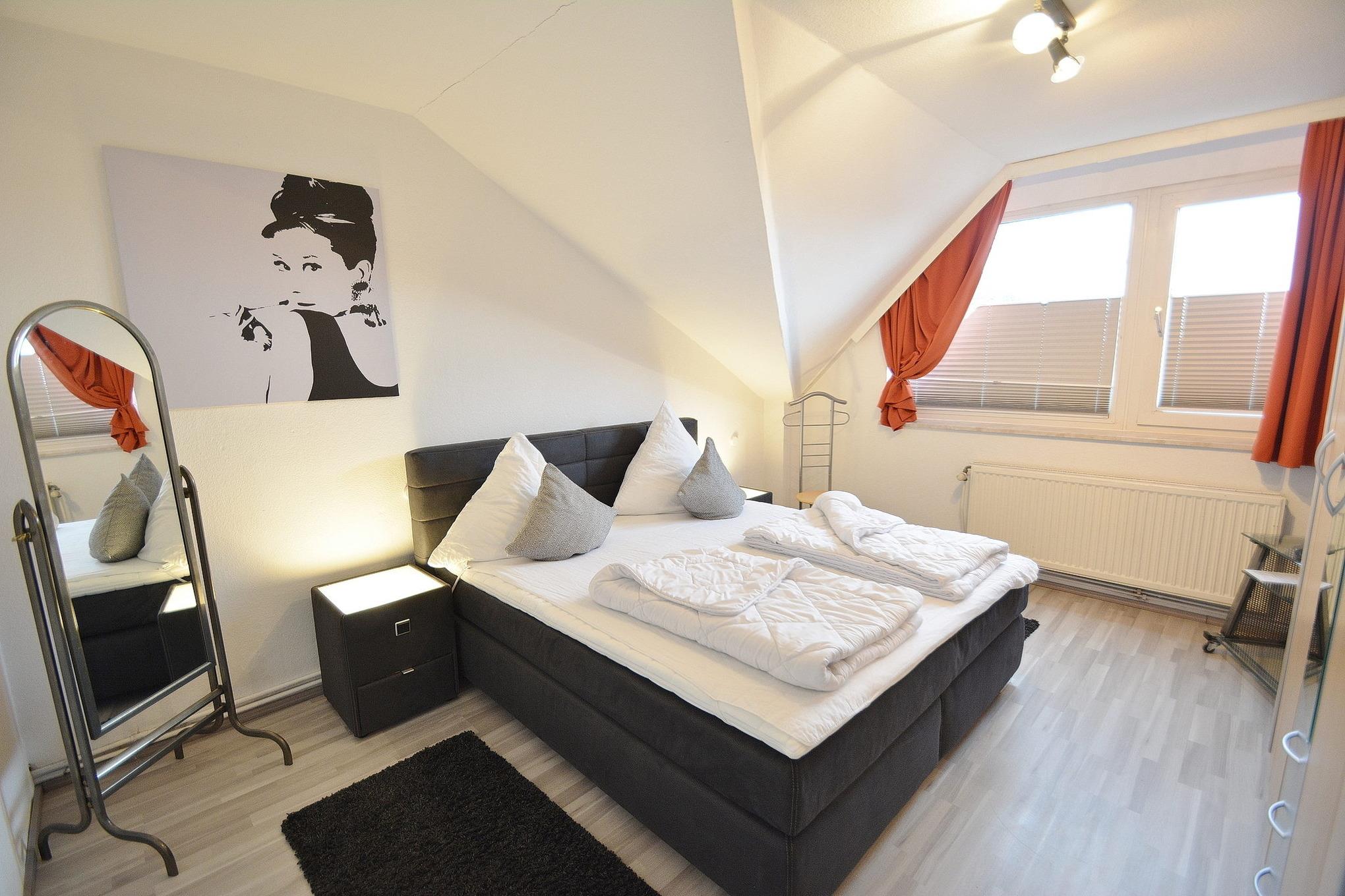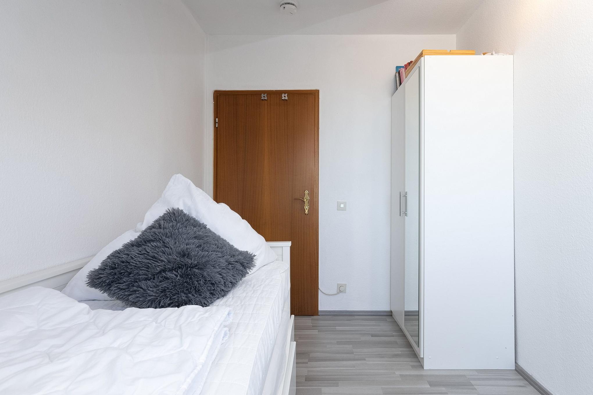 Das moderne, freundliche Schlafzimmer ist mit einem Doppelbett (180 x 200 cm), einem großen Kleiderschrank mit Spiegel ausgestattet. Das Schlafzimmer ist mit Laminatboden ausgelegt. Das Fenster lässt sich durch Blickdichte Gardinen verdunkeln.
