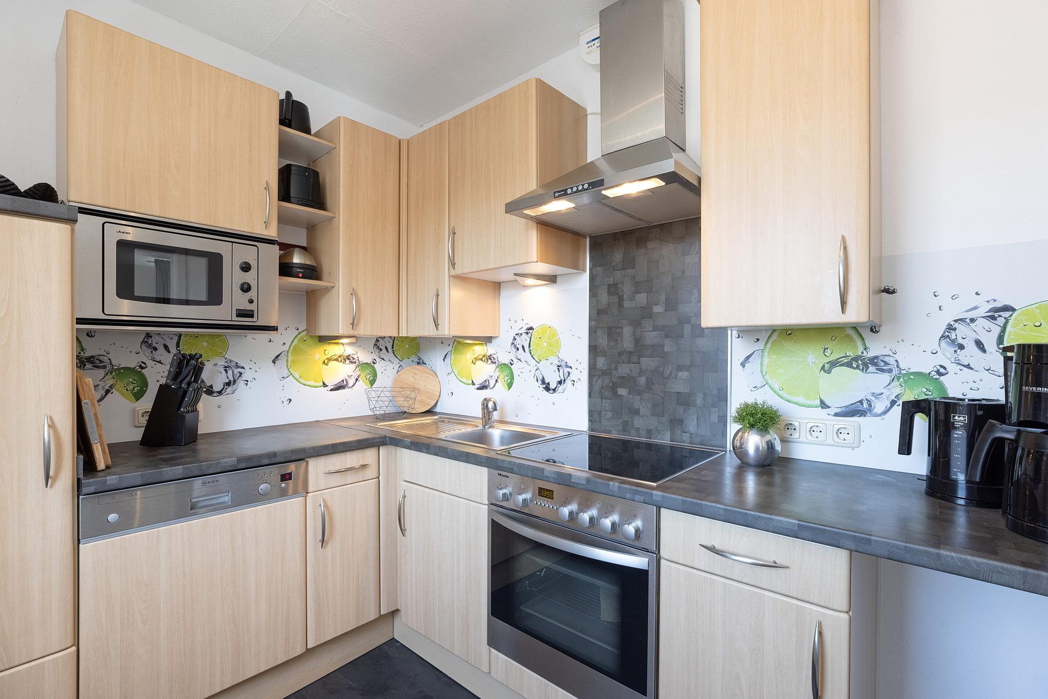 Große, komplett eingerichtete separate Einbauküche mit Fenster. Die Küche ist ausgestattet mit Spülmaschine, 4-Platten Cerankochfeld und Backofen, Kühlschrank, großer separater Gefriertruhe, Kaffeemaschine, Mikrowelle, Wasserkocher, Eierkocher und Toaster.