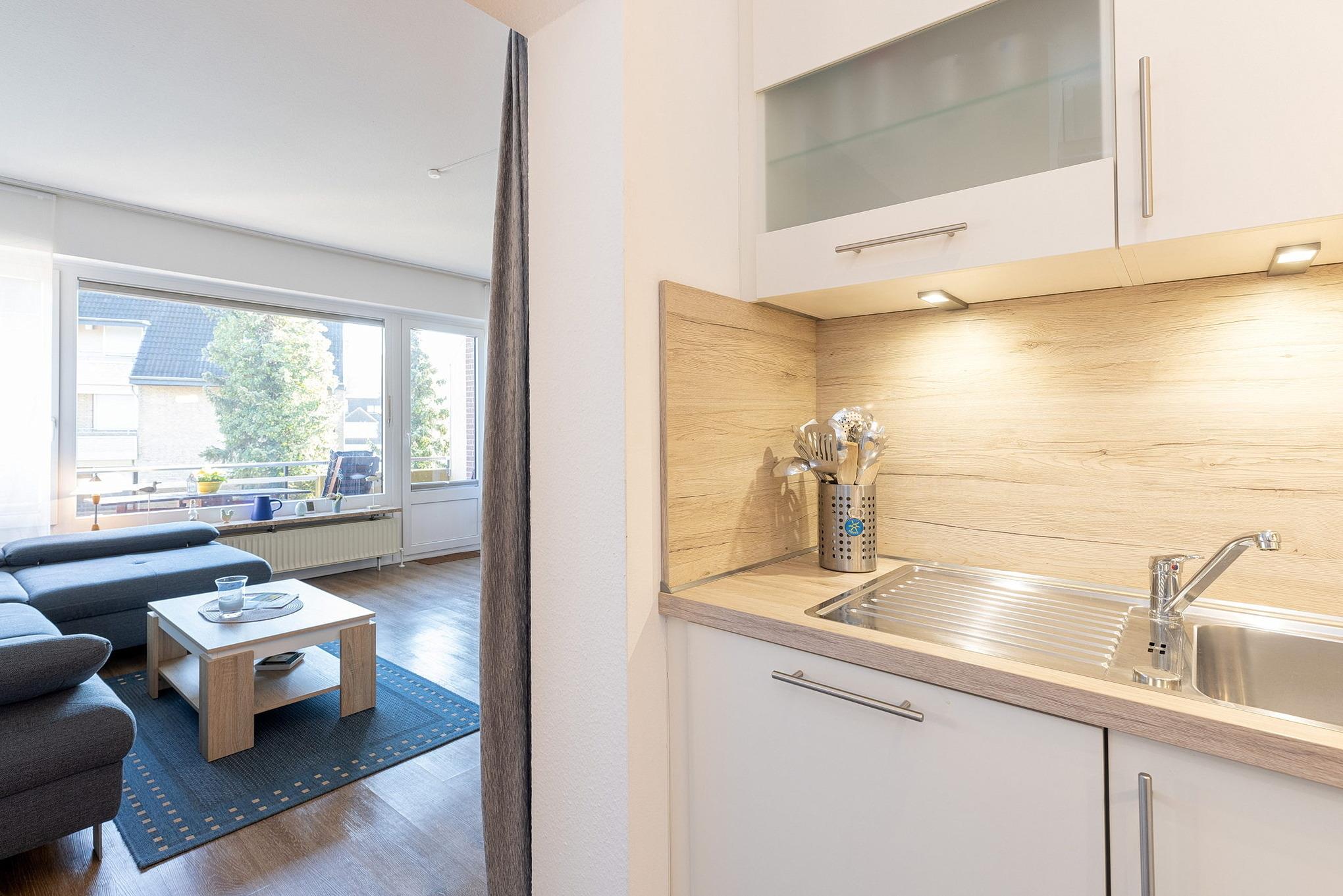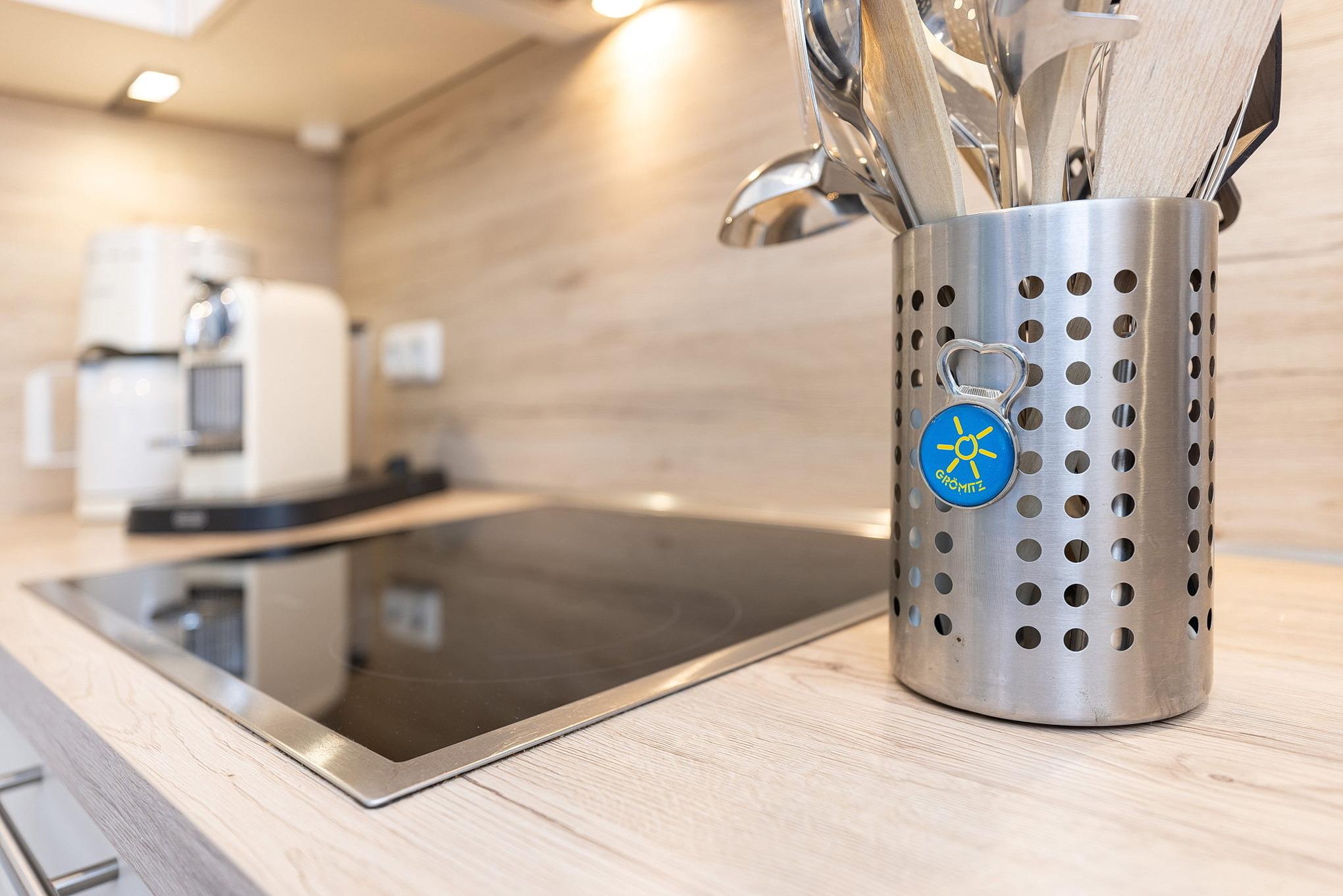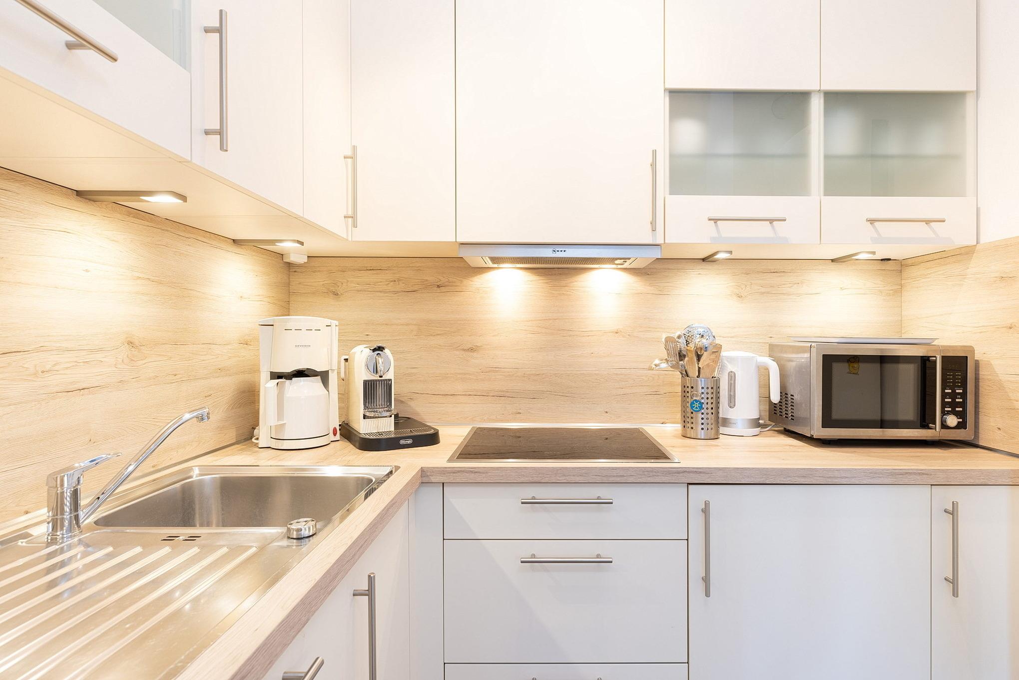 Moderne, komplett ausgestattete Küche mit Spülmaschine, 4 Platten Cerankochfeld, Kühlschrank mit kleinem 3-Sterne Gefrierfach, Toaster, kleinen Backofen, Wasserkocher und Kaffeemaschine.
