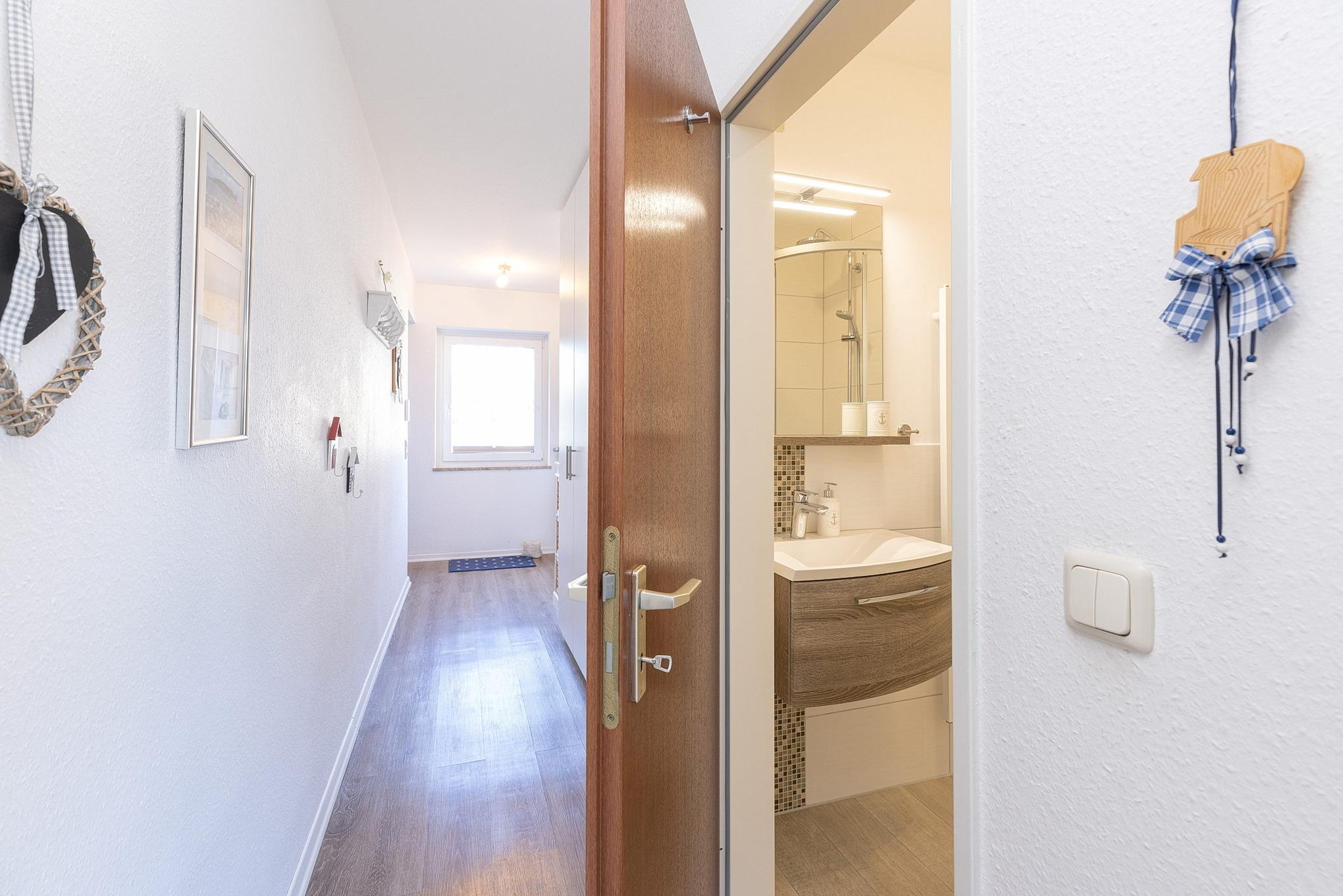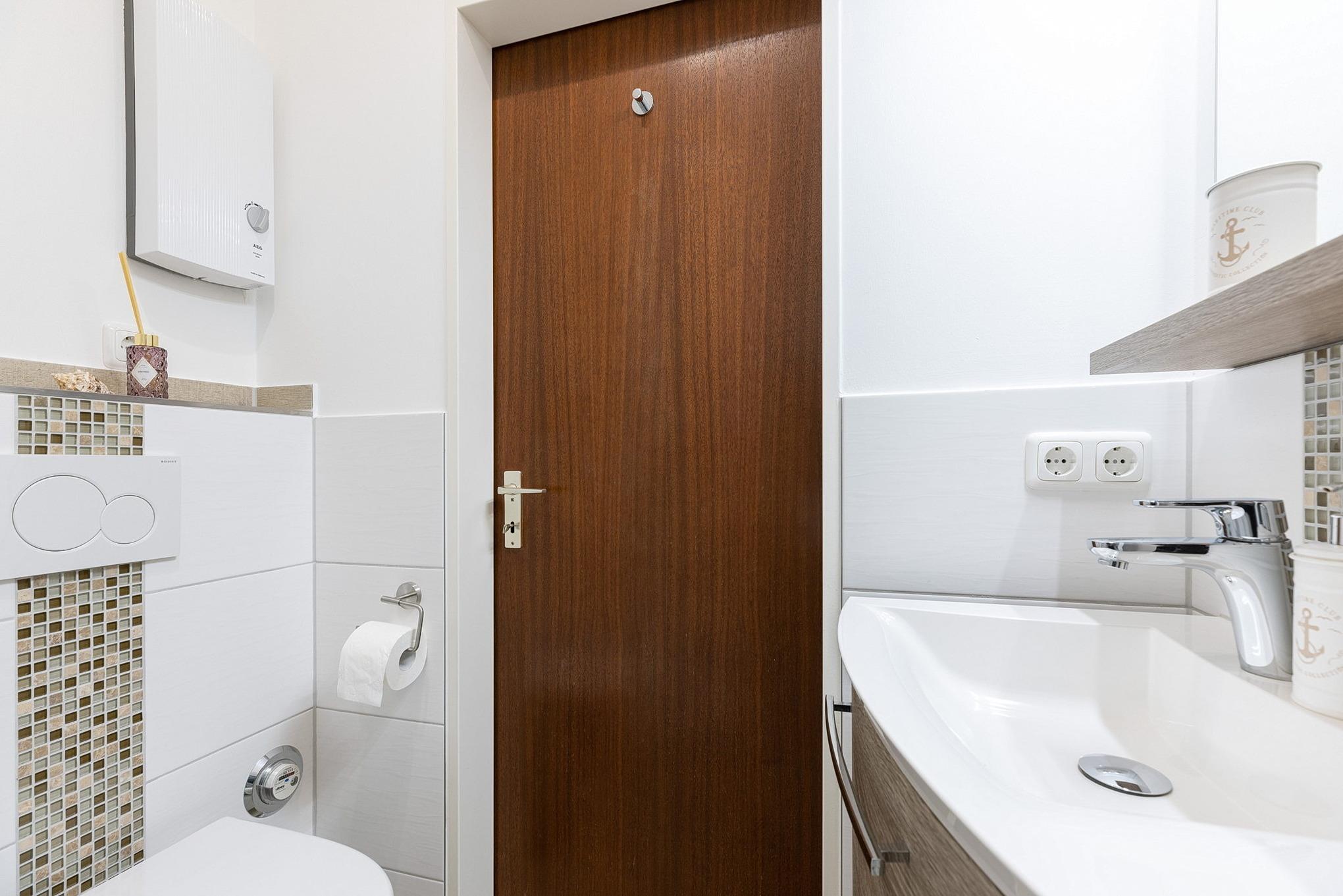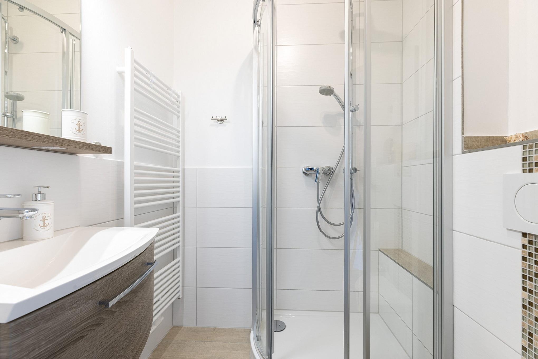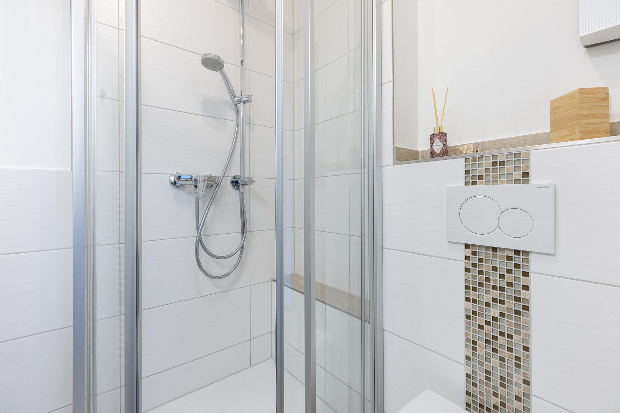 Hell gefliestes, gepflegtes Bad mit Dusche, WC und Waschbecken.