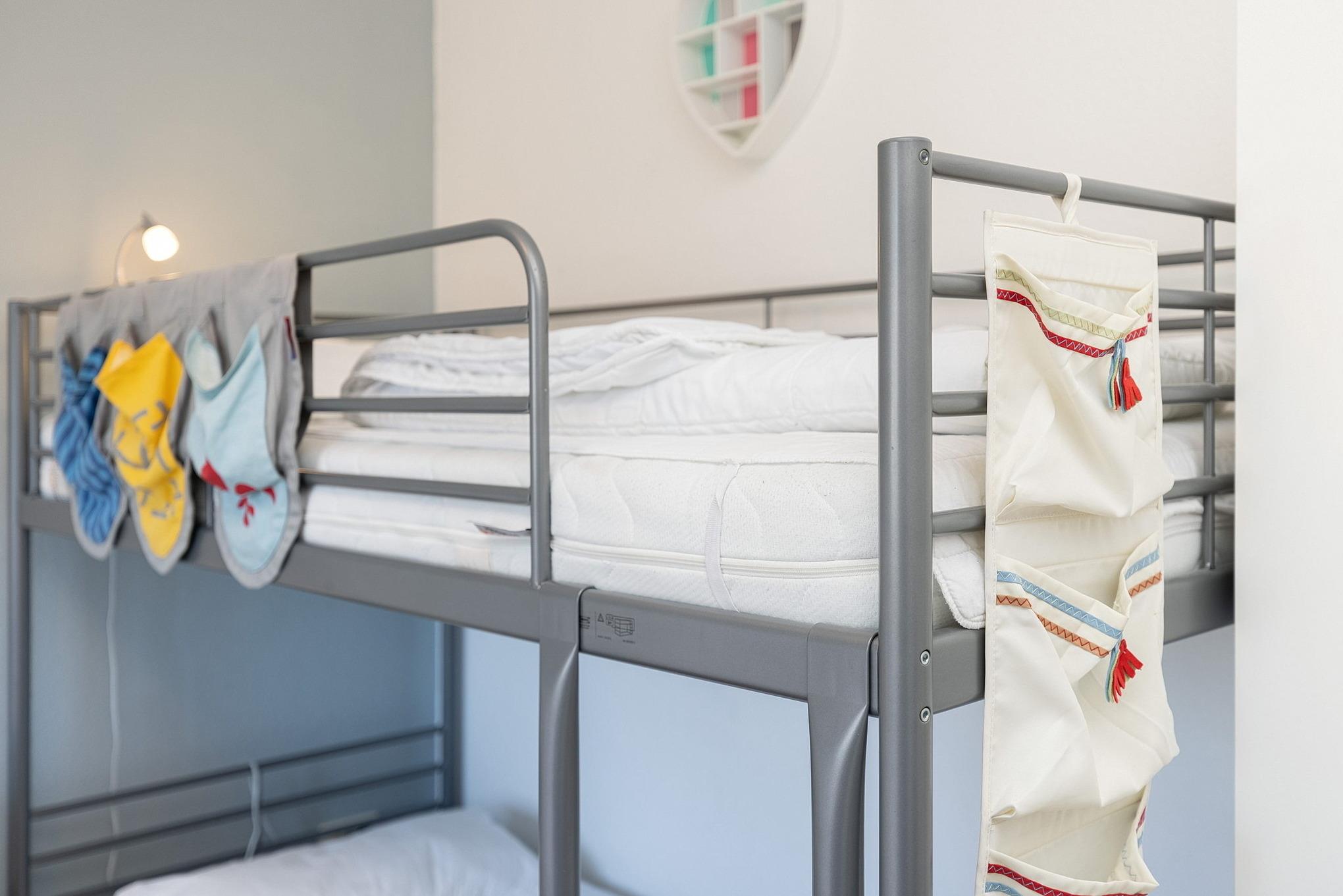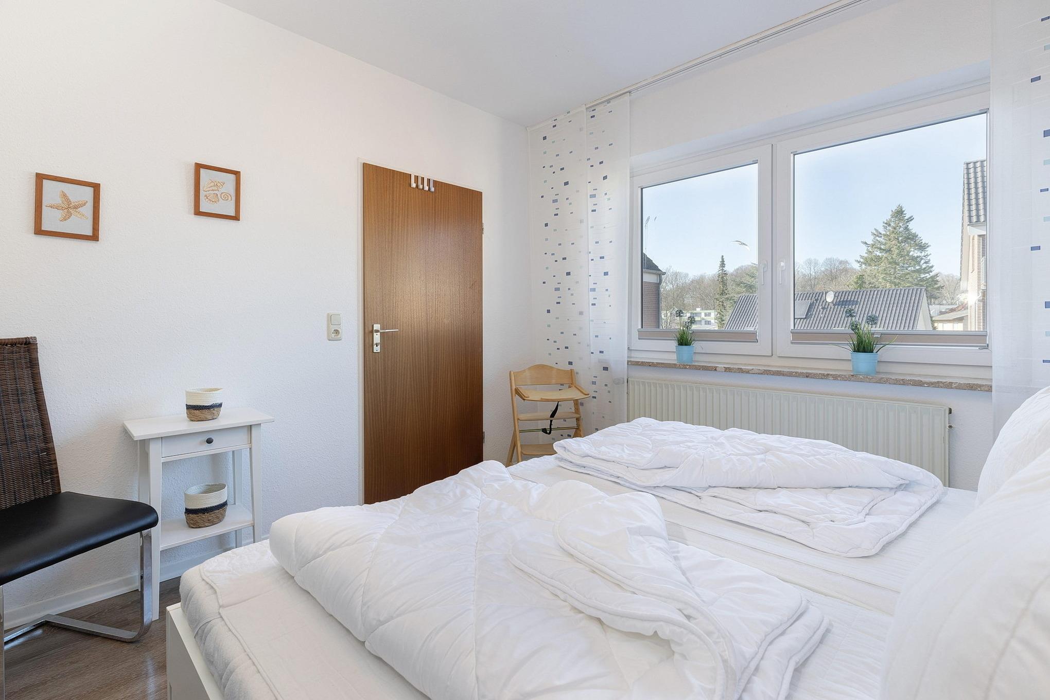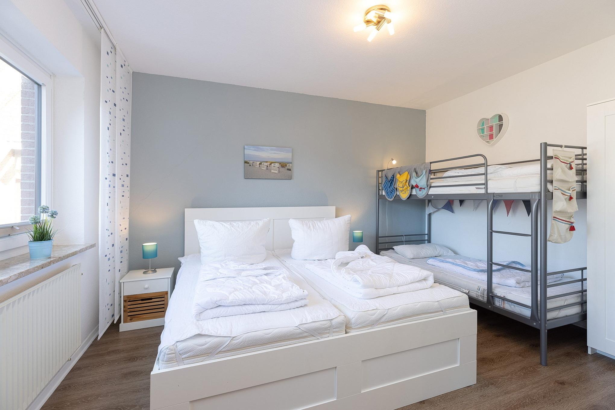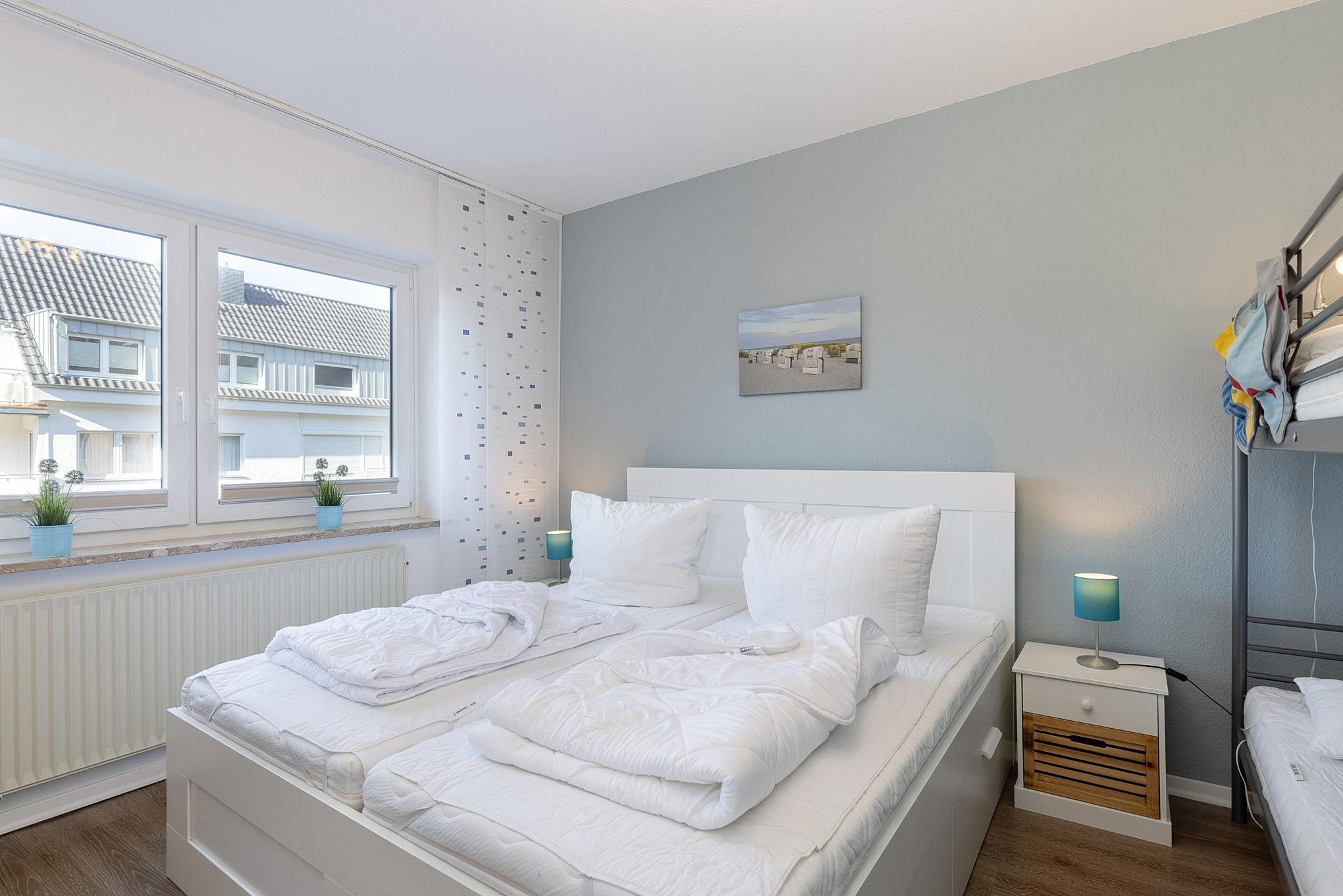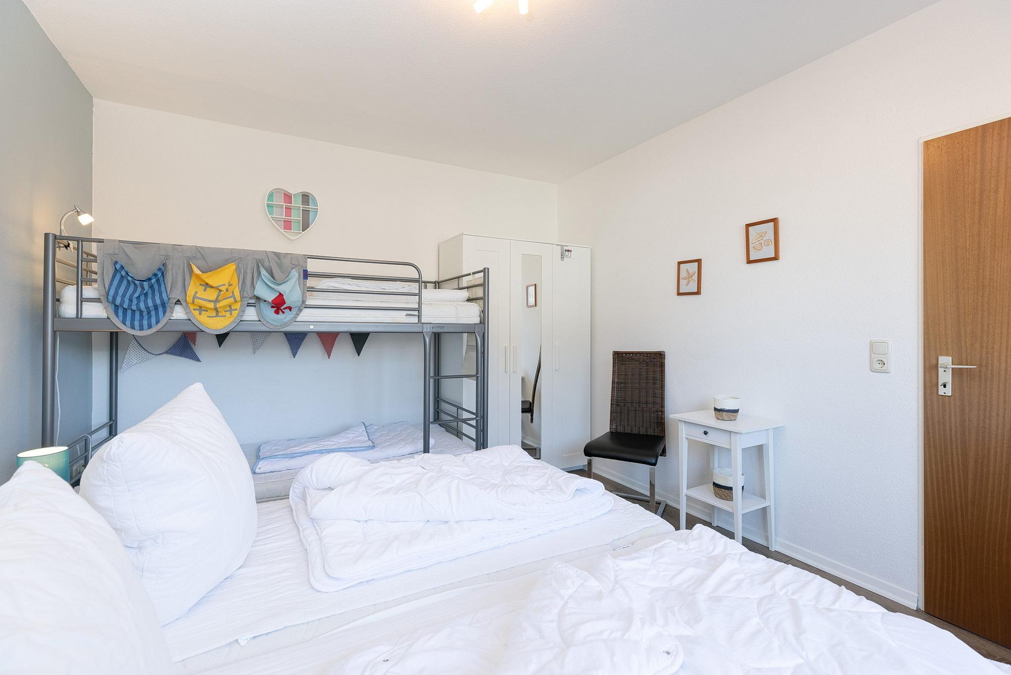 Das modern eingerichtete Schlafzimmer ist mit einem Doppelbett (2x 90x200cm), 2 Nachttischen und einem 3-türigen Kleiderschrank ausgestattet. Des Weiteren befindet sich ein Etagenbett in dem Zimmer. Das Schlafzimmer ist mit Designer-Platten ausgelegt; das Fenster lässt sich durch ein Innenrollo blickdicht verdunkeln.