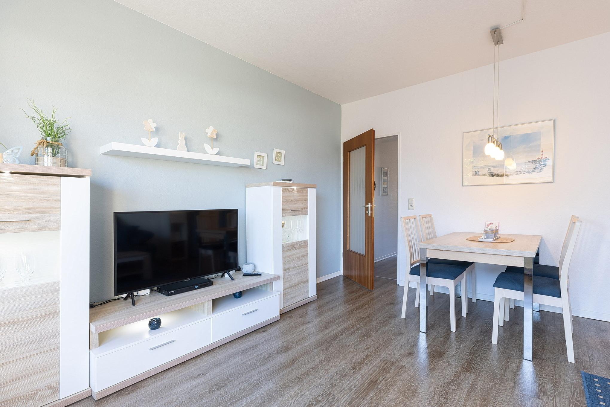 Gemütliches, freundliches und helles Wohn- und Esszimmer mit direktem Zugang zum Balkon in süd-östliche Richtung. Das Wohn- und Esszimmer ist mit einem Essplatz für 4 Personen, einer Eckcouch mit Schlaffunktion (120x190cm), einem Sessel, einem Couchtisch und einem Wohnzimmerschrank ausgestattet. Das Zimmer ist mit Designer-Platten ausgelegt. Zur Unterhaltung stehen ein Flachbild-Fernseher, ein DVD-Player und ein Radio mit CD-Player zur Verfügung. Das Fenster lässt sich durch einen Vorhang und Lamellen etwas verdunkeln.