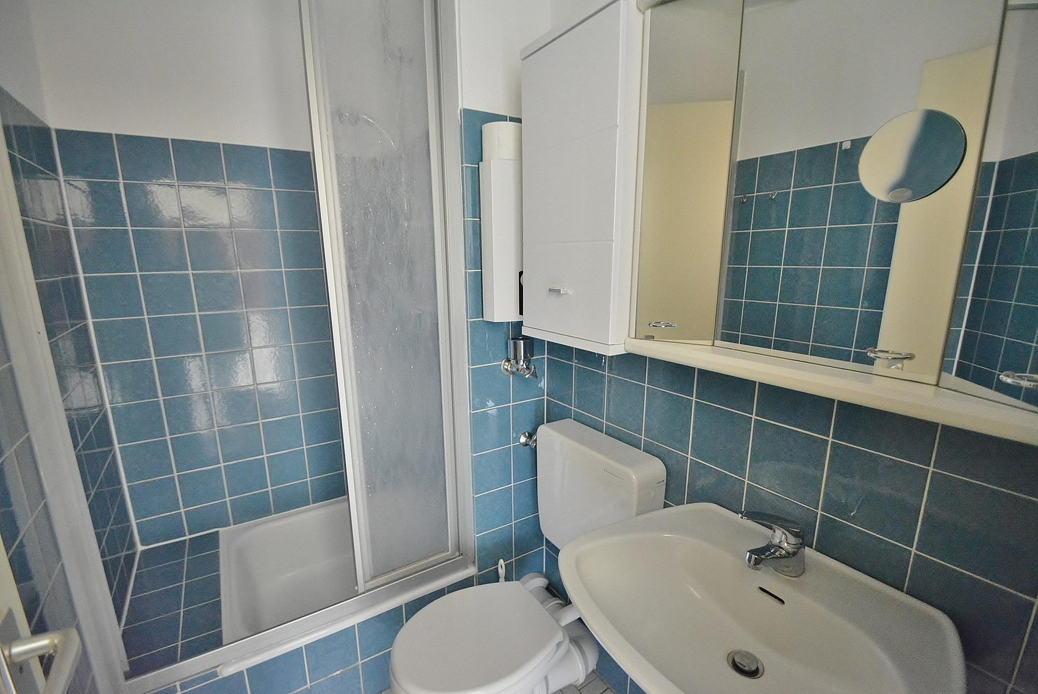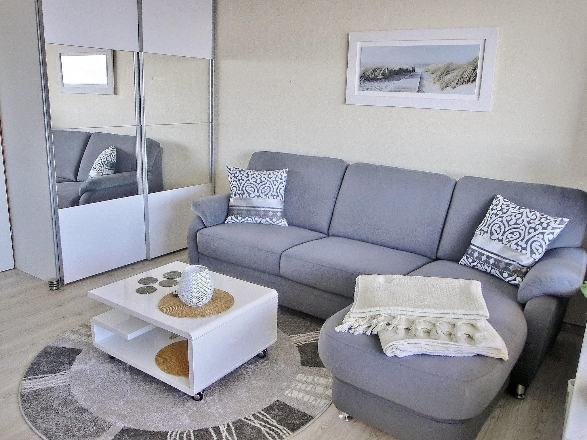Das helle freundliche Wohnzimmer mit direktem Zugang zum Balkon ist ausgestattet mit einer Eckcouch mit Schlaffunktion (120x200cm), einem Kleiderschrank und einem Essplatz für 4 Personen. Zur Unterhaltung steht ein Flachbildfernseher zur Verfügung. Der Raum ist mit Laminatboden ausgelegt, das Fenster lässt sich durch einen Vorhang verdunkeln.