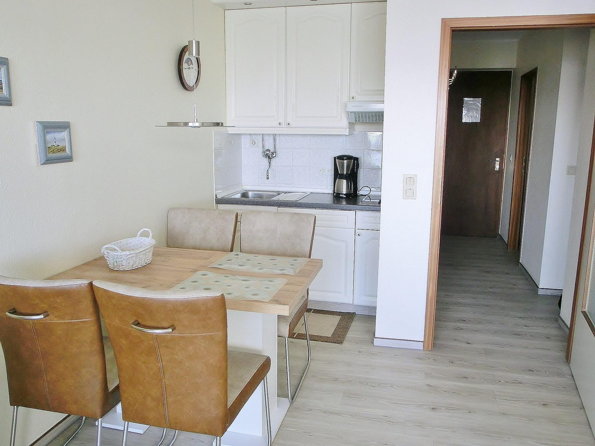 Zum Wohnbereich offene komplett ausgestattete kleine Küchenzeile mit 2-Platten Cerankochfeld und Kühlschrank mit kleinem Gefrierfach. Zur Nutzung stehen eine Kaffeemaschine, ein Wasserkocher und ein Toaster bereit.
