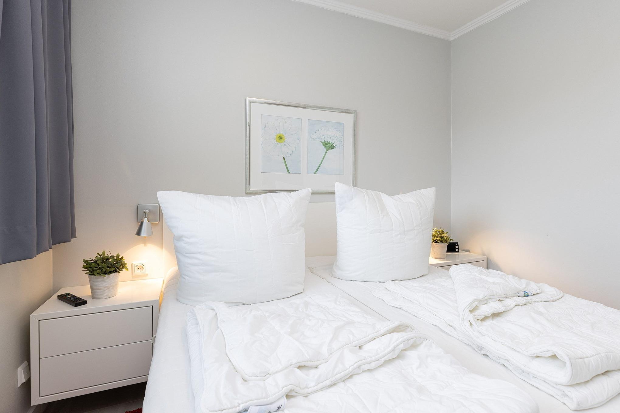 Kleines Schlafzimmer mit einem Doppelbett (je 80x190cm), Fernseher und Kleiderschrank. Der Raum ist gefliest, das Fenster lässt sich durch einen Vorhang verdunkeln.