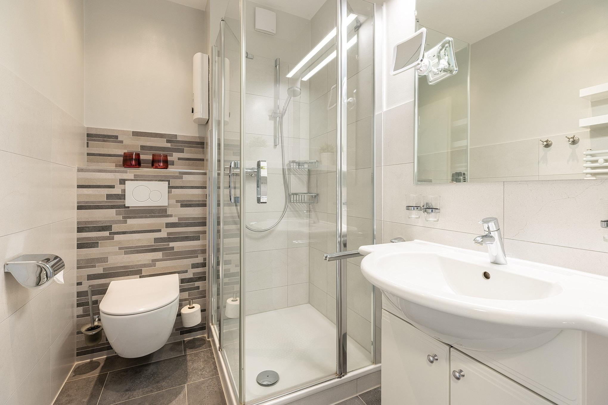 Kleines hellgefliestes Badezimmer mit Dusche, WC und Waschbecken.