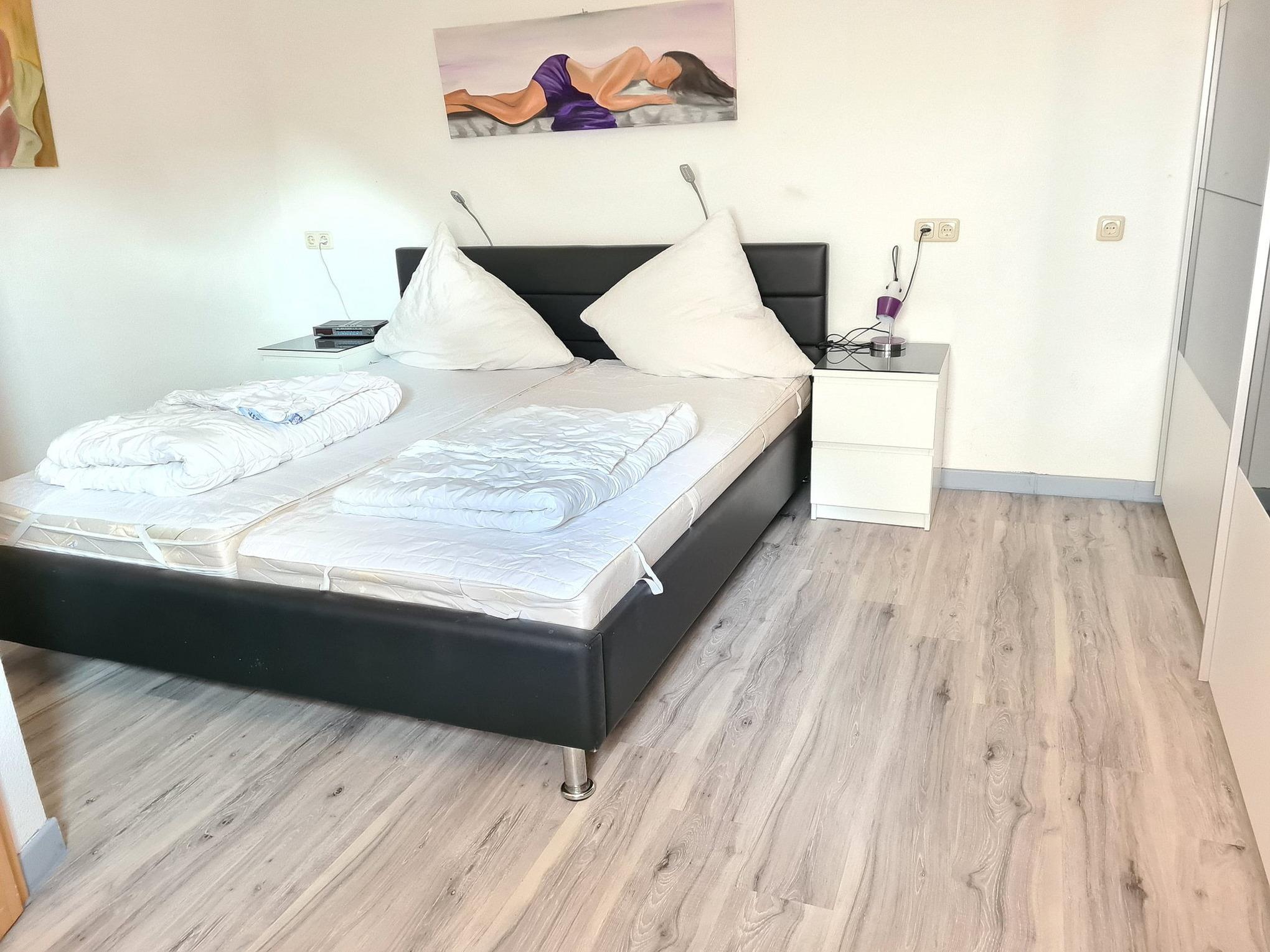 Großes Schlafzimmer mit Doppelbett und großem Kleiderschrank. Der Raum ist mit Vinylboden ausgelegt.
