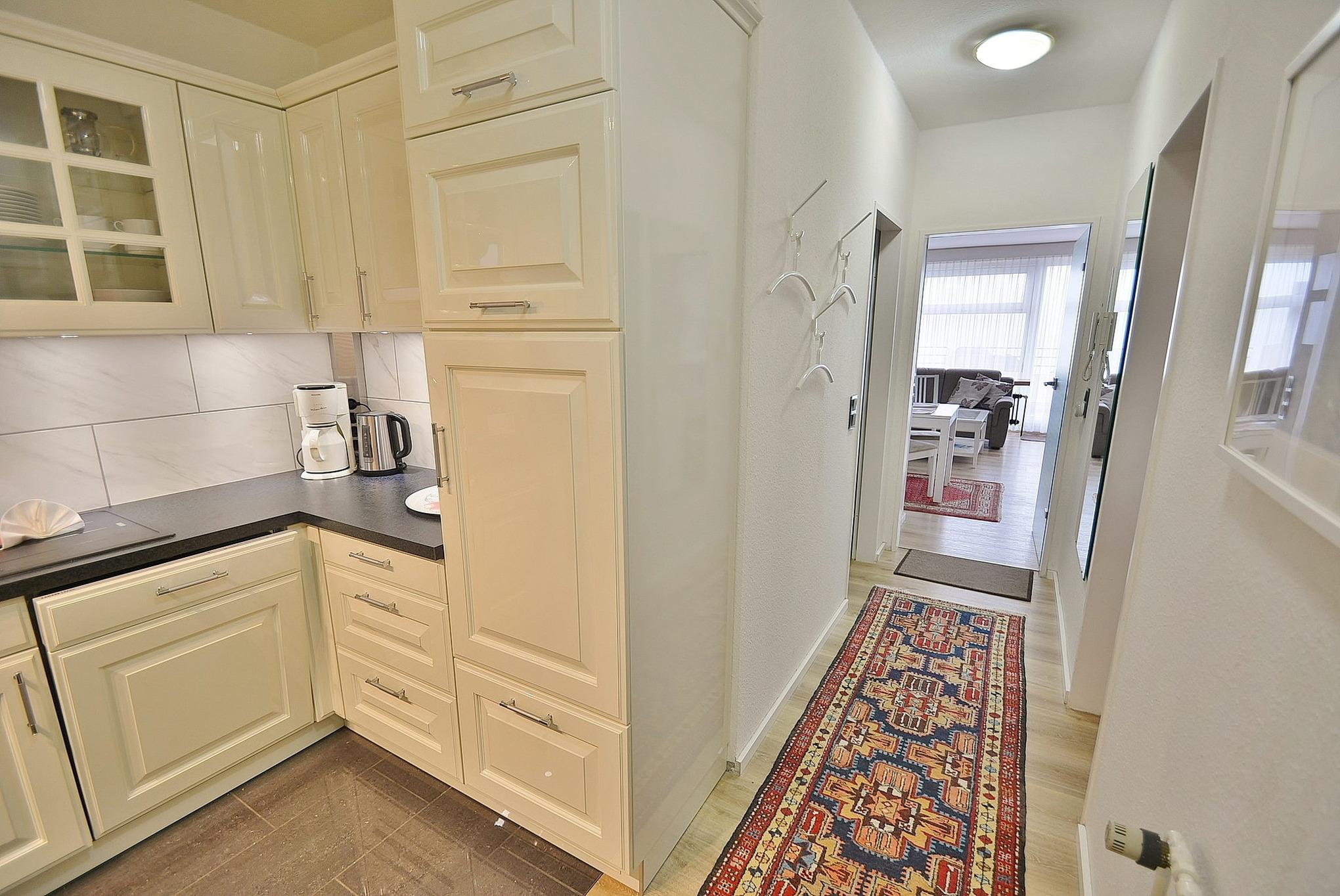 Hochwertige, komplett ausgestattete moderne Küche mit 4 Platten Cerankochfeld, Backofen, Kühlschrank, Gefrierschrank, Spülmaschine und Mikrowelle. Außerdem stehen eine Kaffeemaschine, ein Toaster und ein Wasserkocher zur Verfügung.