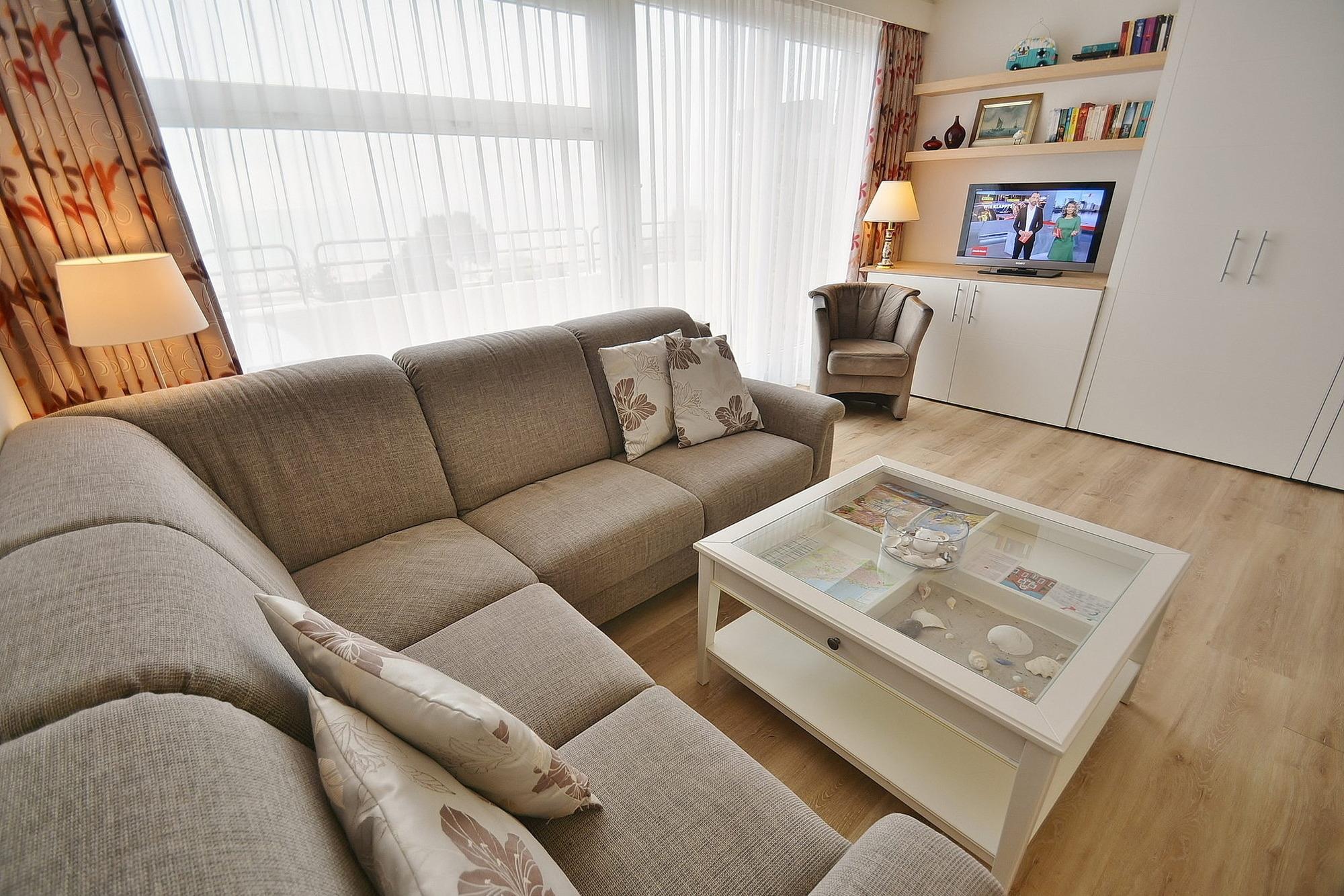Modernes Wohn- und Schlafzimmer mit direktem Zugang zum Balkon mit Meerblick. Der Wohn- und Schlafbereich ist mit einem Schrankbett (2x90x200cm), einer gemütlichen Eckcouch, einem Sessel und einem Esstisch für 4 Personen ausgestattet. Zur Unterhaltung stehen ein Flachbild-TV sowie eine Mini-Stereoanlage zur Verfügung. Die Fenster lassen sich durch einen Vorhang verdunkeln. Der Raum ist mit Laminatboden ausgelegt.