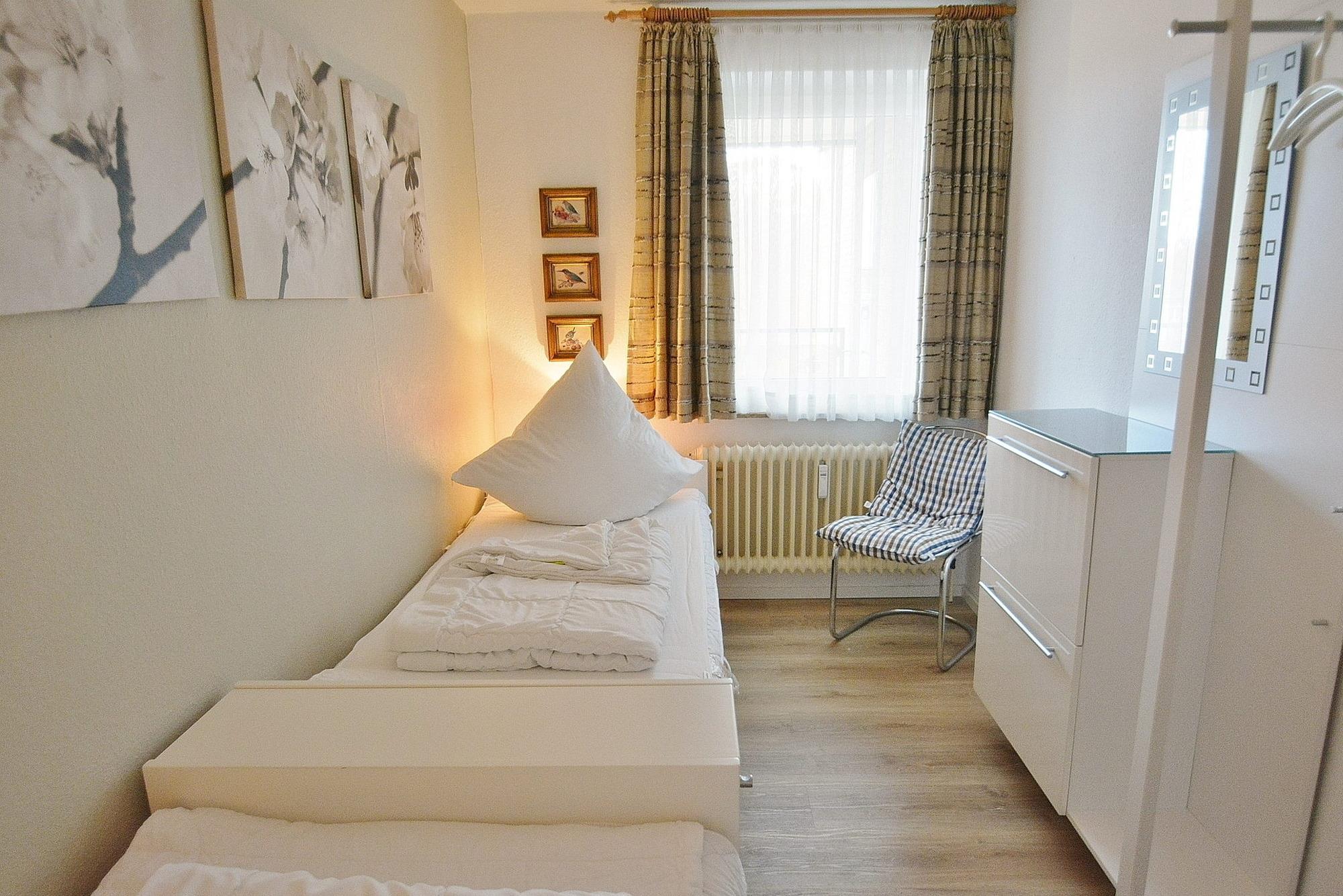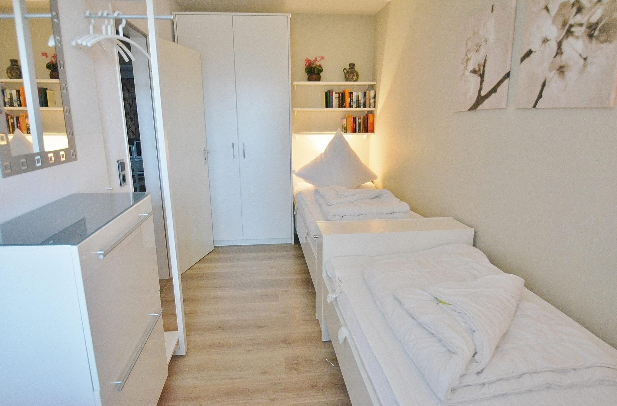 Das kleine, helle Schlafzimmer ist mit 2 getrennten Einzelbetten (je 90x200cm) und einem 2-türigen Kleiderschrank ausgestattet. Das Fenster lässt sich durch Vorhänge verdunkeln. Der Raum ist mit Laminat ausgelegt.