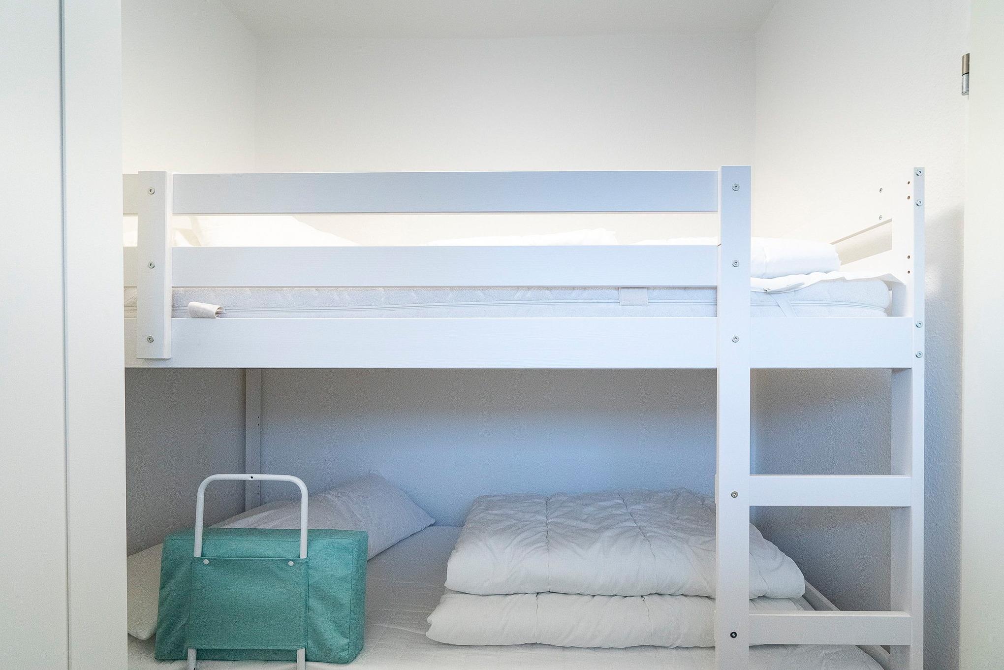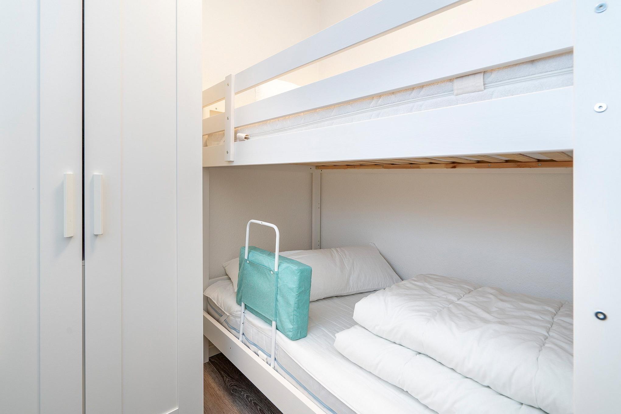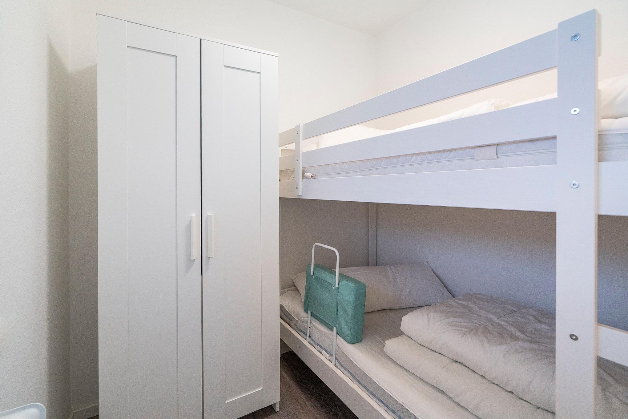 Das Kinderzimmer verfügt über ein Etagenbett (2x90x200 cm), sowie einen kleinen zweitürigen Kleiderschrank. Der Raum ist mit Vinylboden verlegt und das Fenster ist mit einem blickdichten Plissee versehen.