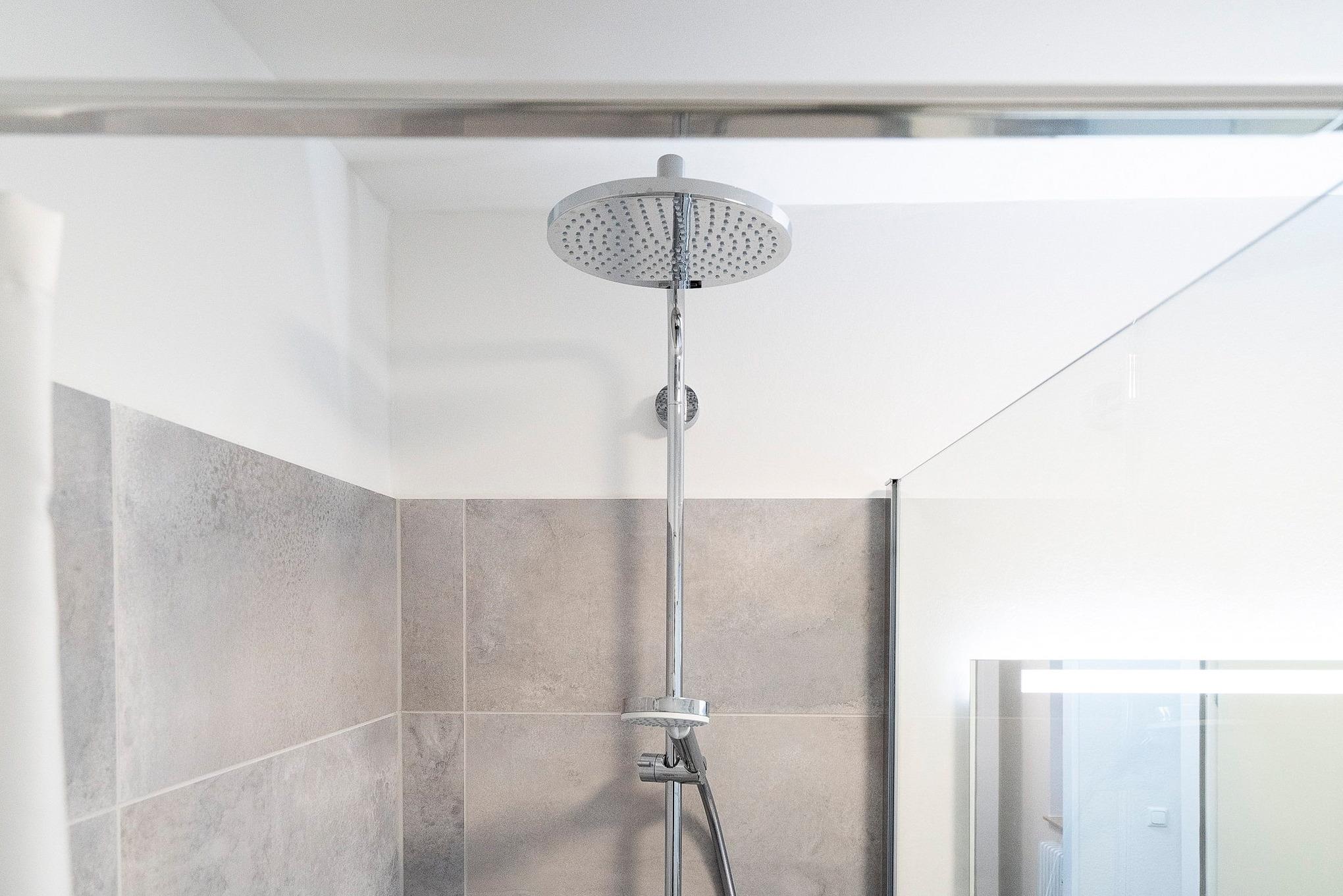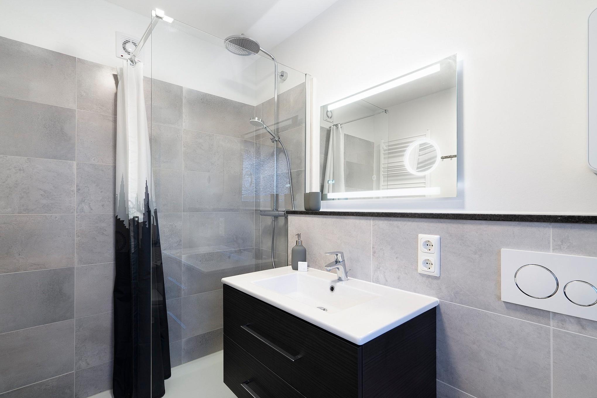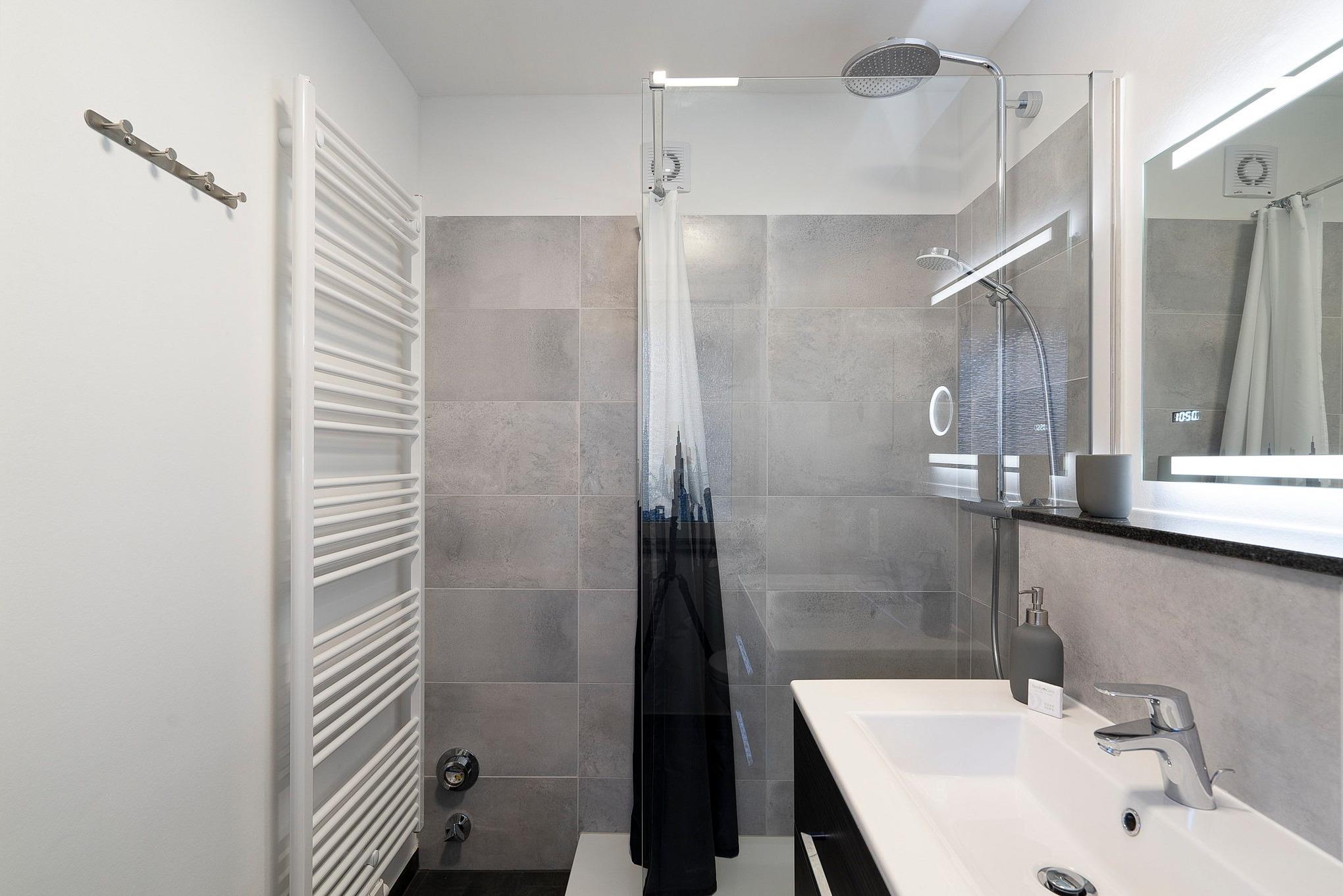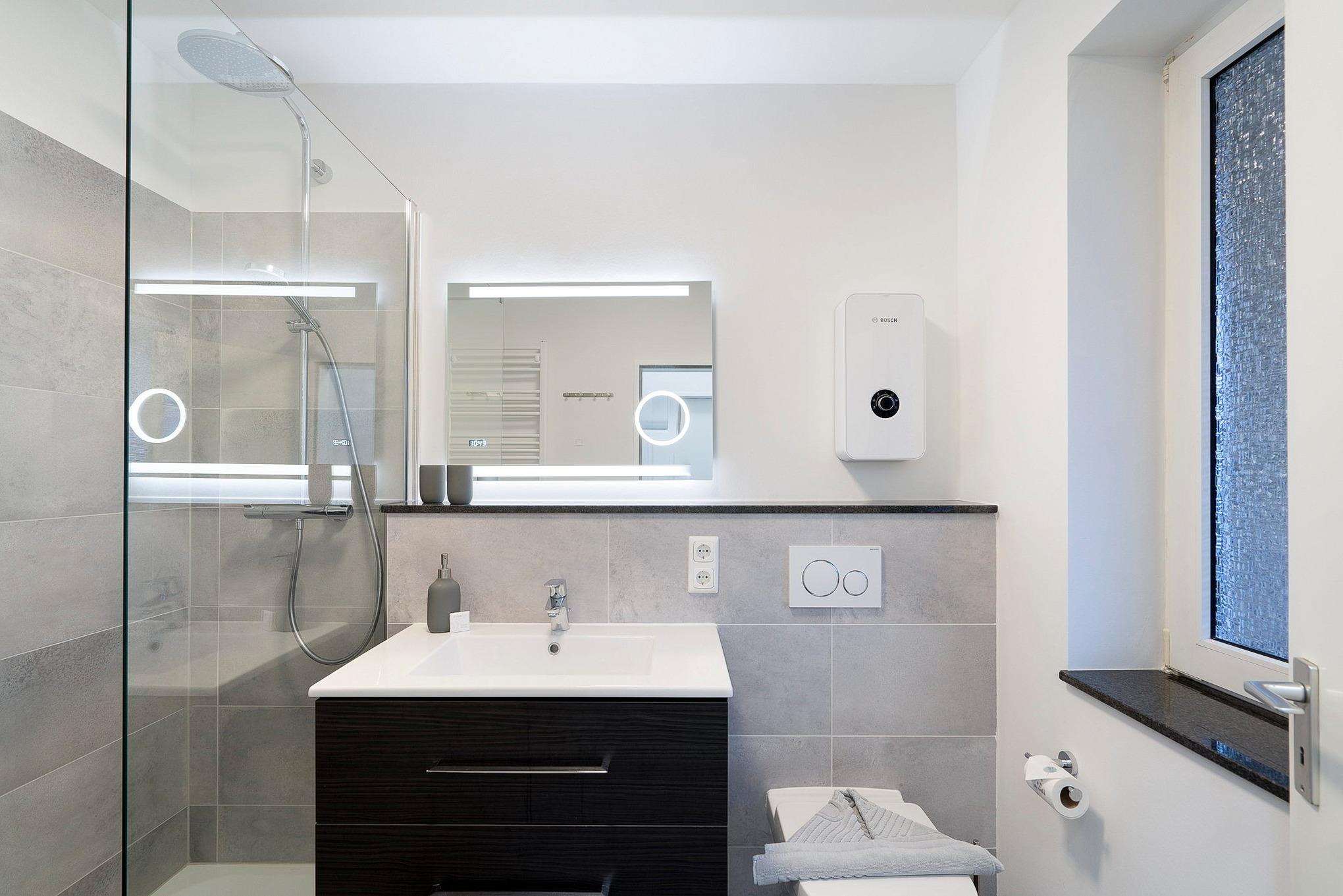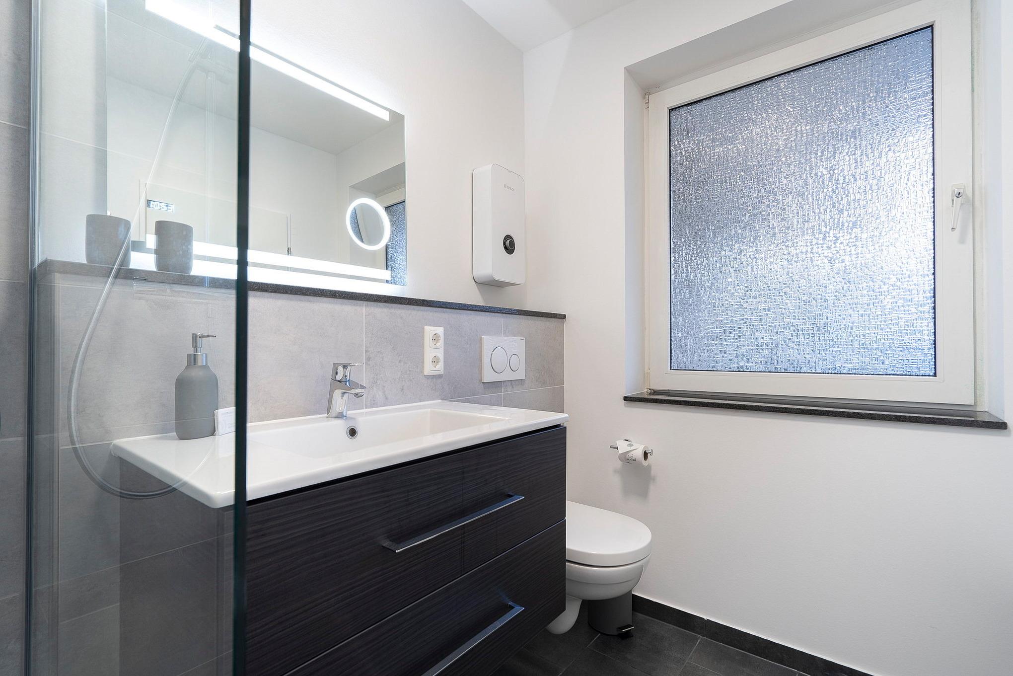 Freundlich helles Badezimmer mit Dusche, WC und Waschbecken.