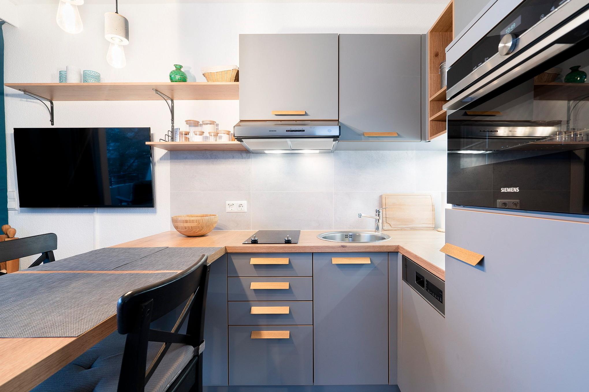 Zum Wohnzimmer gibt es eine offene Küchenzeile mit 2-Platten-Cerankochfeld, Spülmaschine, Backofen und Kühlschrank mit kleinem Gefrierfach. Ebenso stehen eine Kaffeemaschine und ein Wasserkocher zur Verfügung.