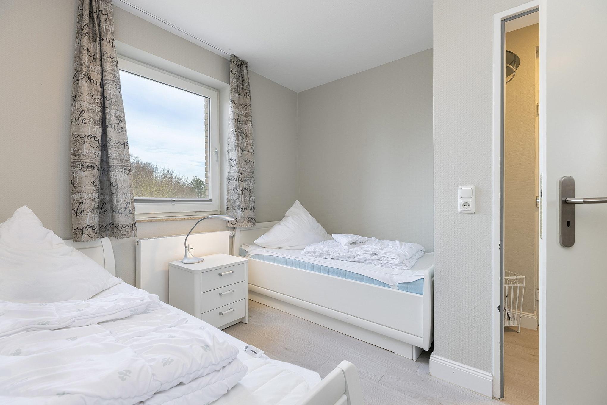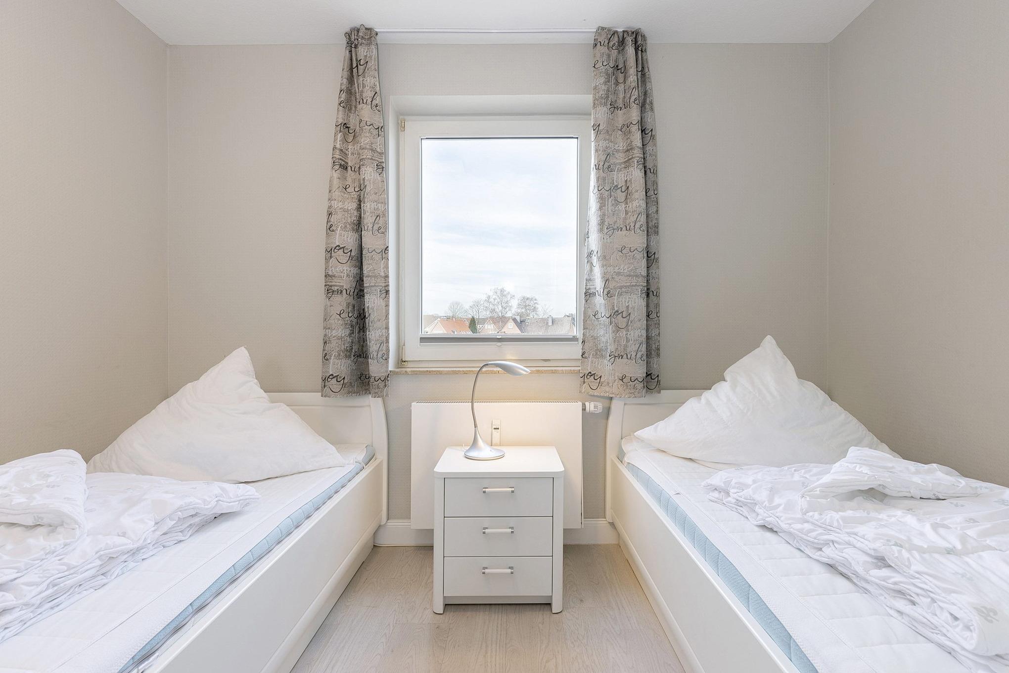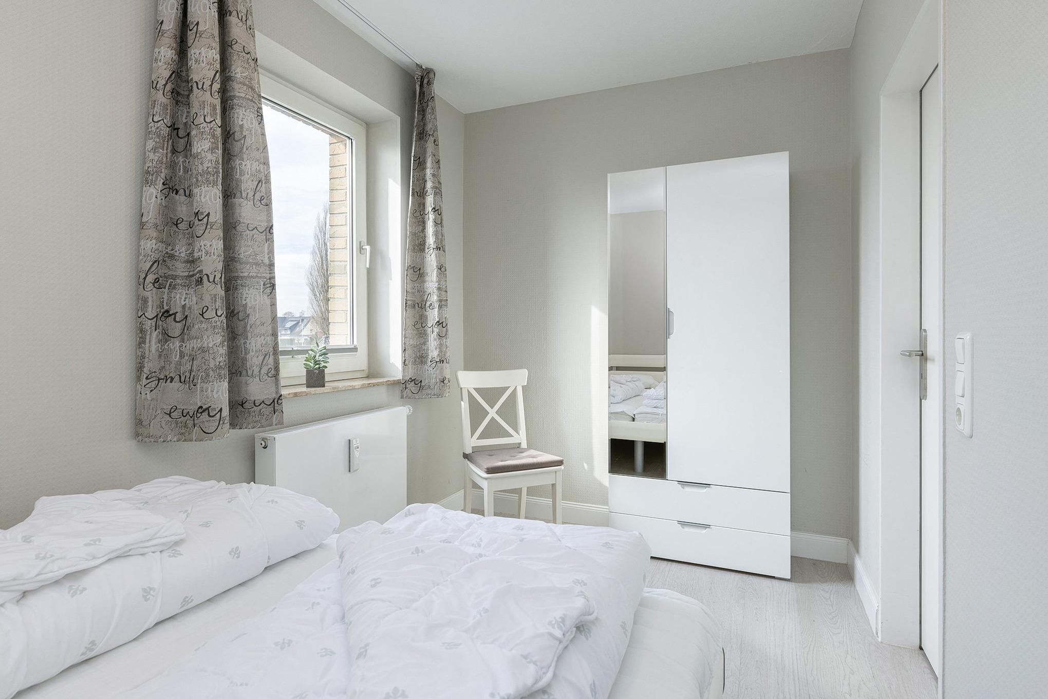 Das separate Kinderzimmer ist mit 2 Einzelbetten, einem großen Kleiderschrank sowie einem Nachttisch ausgestattet. Das Fenster lässt sich durch einen Vorhang und einem Plissee etwas verdunkeln. Das Kinderzimmer ist mit Laminat ausgelegt.