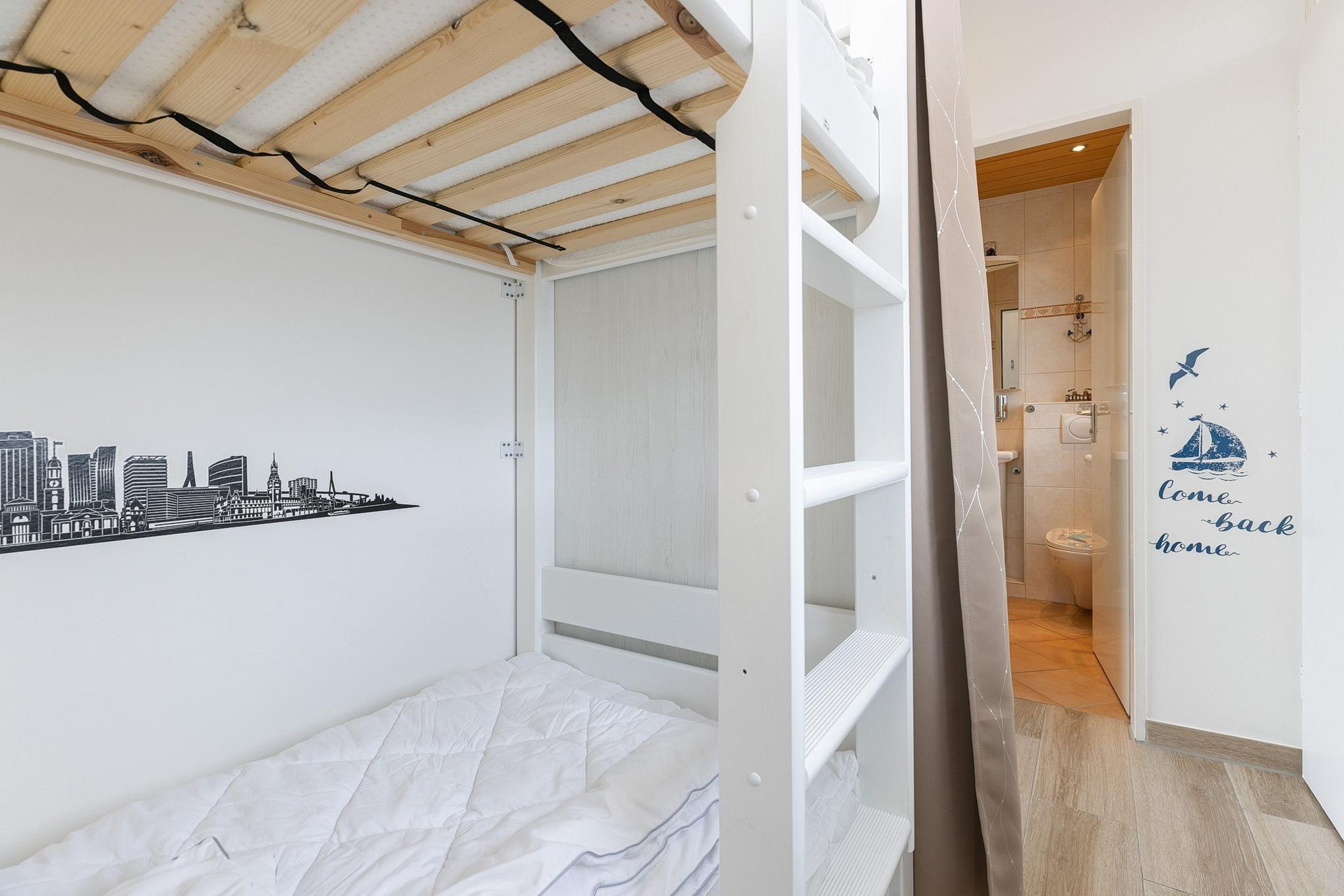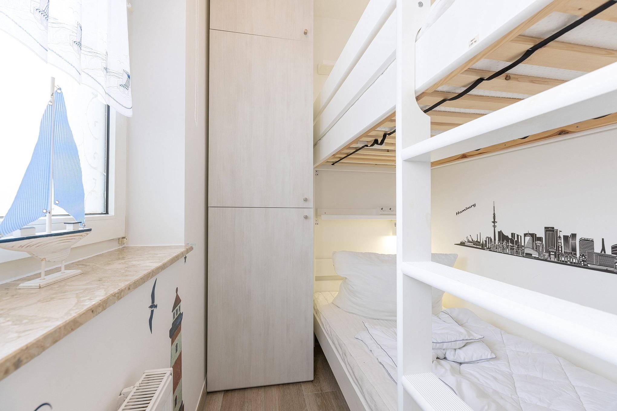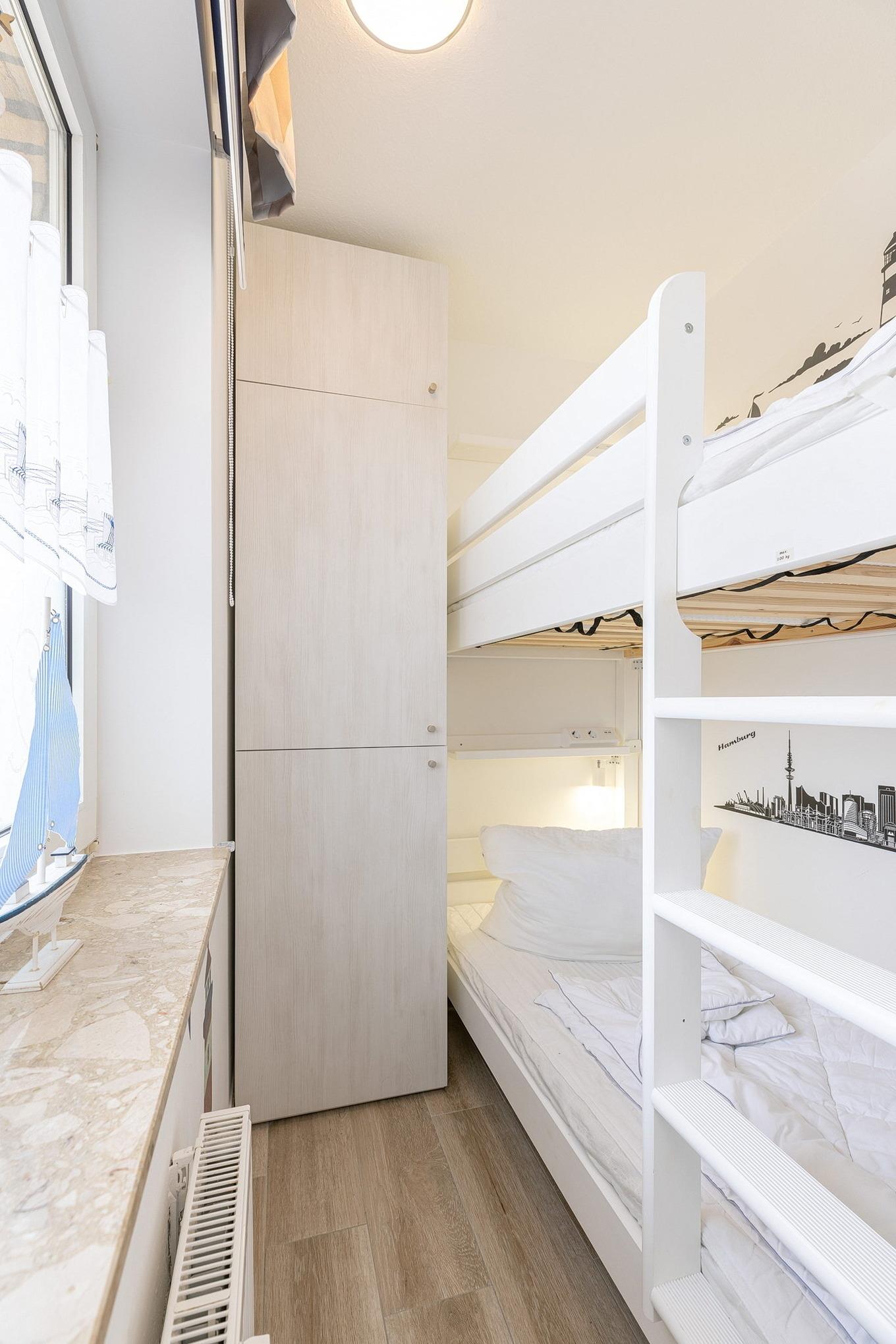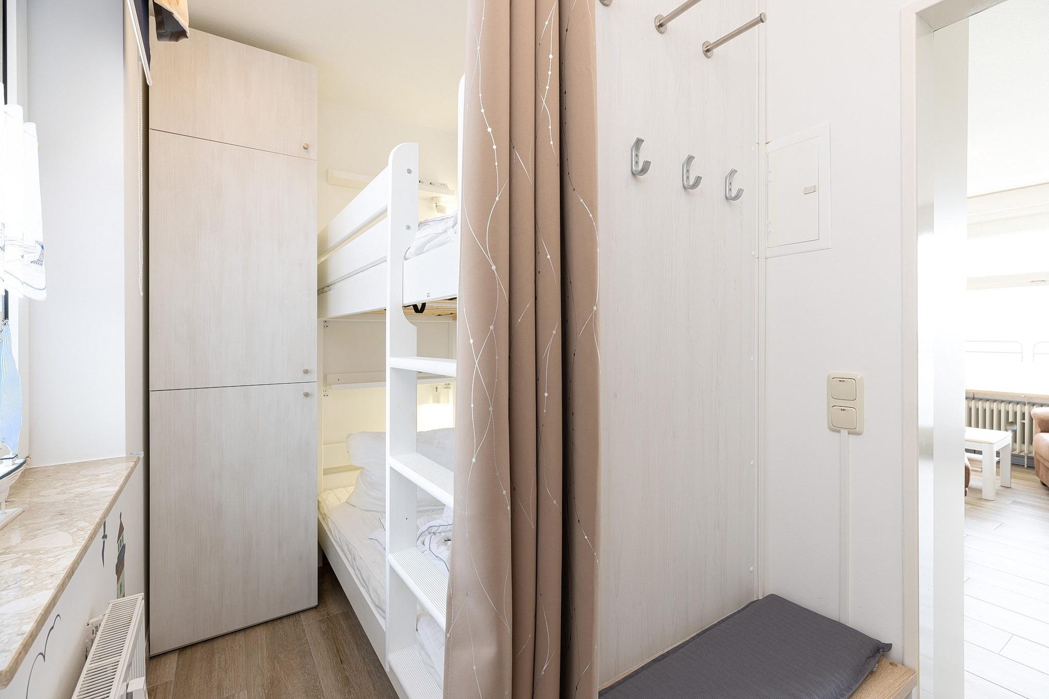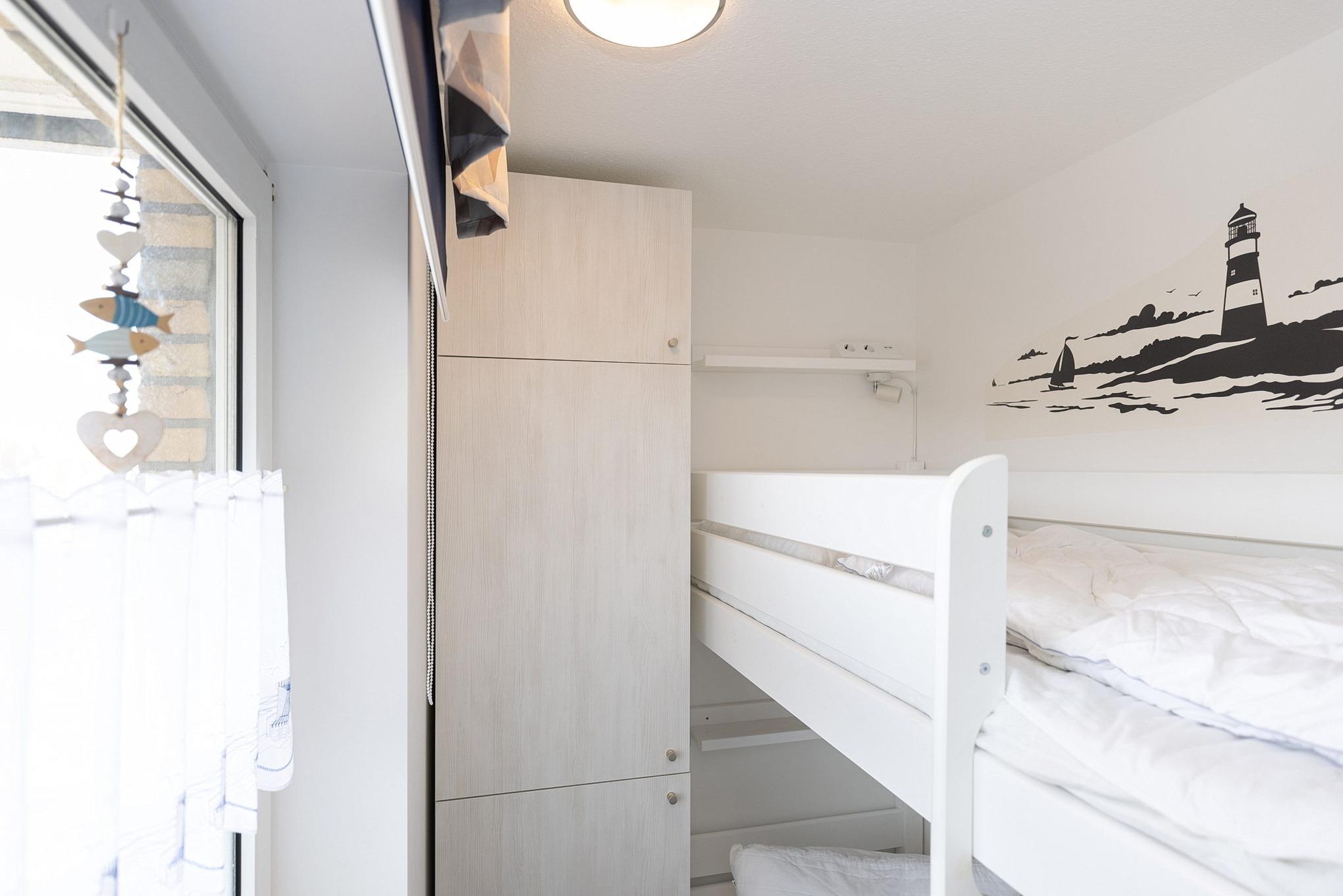 Das Kinderzimmer verfügt über ein Etagenbett (2x80x190cm) sowie einen kleinen eintürigen Kleiderschrank. Der Raum ist gefliest und lässt sich durch ein Rollo verdunkeln.