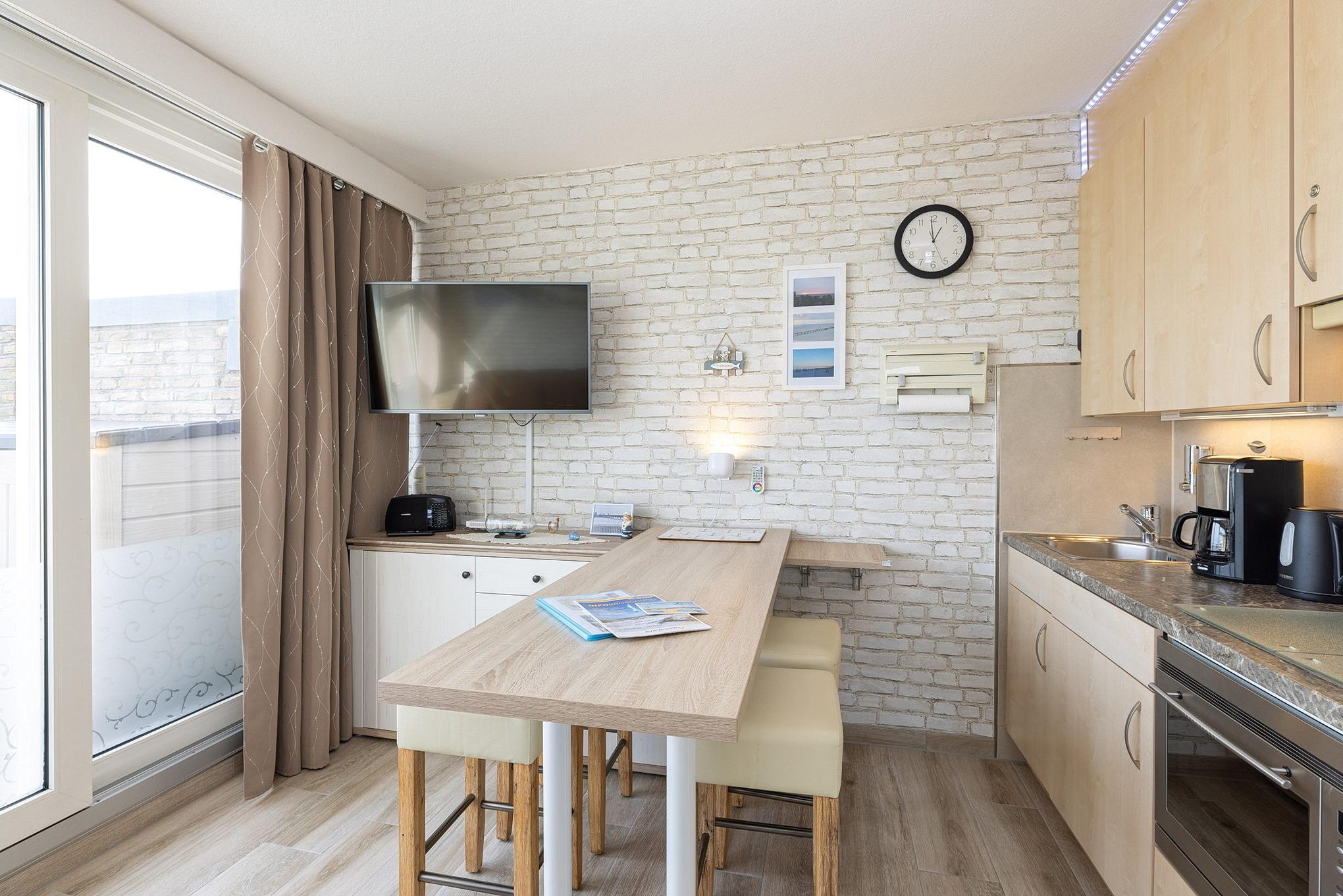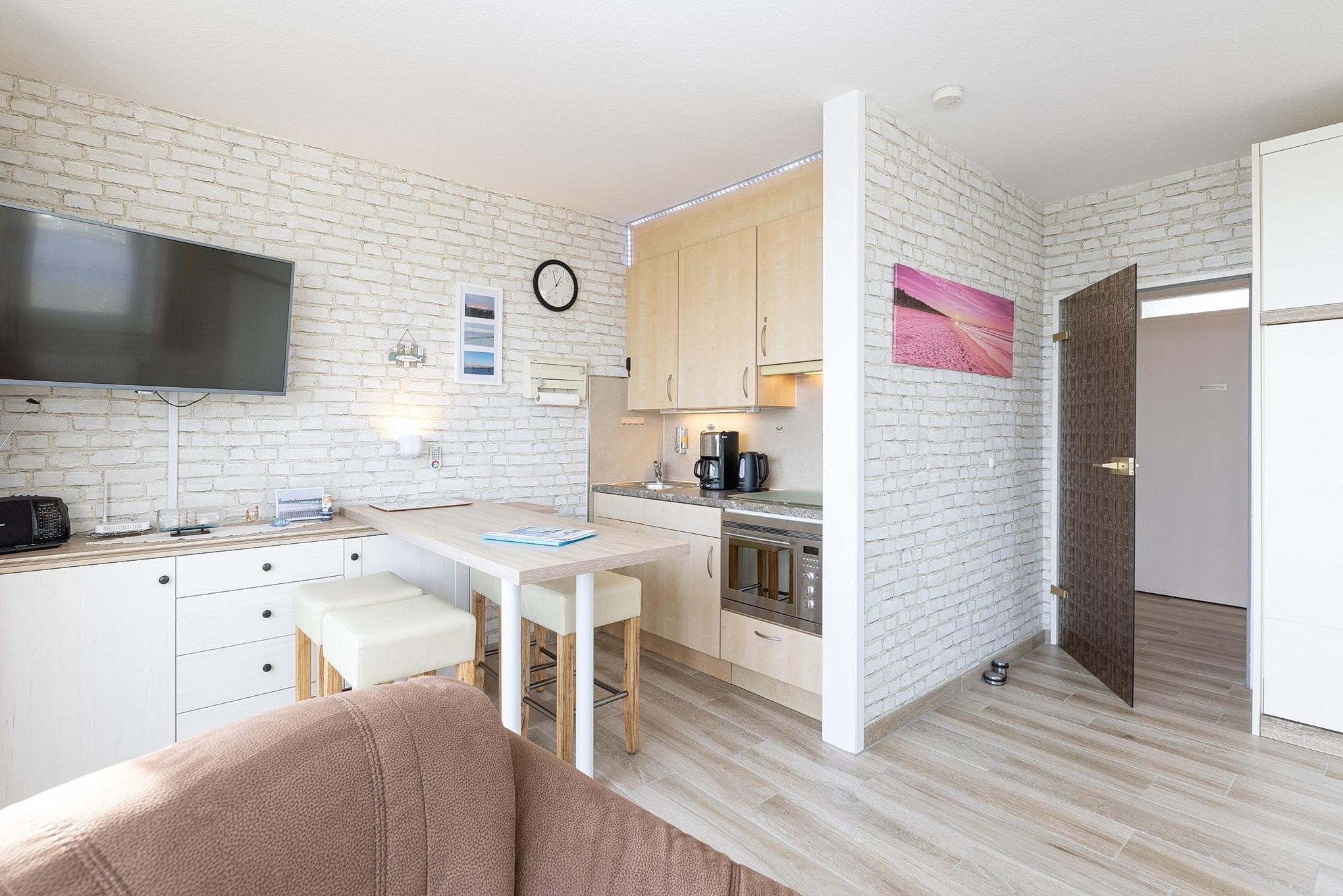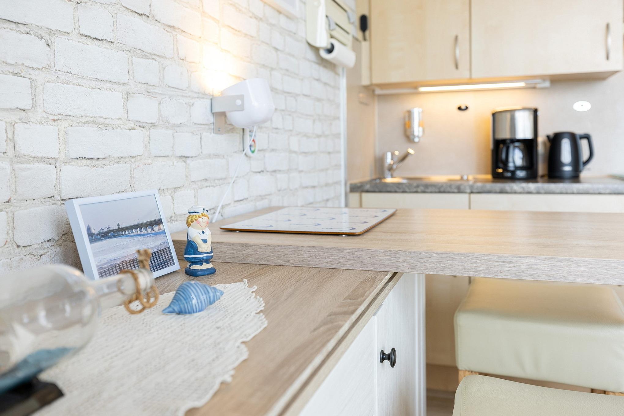 Zum Wohnzimmer offene Küchenzeile mit 4-Platten-Cerankochfeld, Mikrowelle mit Backofenfunktion und Kühlschrank mit kleinem Gefrierfach. Ebenso stehen eine Kaffeemaschine, ein Wasserkocher und ein Toaster zur Verfügung.