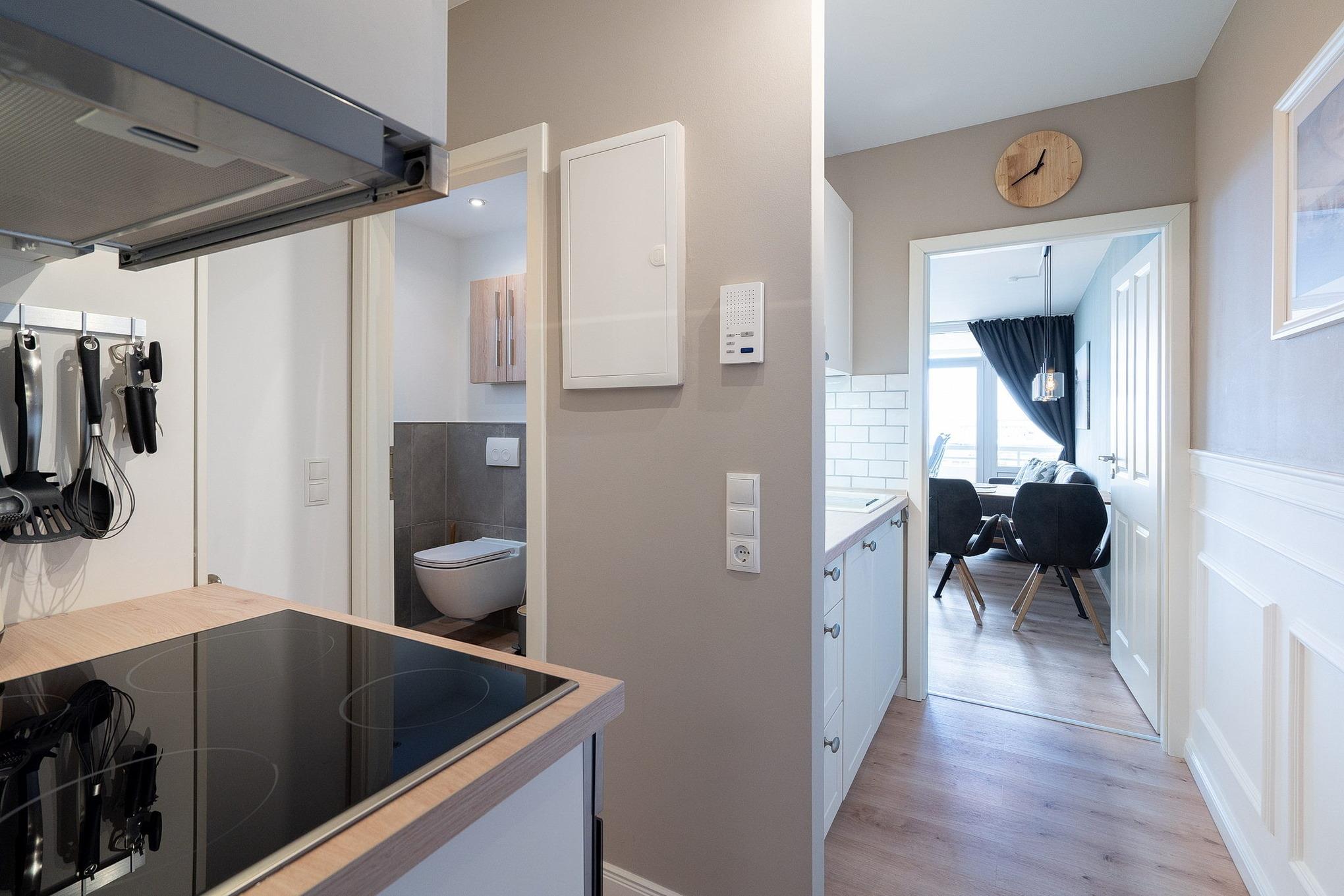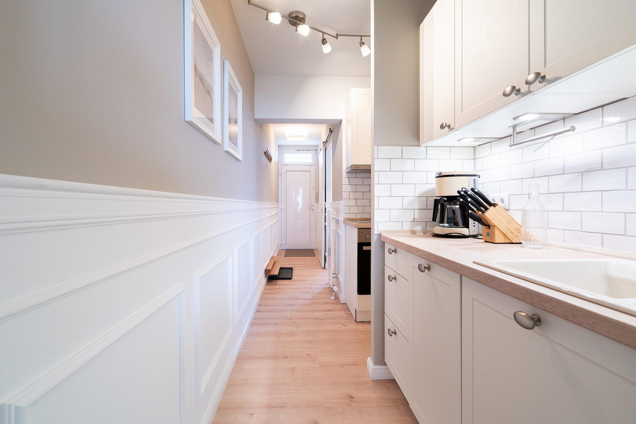 Moderne, Pantry-Küche im Flur. Die Küche ist mit einem 4-Platten Cerankochfeld, einem Backofen, einer Spülmaschine, einem Kühlschrank mit Gefrierschrank (2 Schubladen), einer Kaffeemaschine, einem Toaster und einem Wasserkocher ausgestattet.