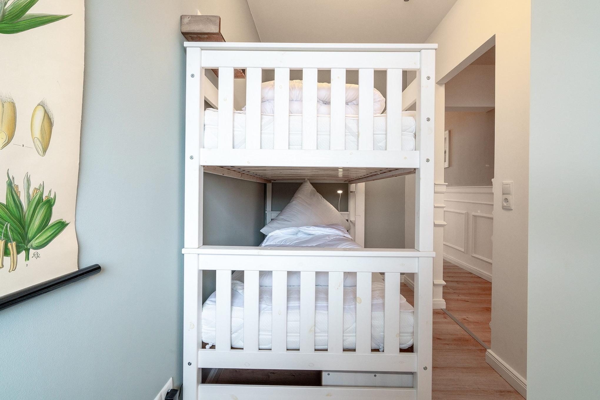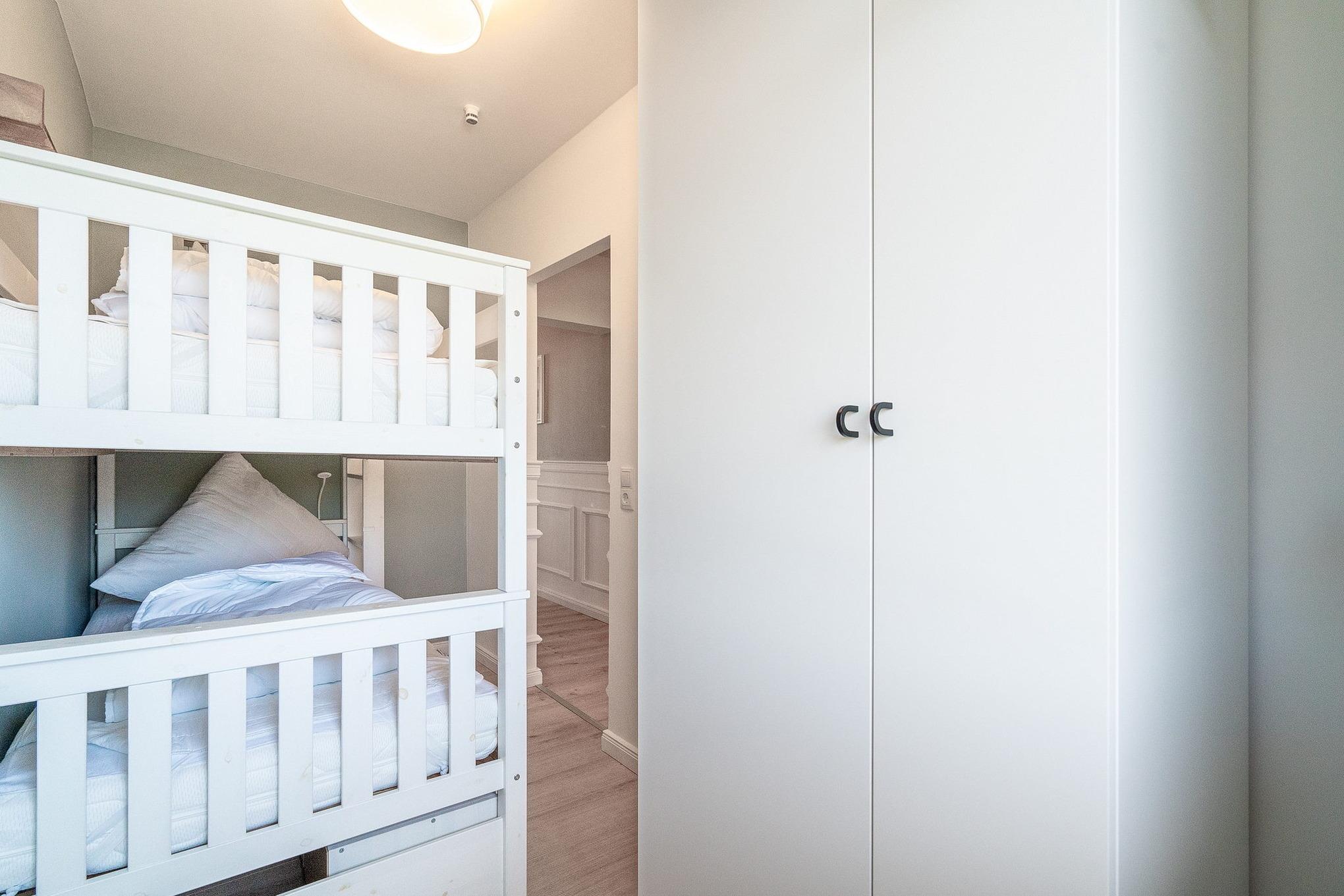 Kleines separates Zimmer mit Etagenbett ( je 90x200cm), kleiner Schrank, Designerfußboden in Holzoptik und Fenster zum Laubengang.