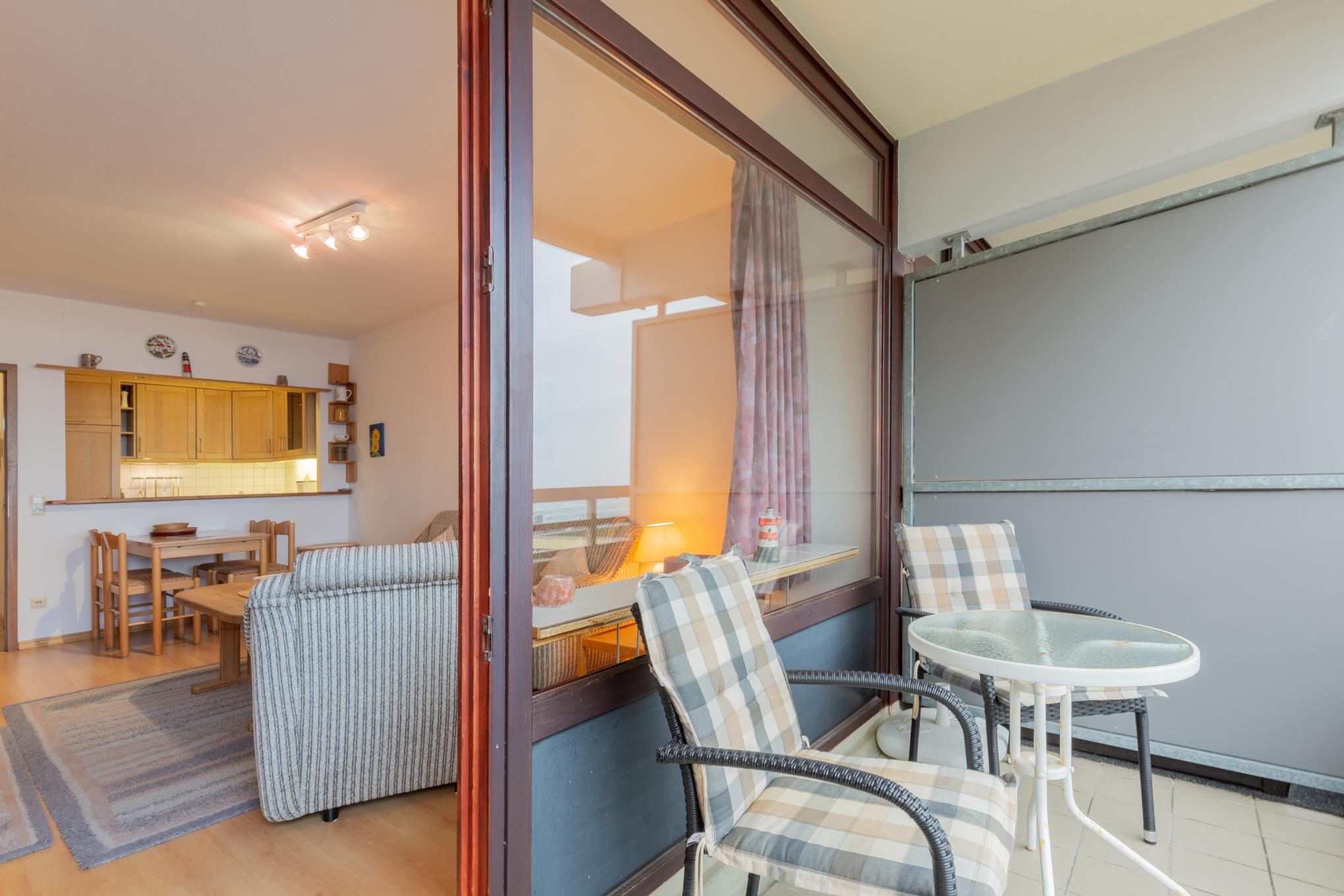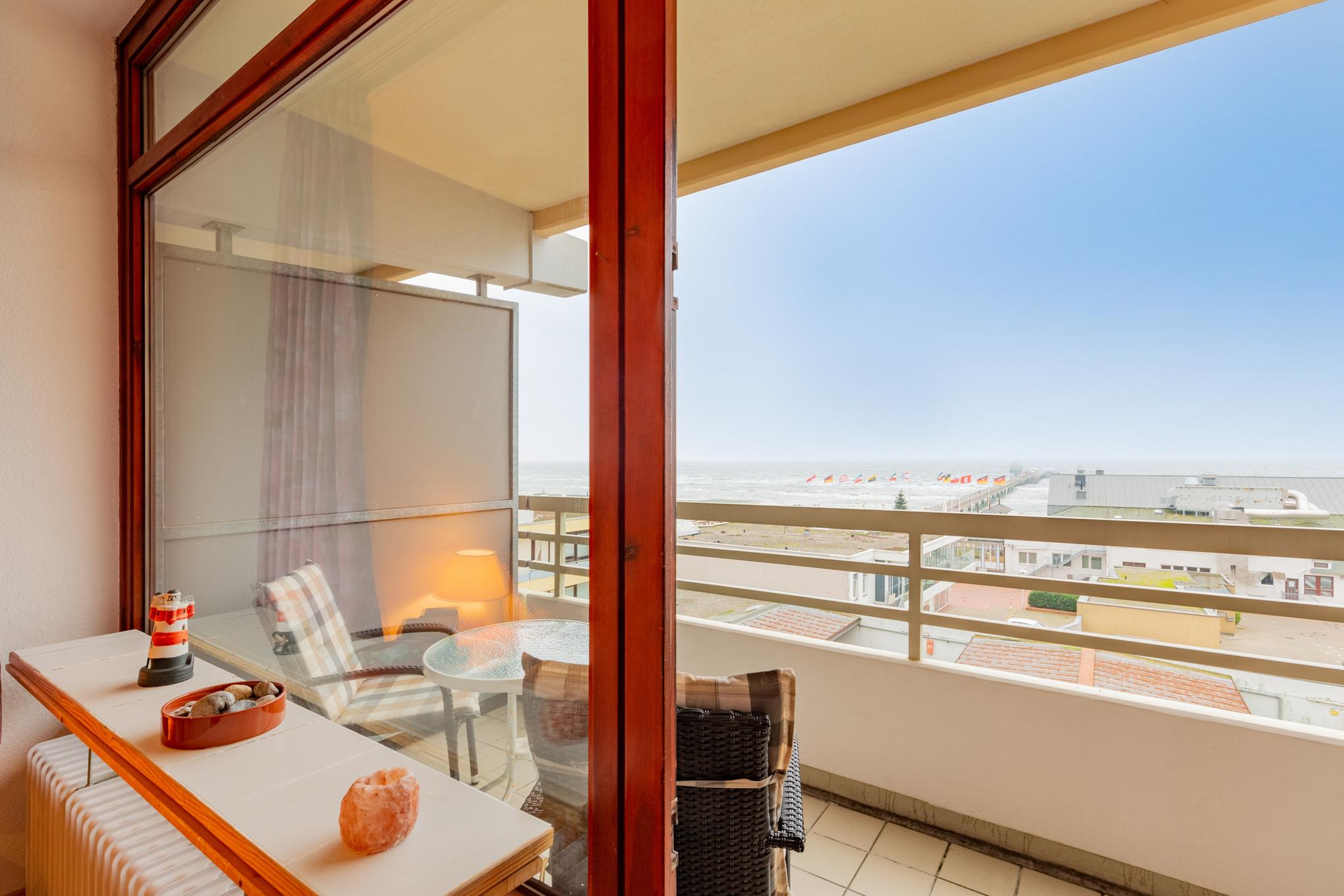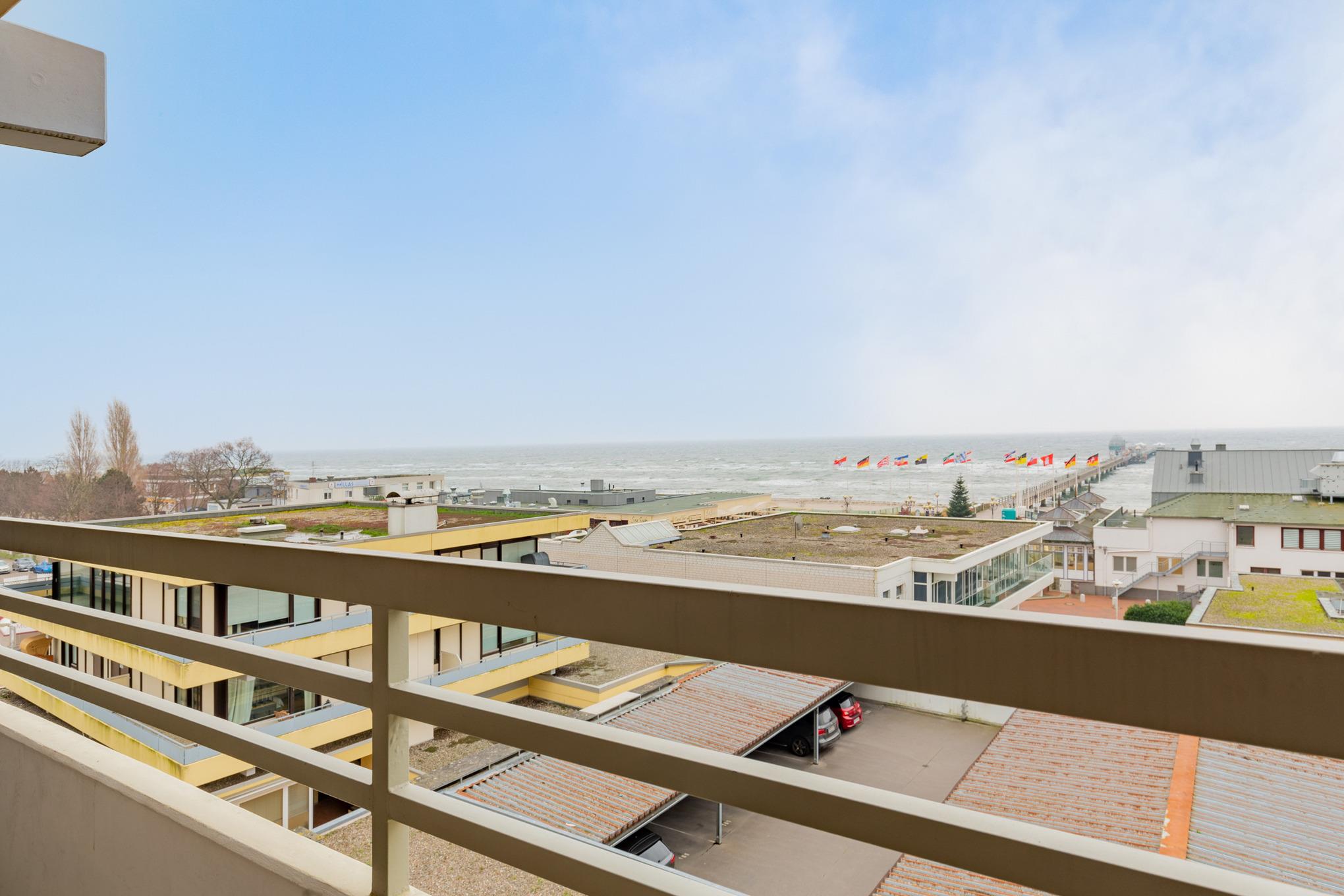 Balkon in südliche Richtung mit Seeblick und Blick auf die Seebrücke. Eigener PKW-Stellplatz (max. Höhe 1,90m), Waschmaschine und Trockner gegen Gebühr.
