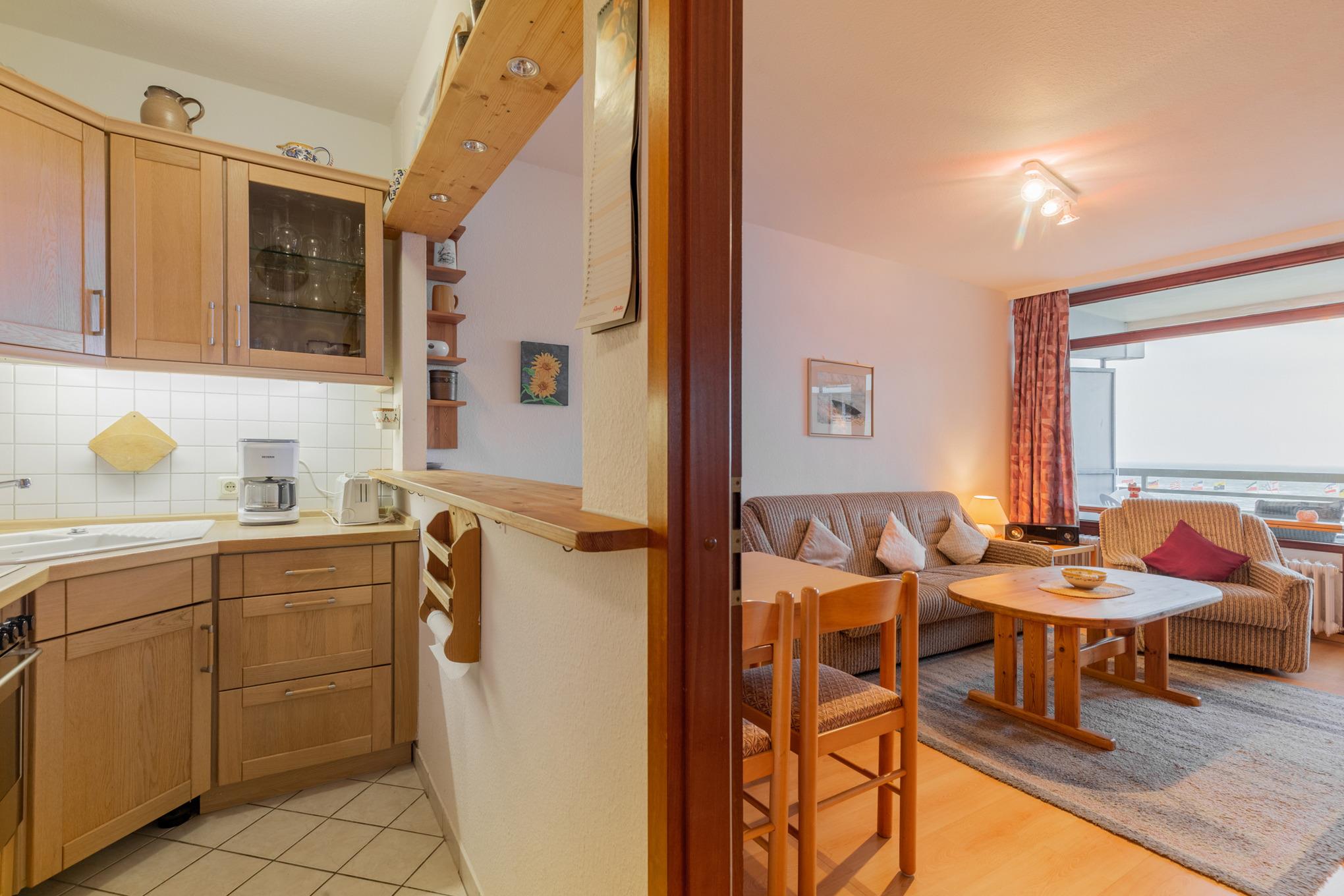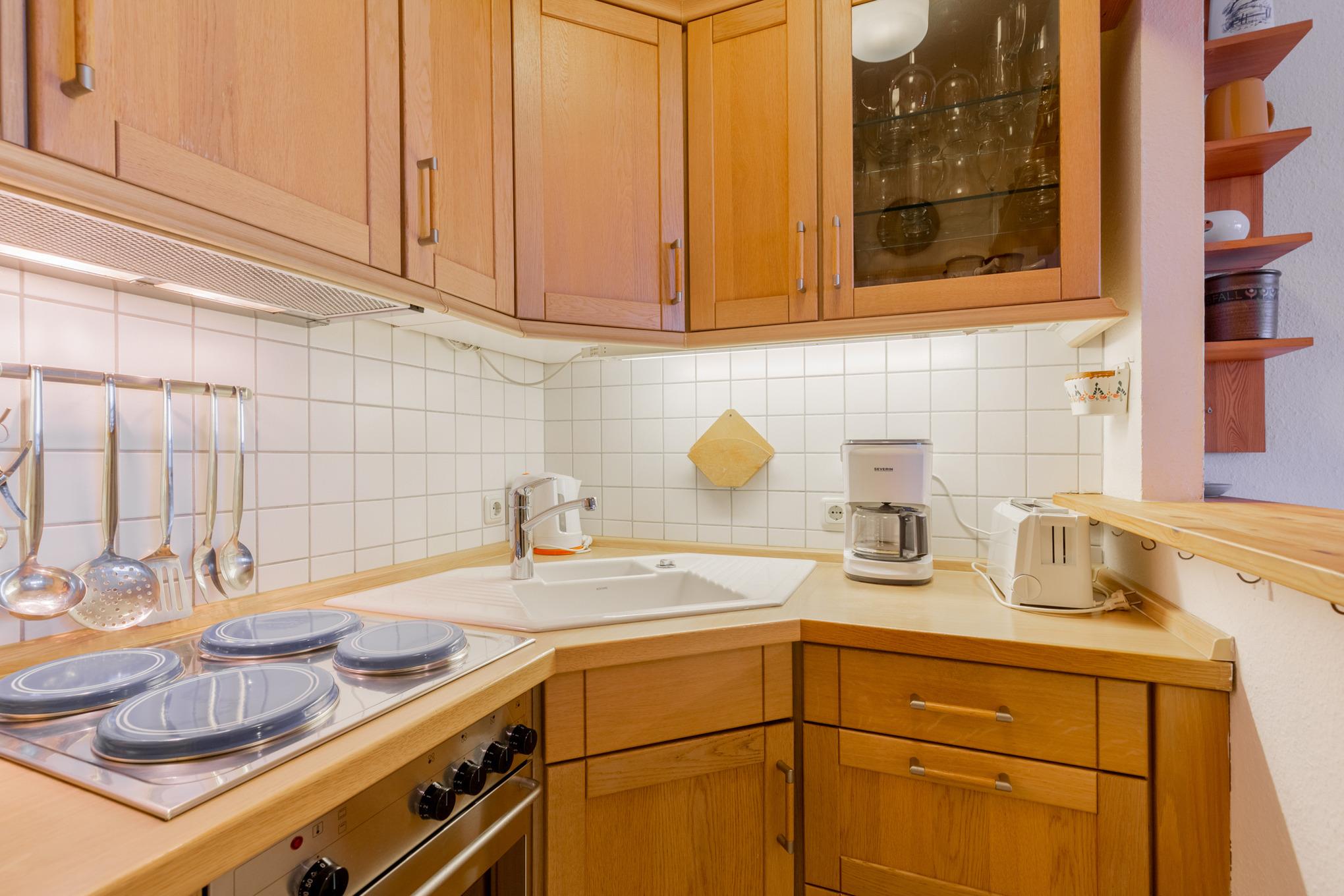 Komplett ausgestattete, zum Wohn- und Esszimmer offen Küche mit 4-Platten E-Herd, Backofen, Kühlschrank mit kleinem 3-Sterne Gefrierfach, Kaffeemaschine, Toaster, Wasserkocher und Eierkocher.