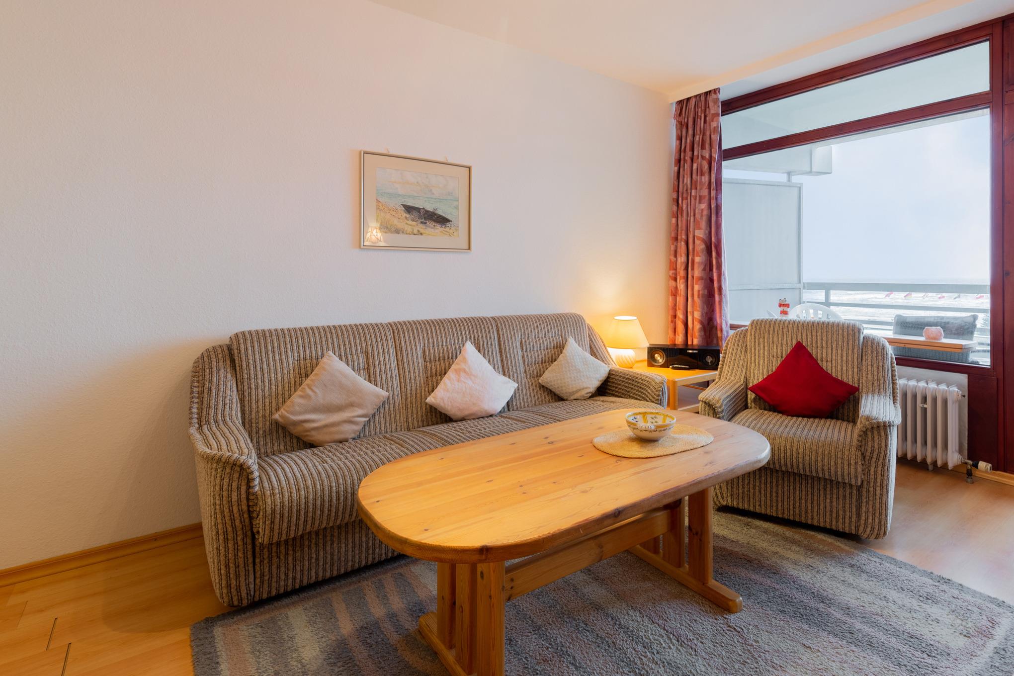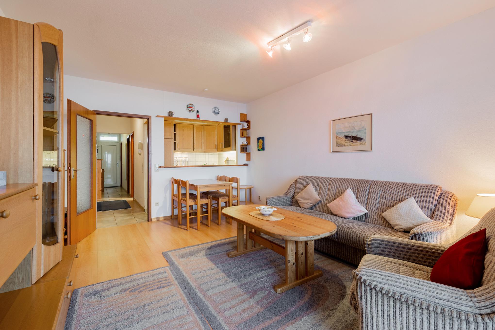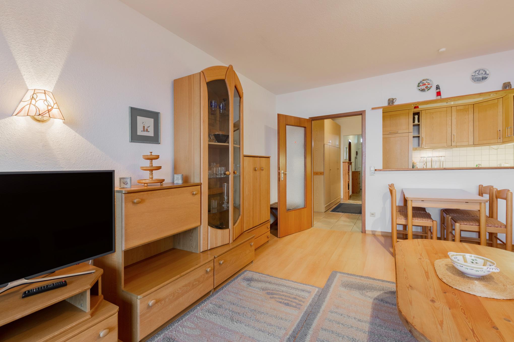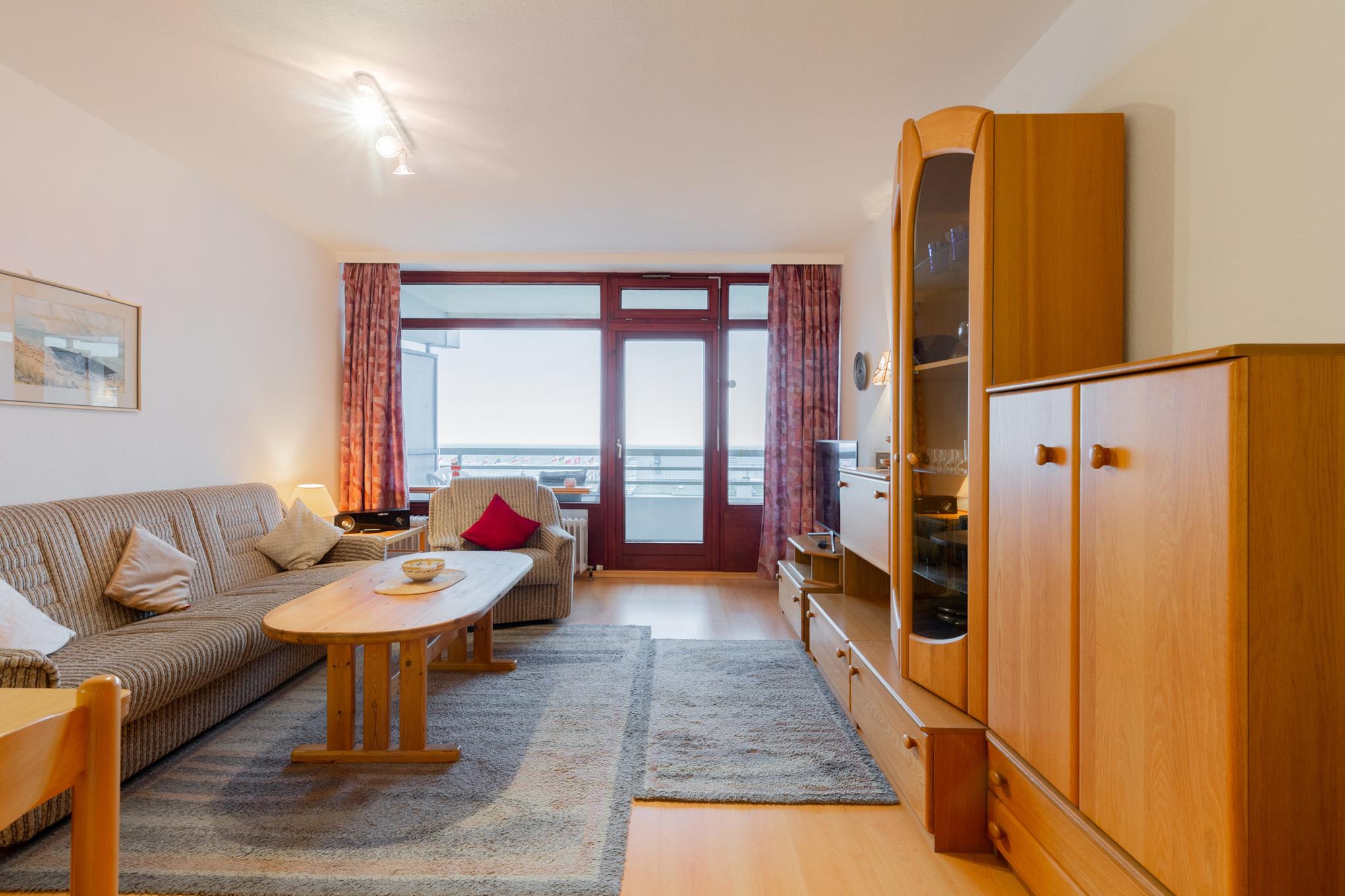 Helles, freundliches Wohn- und Esszimmer mit direktem Zugang zum Balkon. Das Wohn- und Esszimmer ist mit einem Essplatz für 4 Personen, einer Schlafcouch (110x180cm), einem Sessel, einem Couchtisch und einem Wohnzimmerschrank ausgestattet. Zur Unterhaltung stehen ein Fernseher und ein Radio zur Verfügung. Der Boden ist mit Laminat ausgelegt.