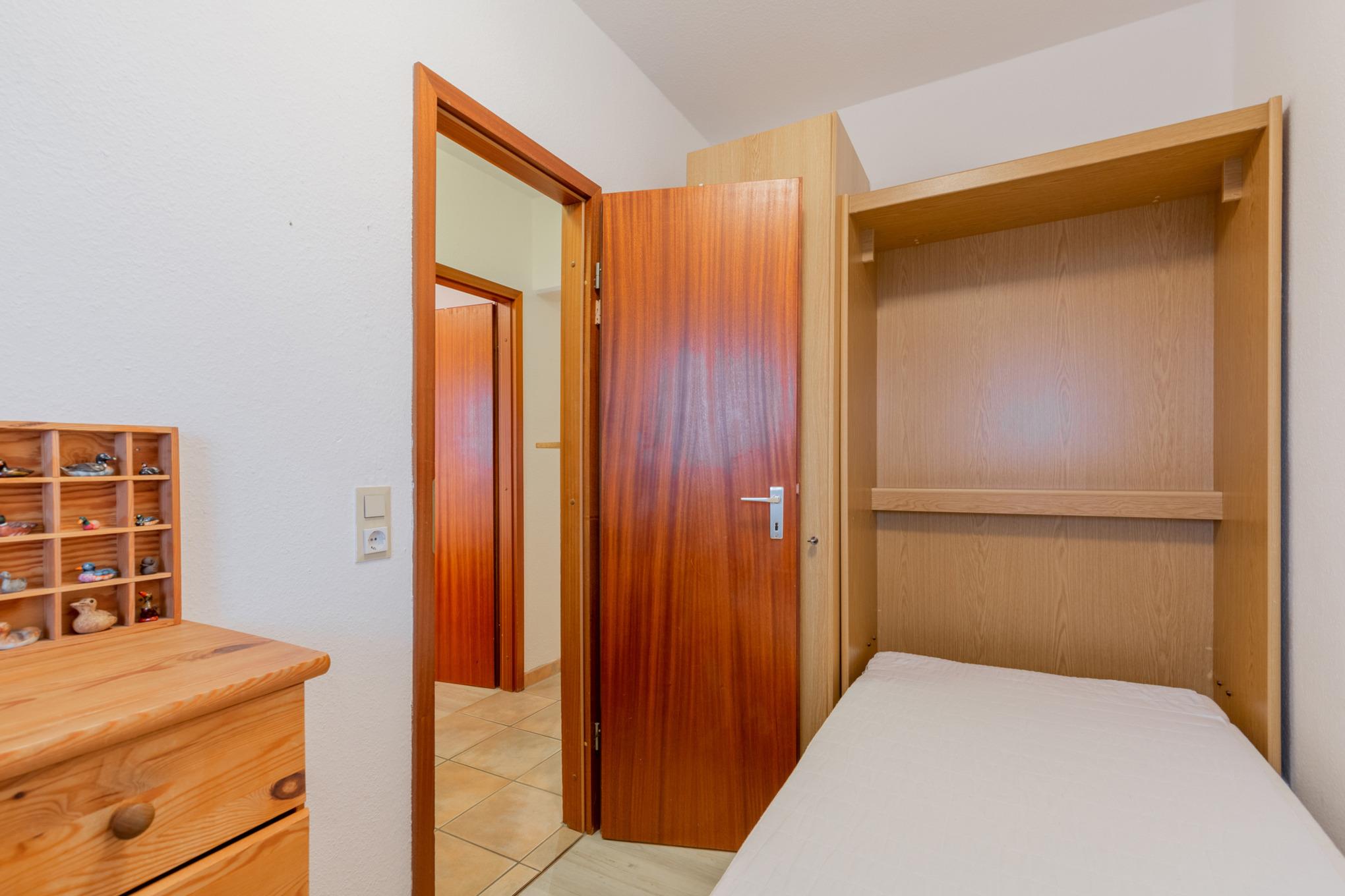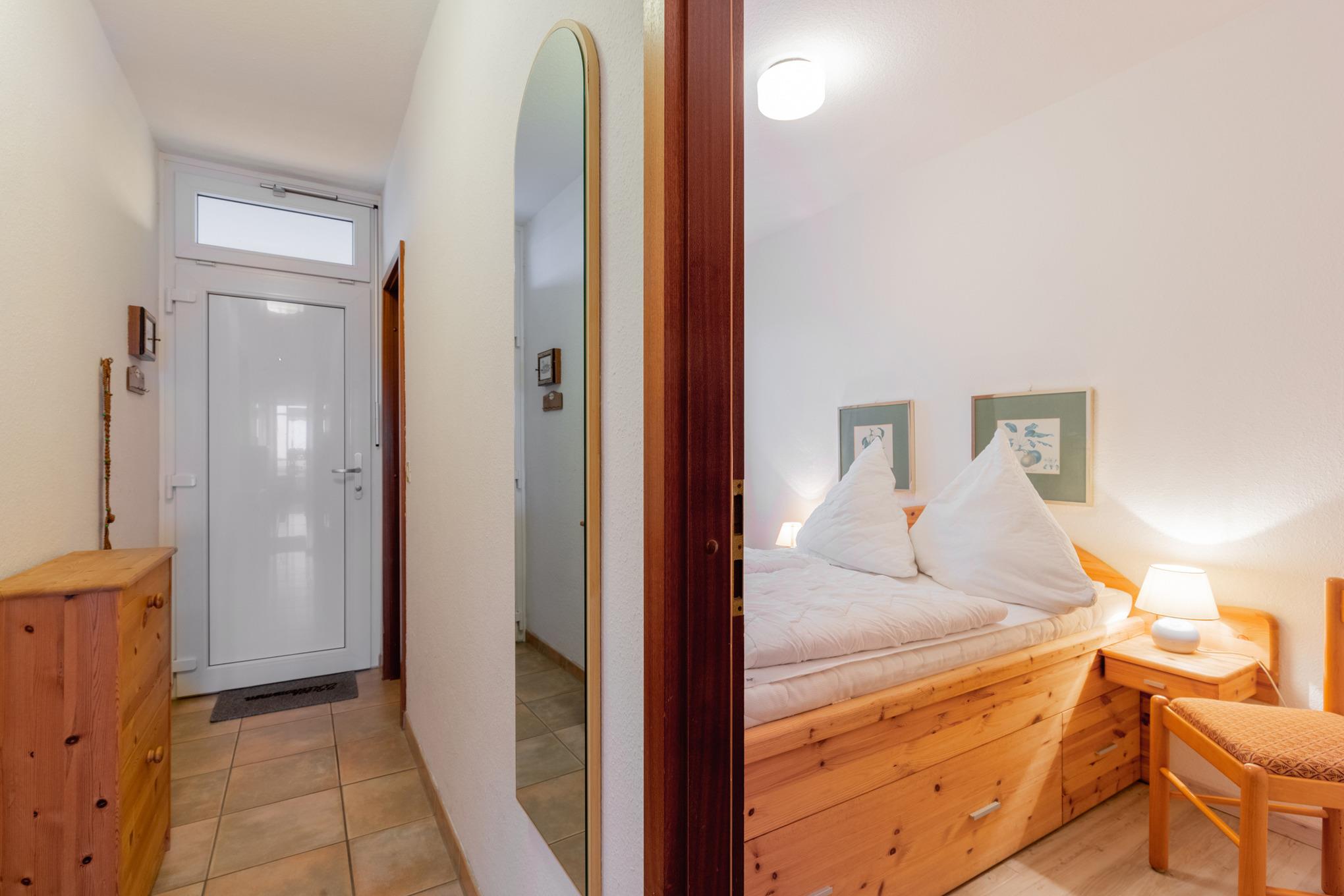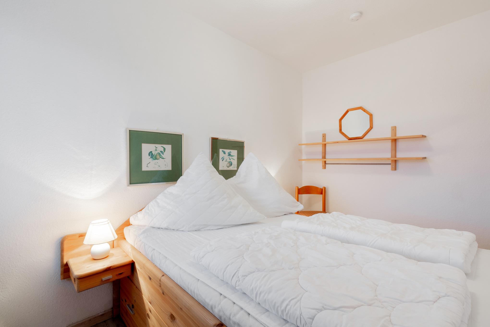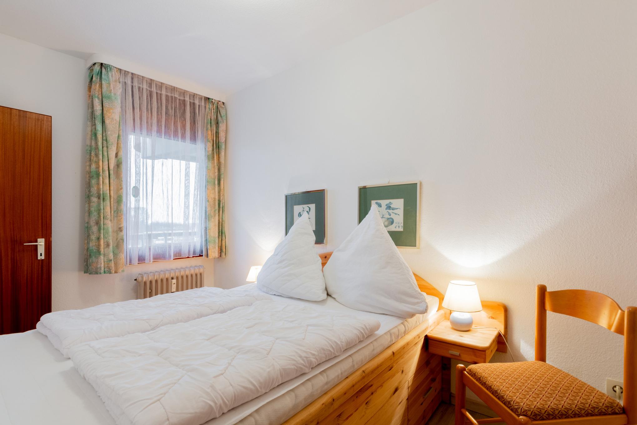 Das Schlafzimmer ist mit einem Doppelbett (140 x 200cm) und 2 Nachttischen ausgestattet. Ein Kleiderschrank befindet sich im Flur der Wohnung. Das Fenster zum Laubengang lässt sich durch einen Vorhang und ein Innenrollo verdunkeln. Das Zimmer ist mit Laminat ausgelegt.