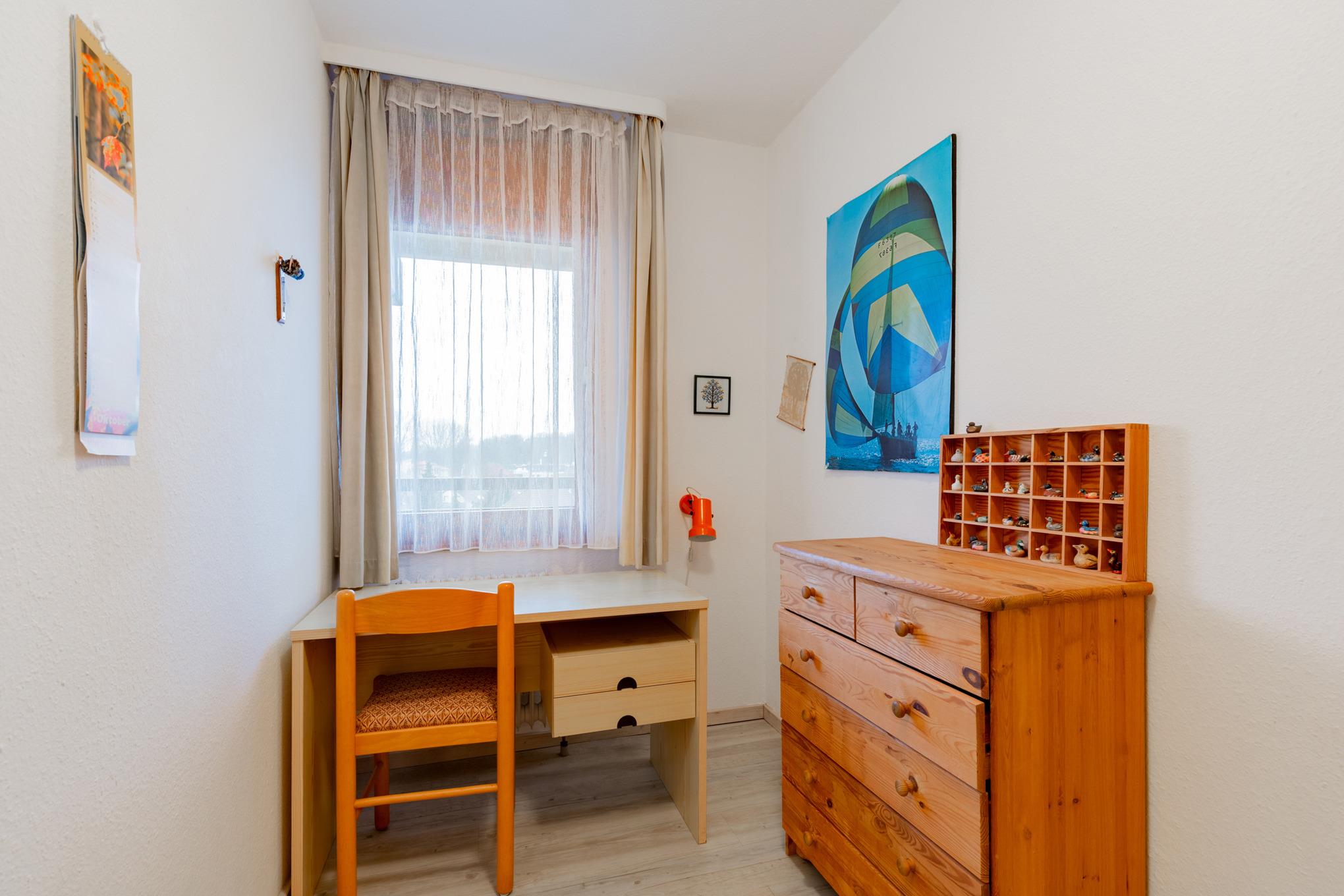 Separates Zimmer mit einem Schrankbett (90x190cm), einem kleinen Kleiderschrank, einem Schreibtisch, einem Stuhl und einer Kommode. Das Zimmer ist mit Laminat ausgelegt. Das Fenster zum Laubengang lässt sich durch einen Vorhang und ein Innenrollo verdunkeln.