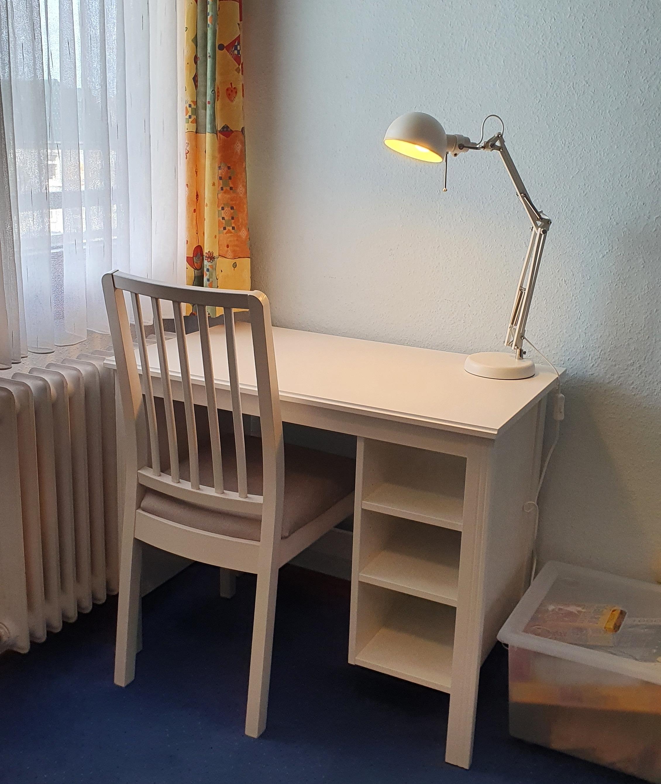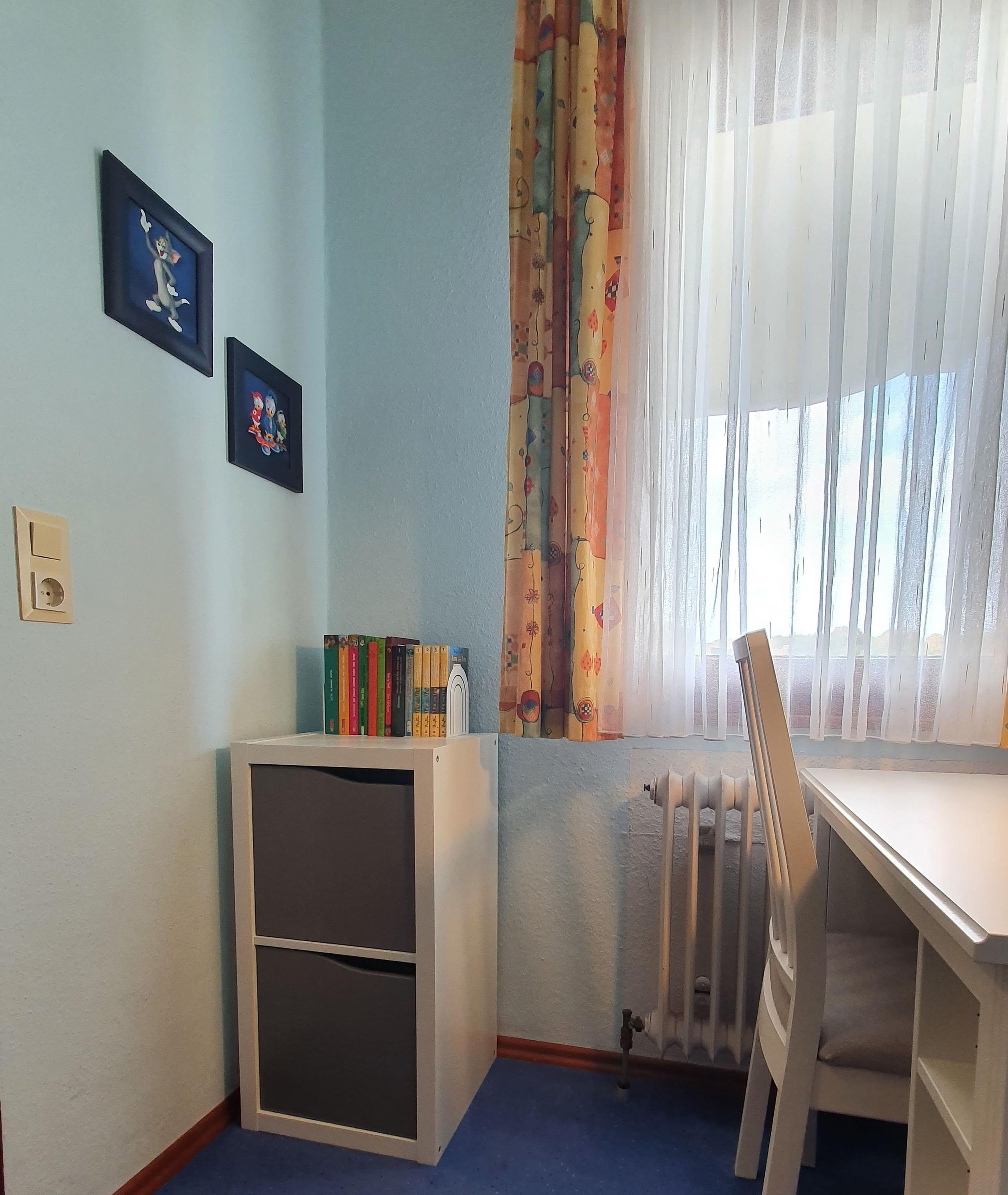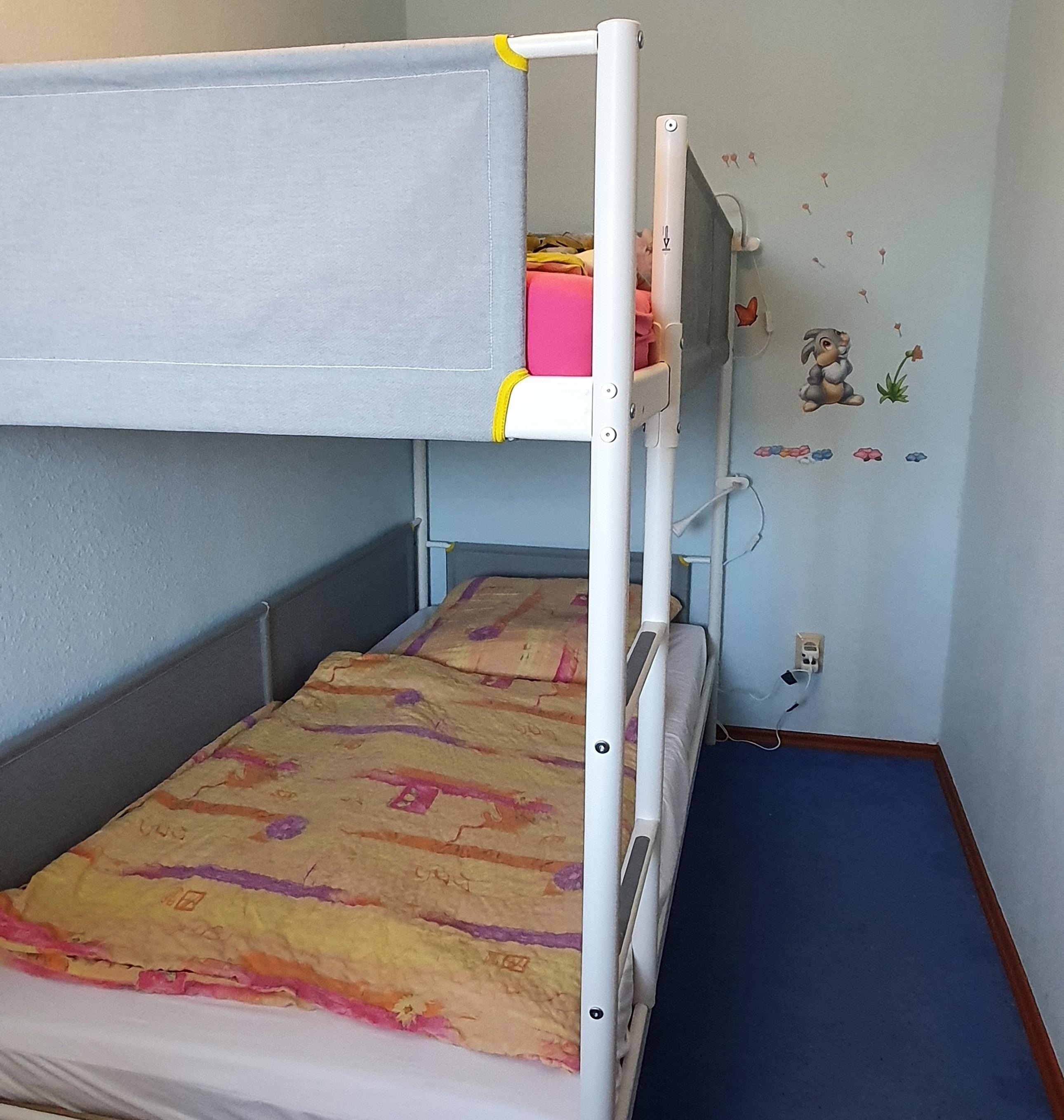 Das kleine Kinderzimmer ist mit Laminatboden ausgelegt und mit einem Etagenbett (2x90x190cm) und einem kleinen Schreibtisch ausgestattet. Das Zimmer lässt sich durch Vorhänge verdunkeln.