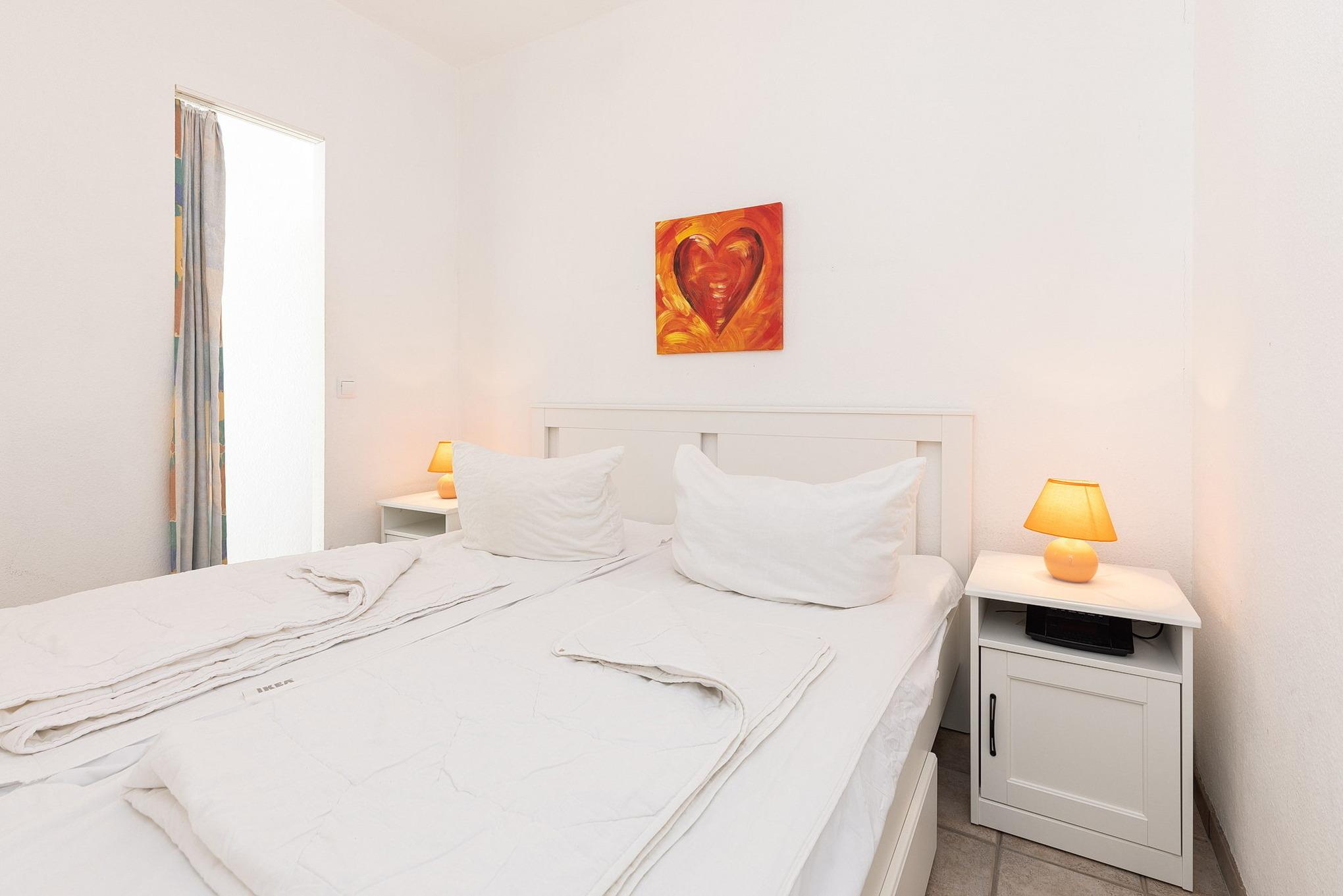Der Schlafbereich verfügt über ein Doppelbett (2x80x200cm). Der Bereich ist durch Vorhangtüren vom Wohnbereich abgetrennt. Ein Kleiderschrank befindet sich im Flur.