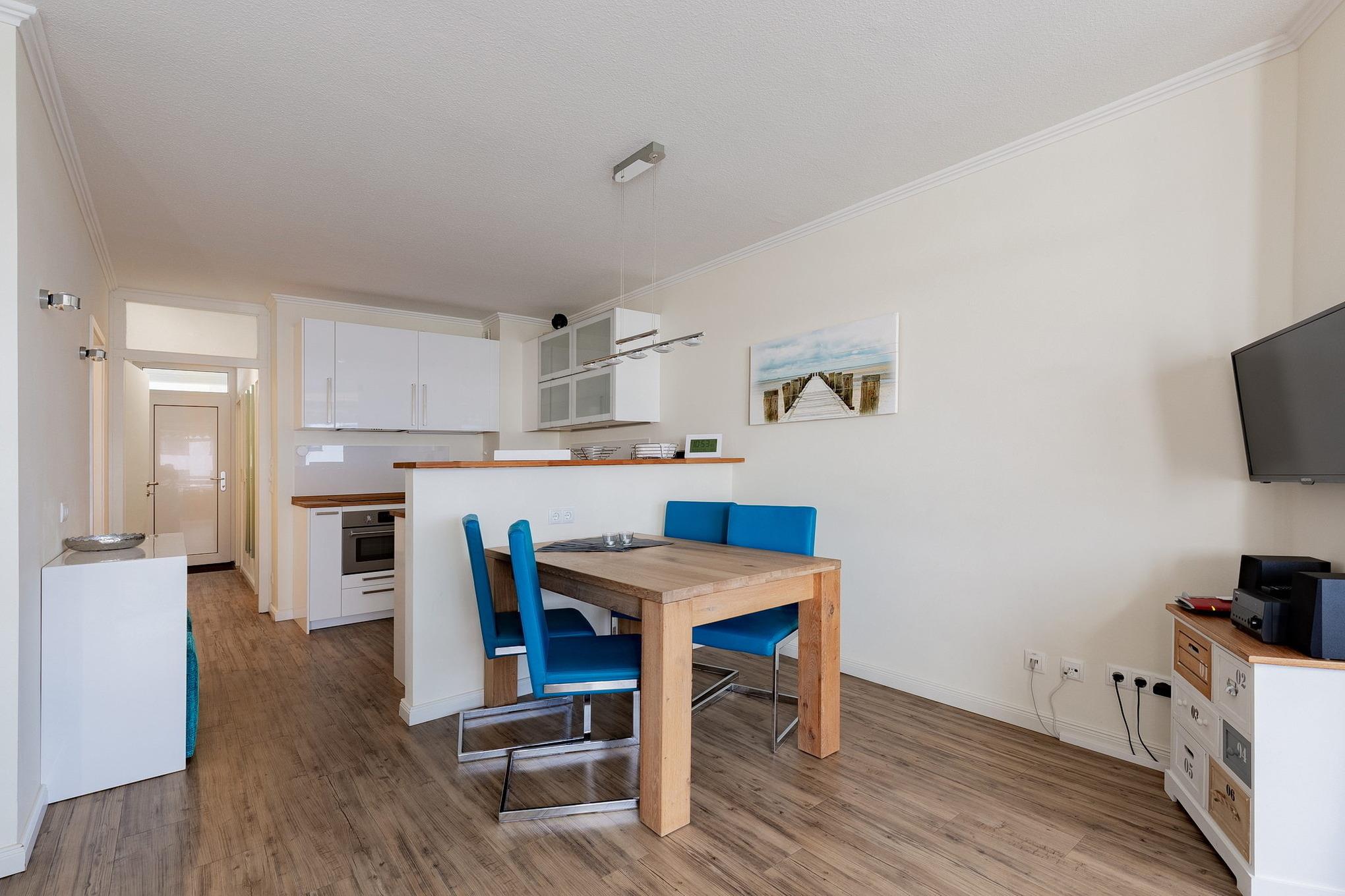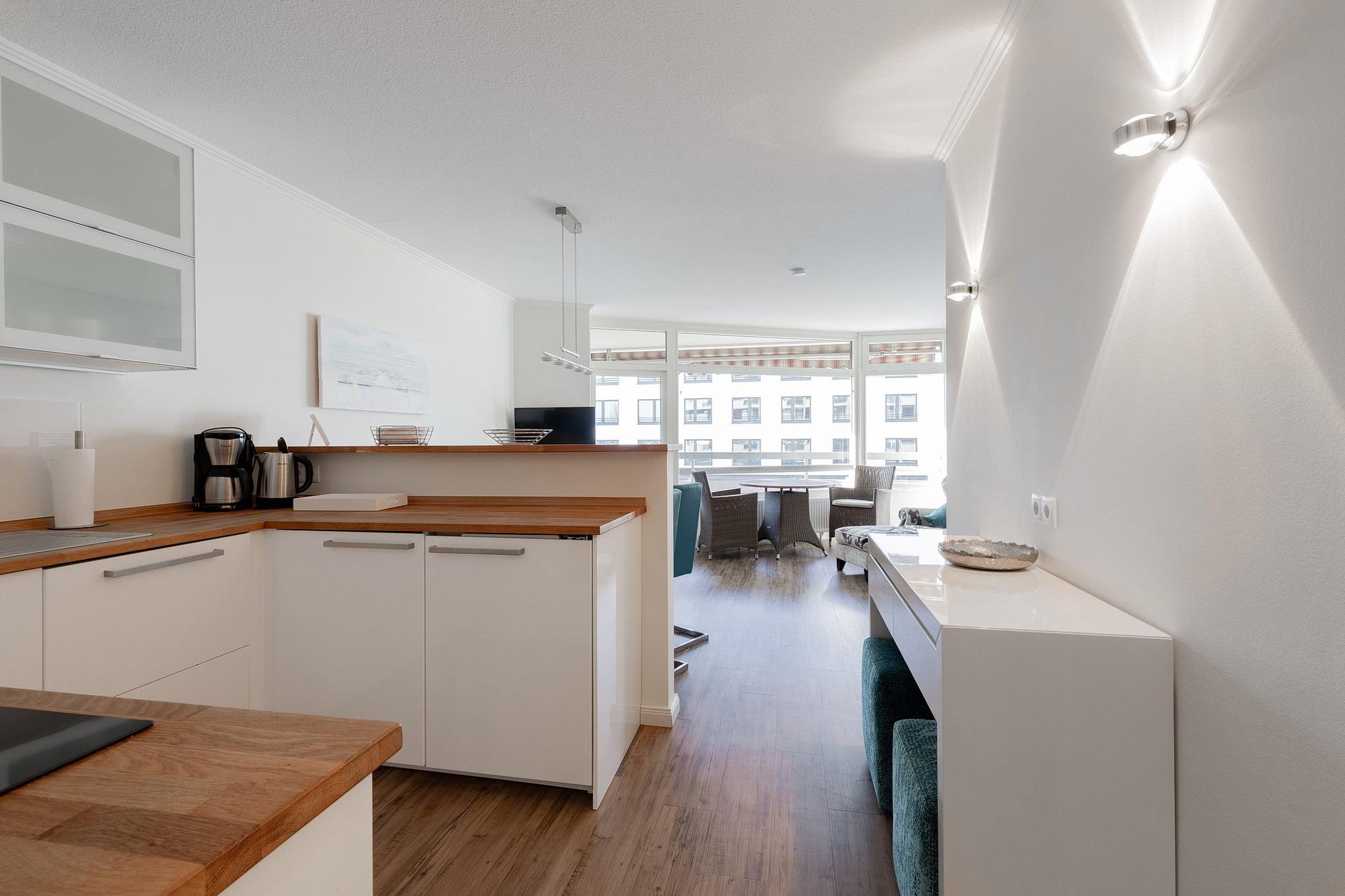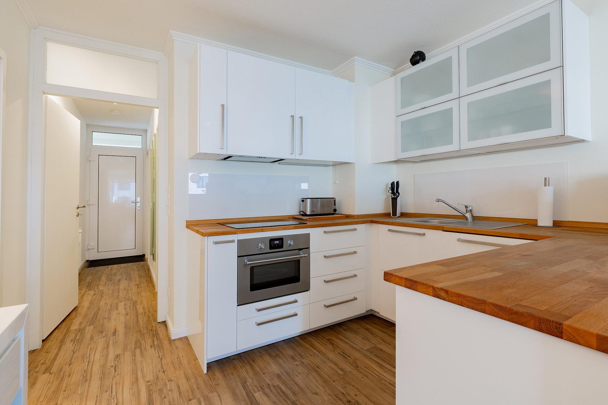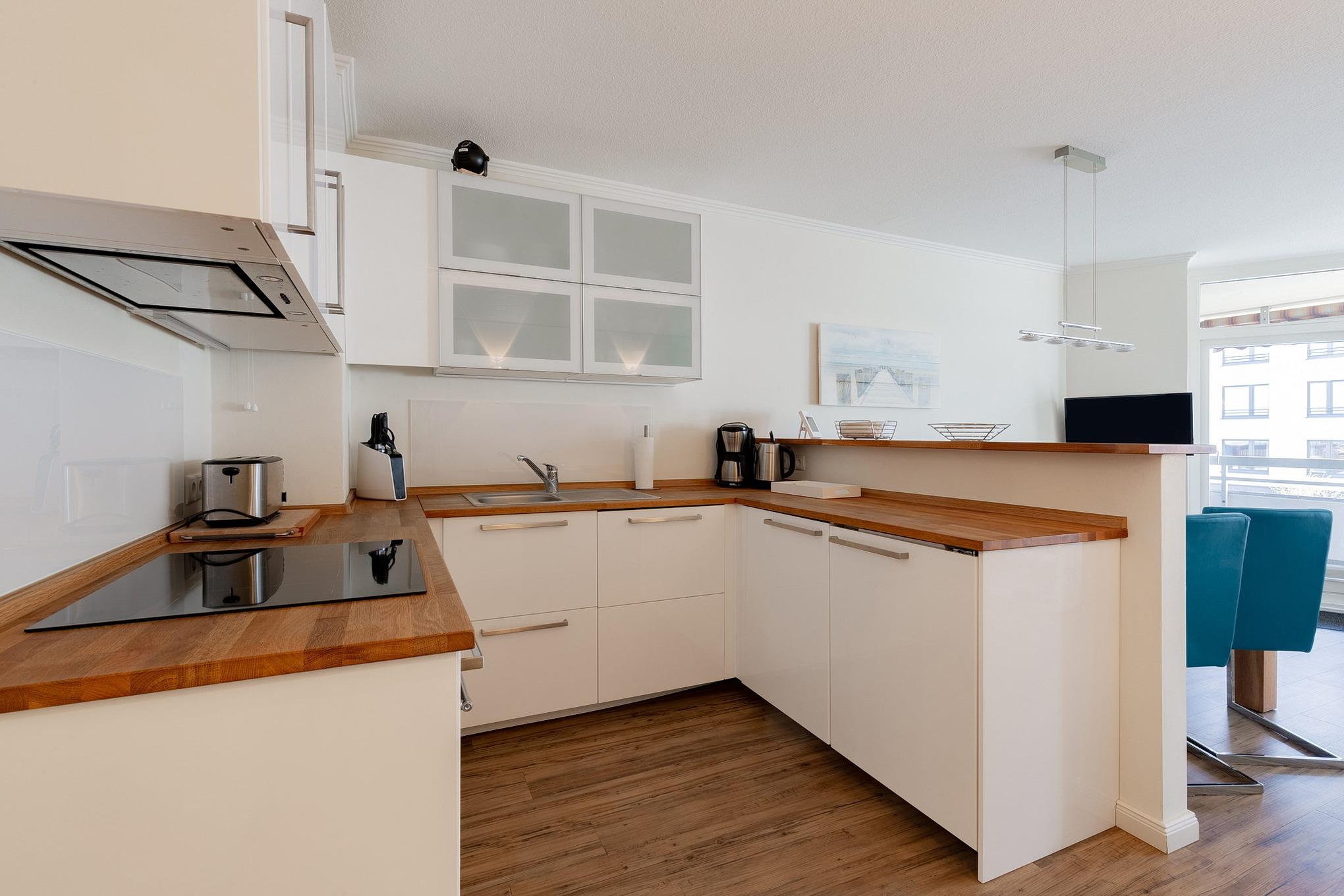 Die zum Wohnzimmer offen gestaltete Küche verfügt über einen 4-Platten Induktionsherd, einen Backofen, eine Spülmaschine und einen Kühlschrank mit 3-Sterne Gefrierfach. Des Weiteren ist die Küche mit einem Wasserkocher, einem Eierkocher, einem Toaster und einer Kaffeemaschine ausgestattet.