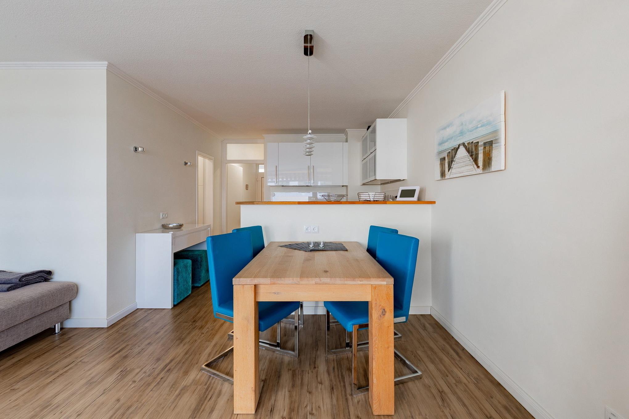 Das helle, moderne Wohn- und Esszimmer ist mit einer Eckcouch, einem Sessel sowie einem Esstisch mit 4 Stühlen ausgestattet und mit Designer-Planken ausgelegt. Zur Unterhaltung stehen ein Flachbildfernseher mit integriertem DVD-Player und eine Mini-Stereoanlage zur Verfügung