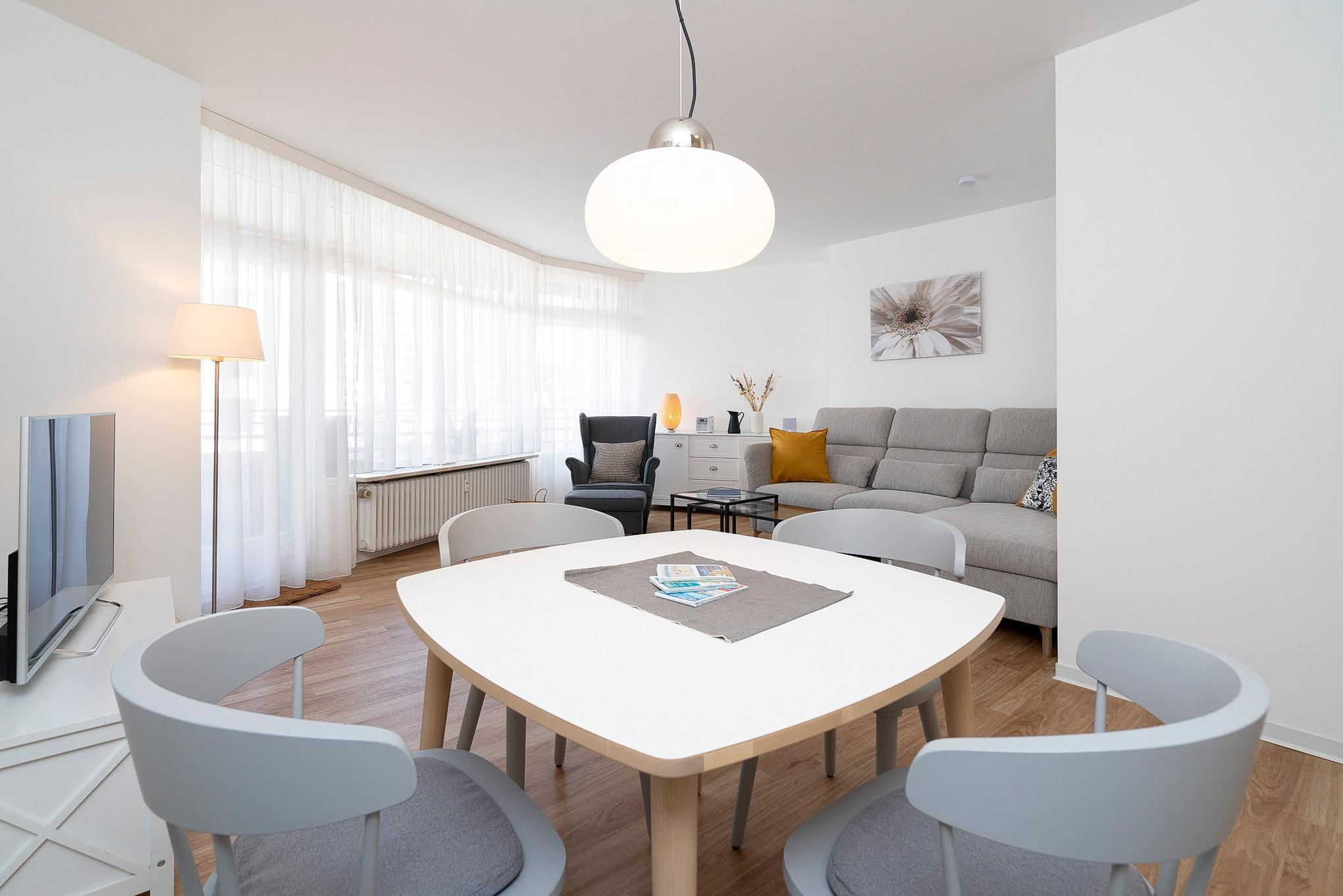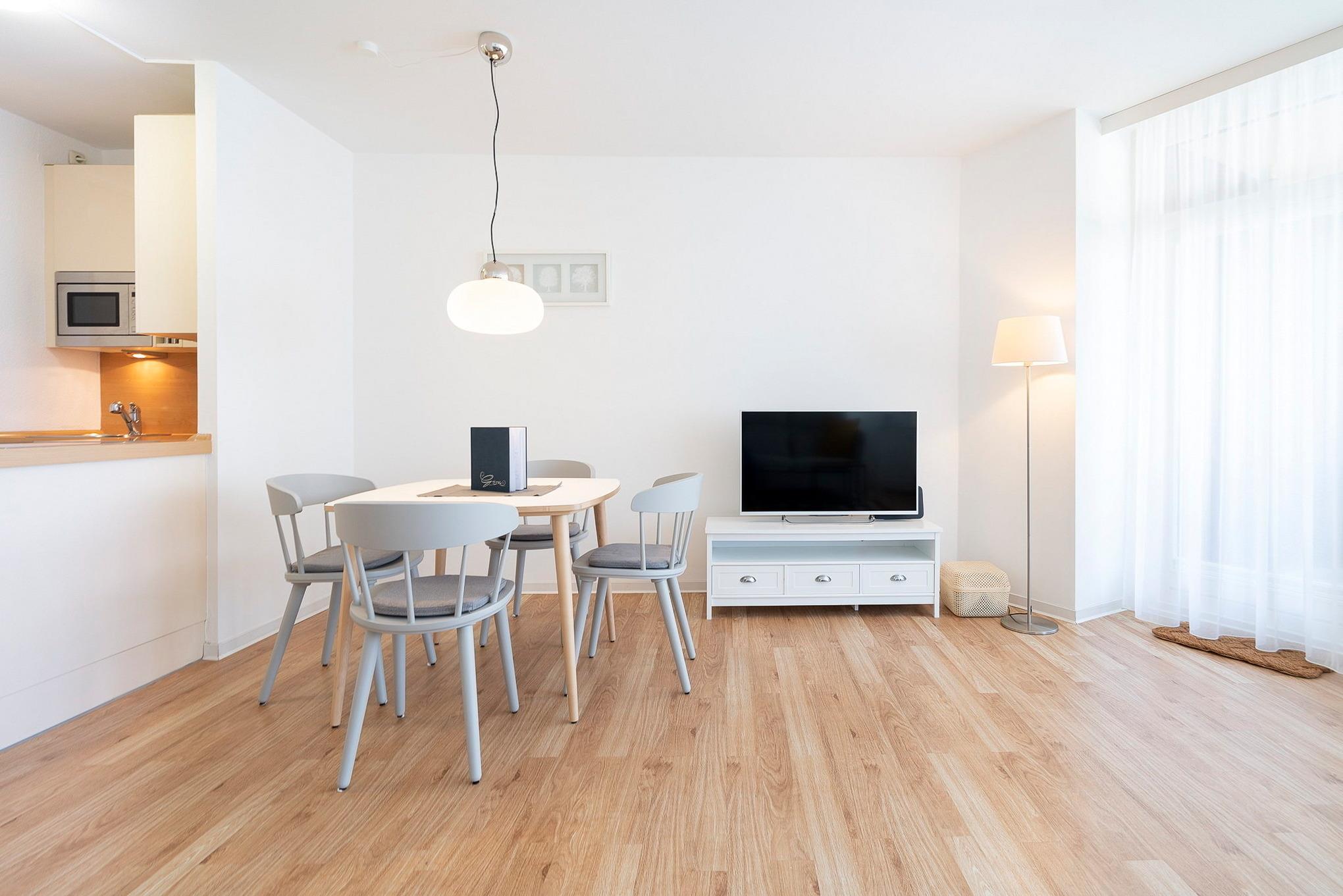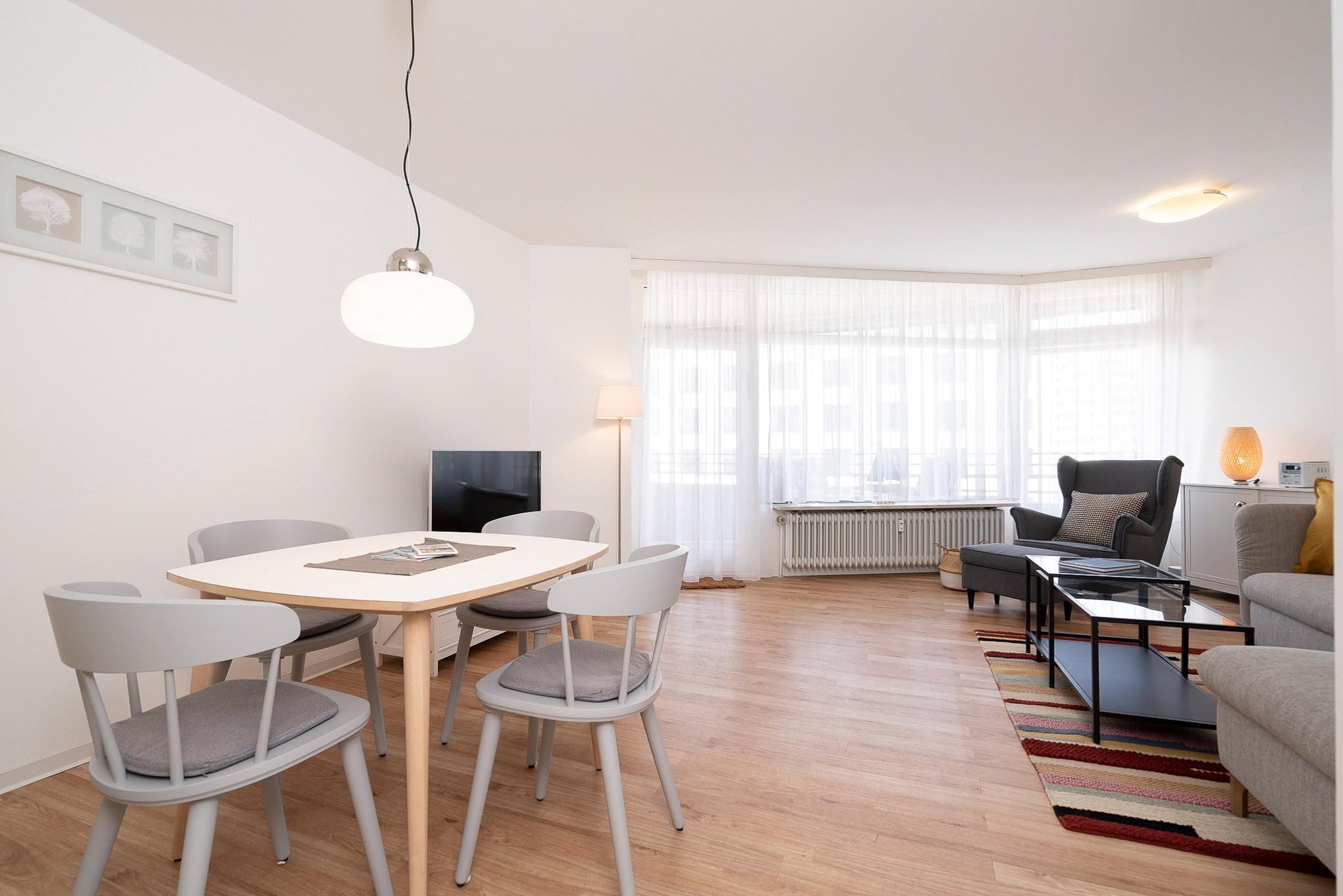 Das helle, geräumige Wohn- und Esszimmer ist mit Designer-Planken ausgelegt und hat einen direkten Zugang zum Balkon. Das Wohn- und Esszimmer ist mit einem Sofa mit Recamiere und Sessel mit Hocker, einem Couchtisch, einer Kommode und einem Essplatz für 4 Personen ausgestattet. Ein Fernseher mit DVD-Player und ein Radio stehen zur Unterhaltung bereit.