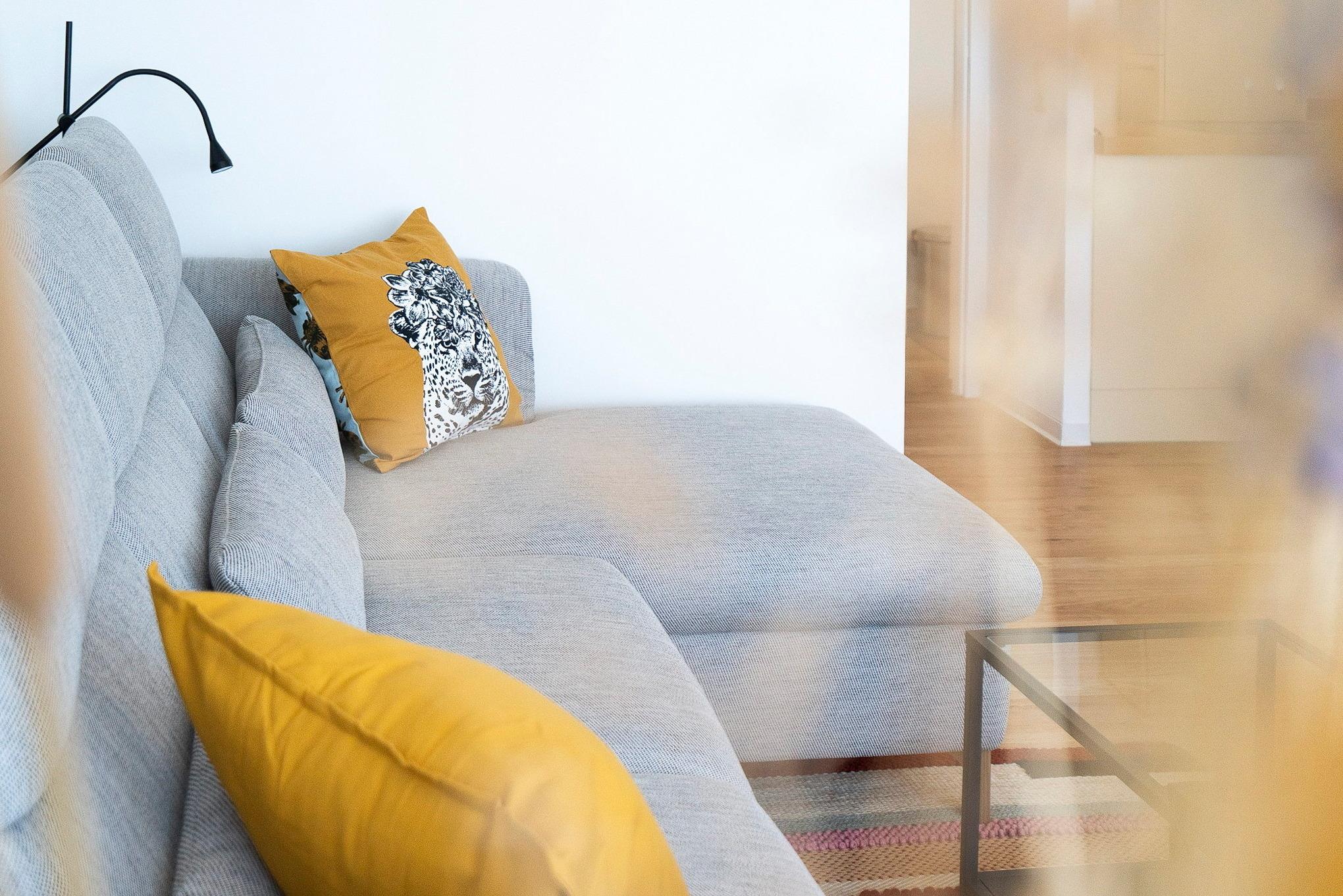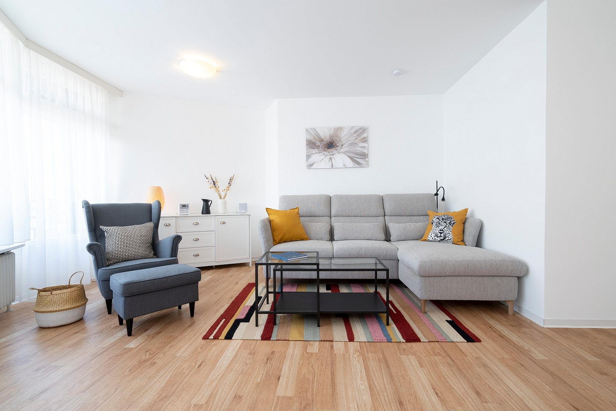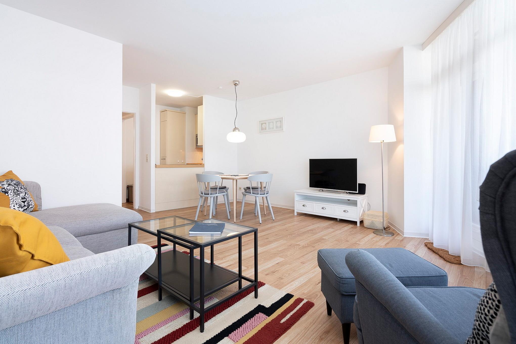 Das helle, geräumige Wohn- und Esszimmer ist mit Designer-Planken ausgelegt und hat einen direkten Zugang zum Balkon. Das Wohn- und Esszimmer ist mit einem Sofa mit Recamiere und Sessel mit Hocker, einem Couchtisch, einer Kommode und einem Essplatz für 4 Personen ausgestattet. Ein Fernseher mit DVD-Player und ein Radio stehen zur Unterhaltung bereit.