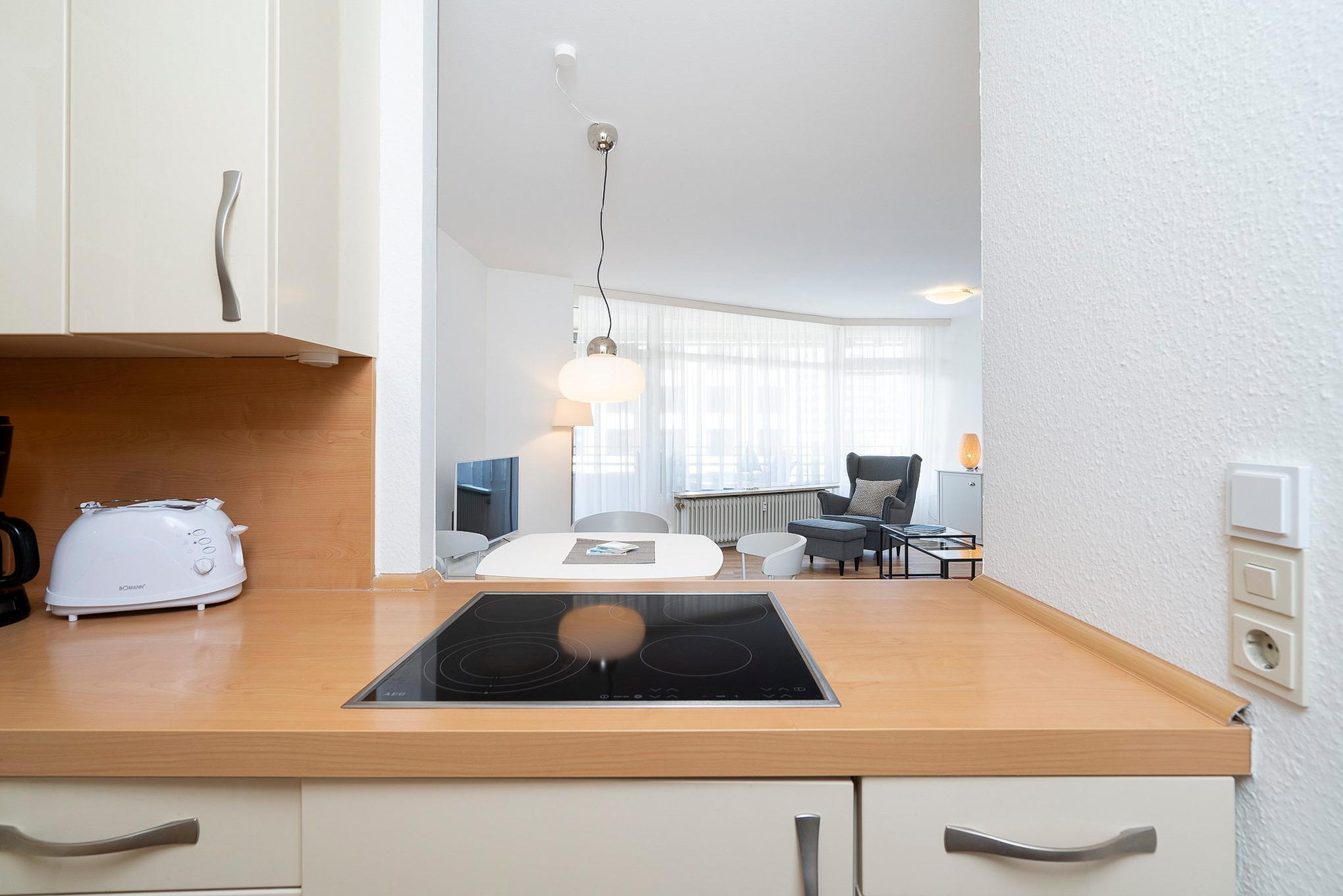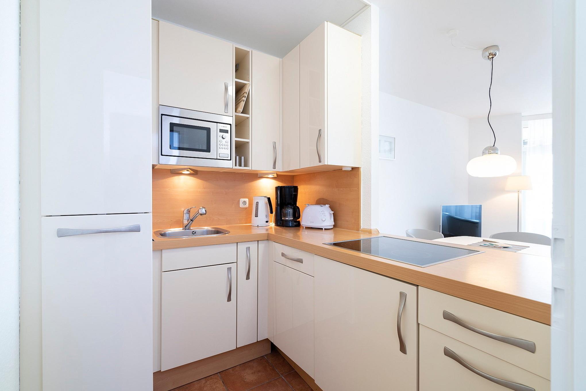 Moderne, komplett ausgestattete Küche mit 4-Platten Cerankochfeld, Kühlschrank mit kleinem 3-Sterne Gefrierfach, Spülmaschine, Toaster, Eierkocher, Kaffeemaschine und Wasserkocher.