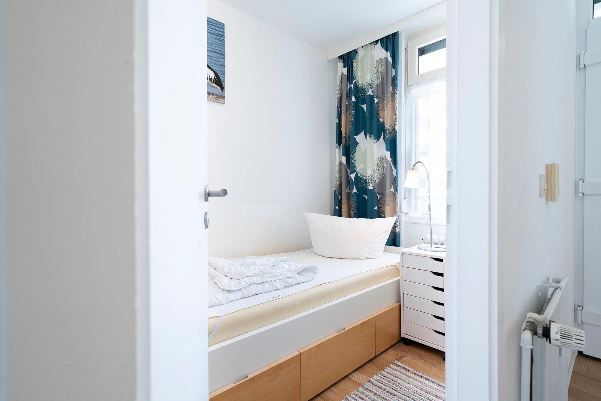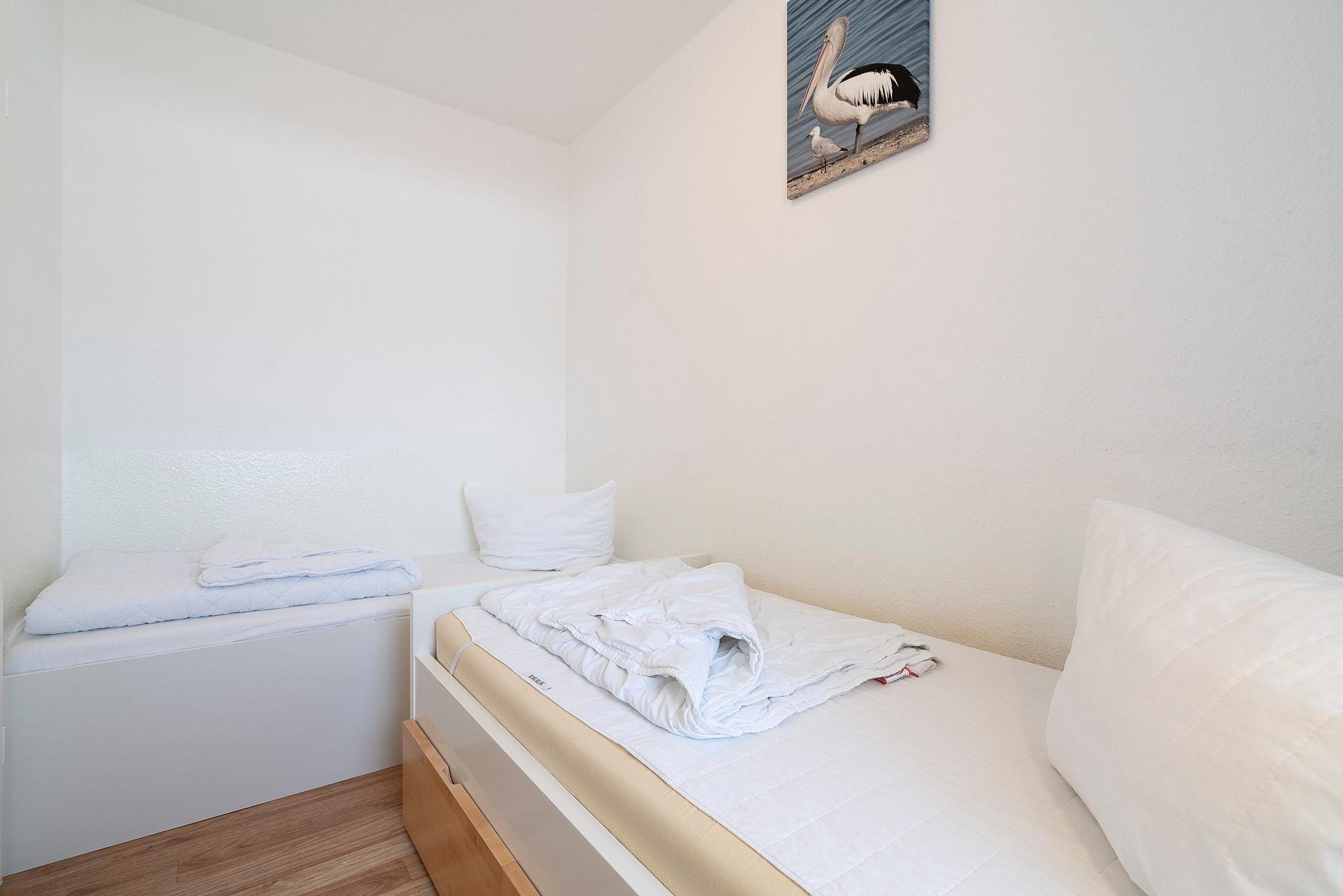Separates Kinderzimmer mit Fenster zum Laubengang. Das Kinderzimmer ist mit 2 getrennten Betten (90x200cm und 80x180cm) ausgestattet und mit Designer-Planken ausgelegt. Das Fenster zum Laubengang lässt sich durch Außenrolladen vollständig verdunkeln.