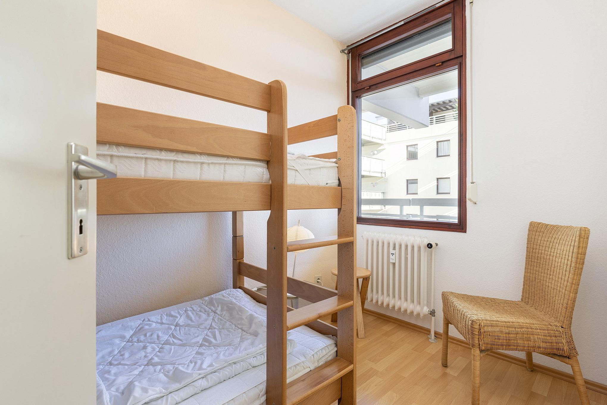 Kleines Kinderzimmer mit Fenster zum Laubengang (Rollo). Ausgestattet mit einem Etagenbett (90 x 200cm). Laminatfußboden.