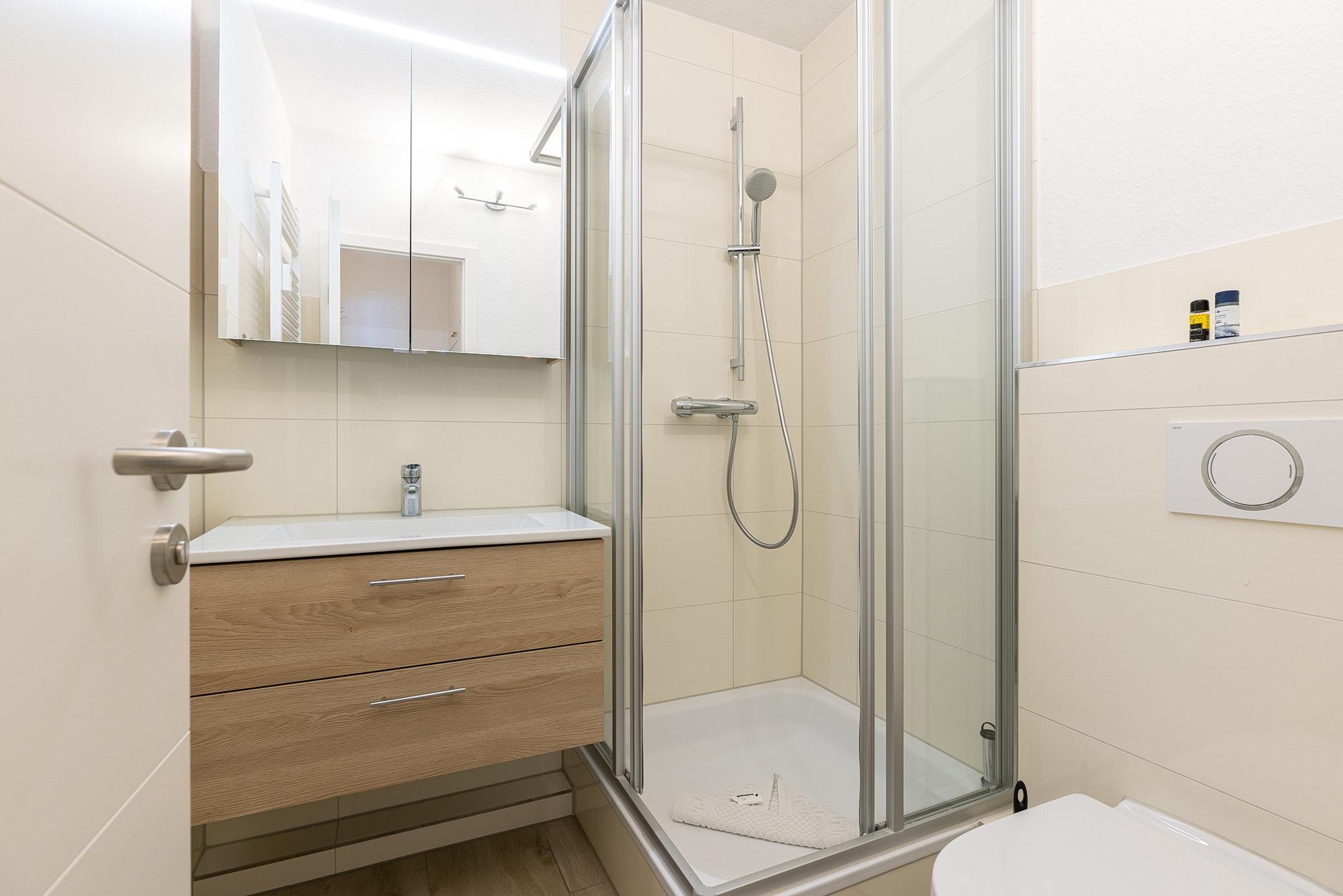 Hell gefliestes, modernes Bad mit Dusche, Waschbecken und WC.