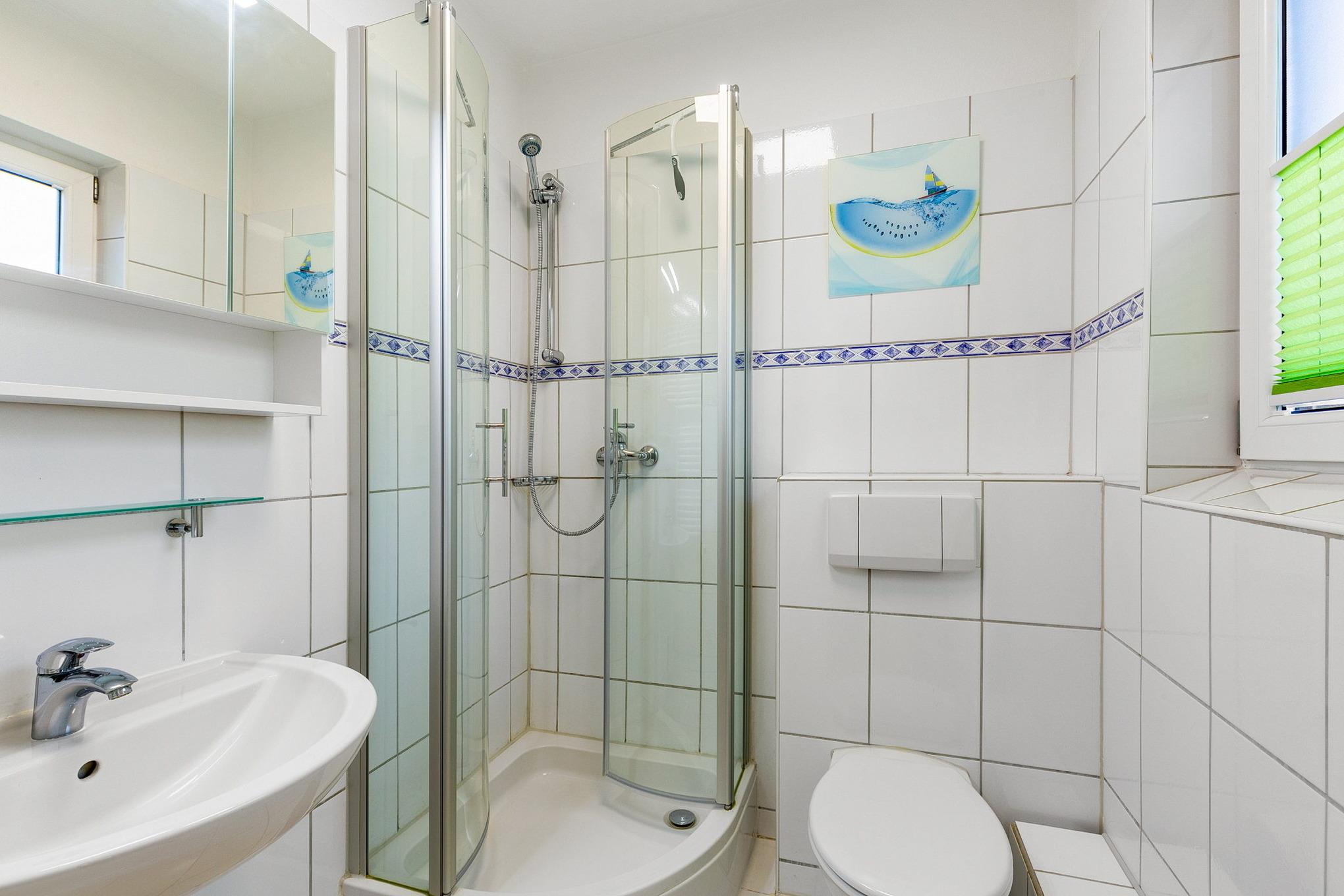 Hell gefliestes Tageslichtbad mit WC, Waschbecken und Dusche im Erdgeschoss.