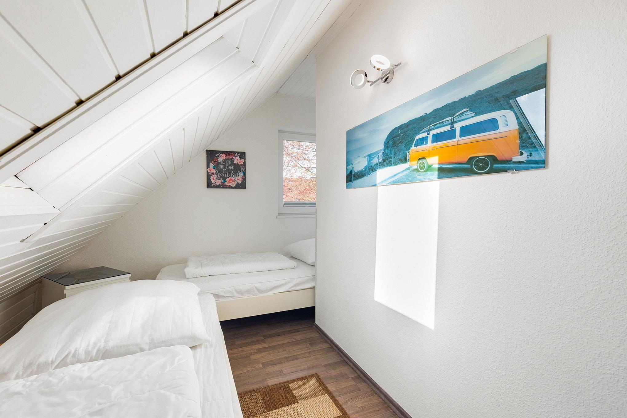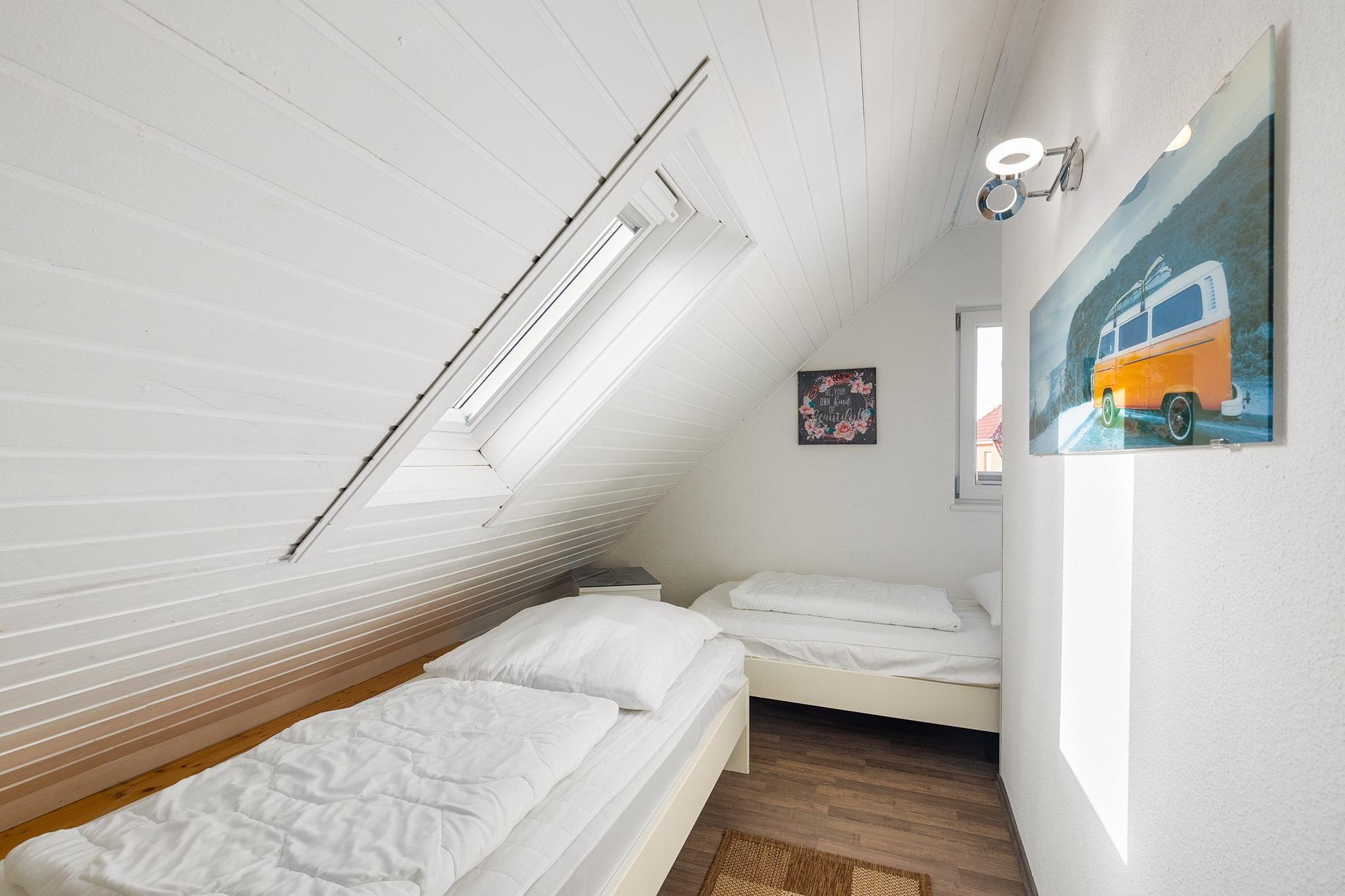 Das im Obergeschoss liegende Kinderzimmer ist mit 2 übereck stehenden Betten (80x200cm und 90x190cm) ausgestattet. Das Kinderzimmer ist mit Laminat ausgelegt, die Fenster lassen sich durch ein Rollo verdunkeln.