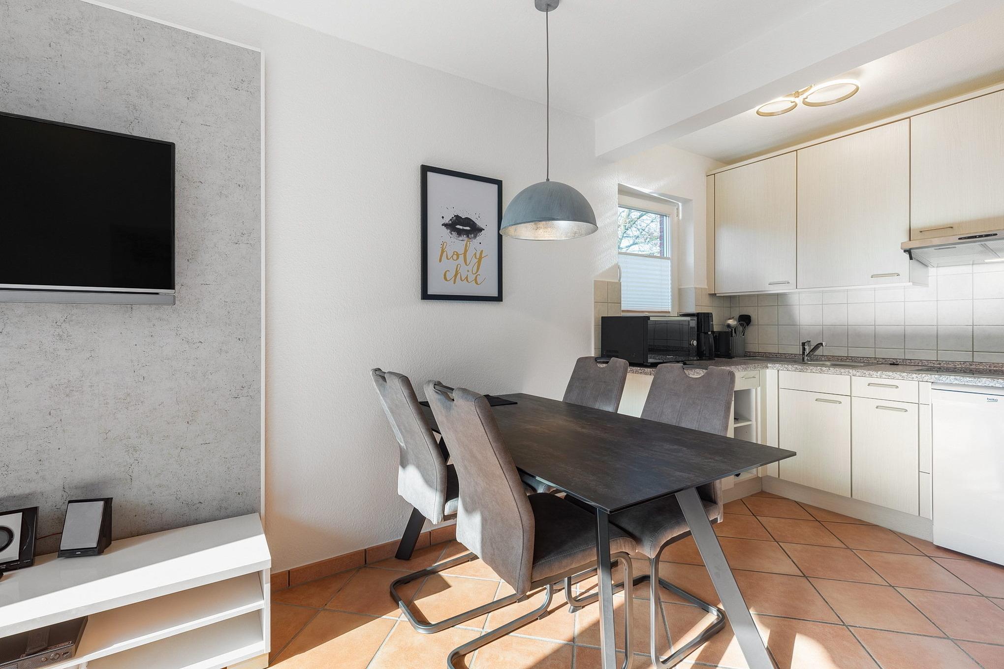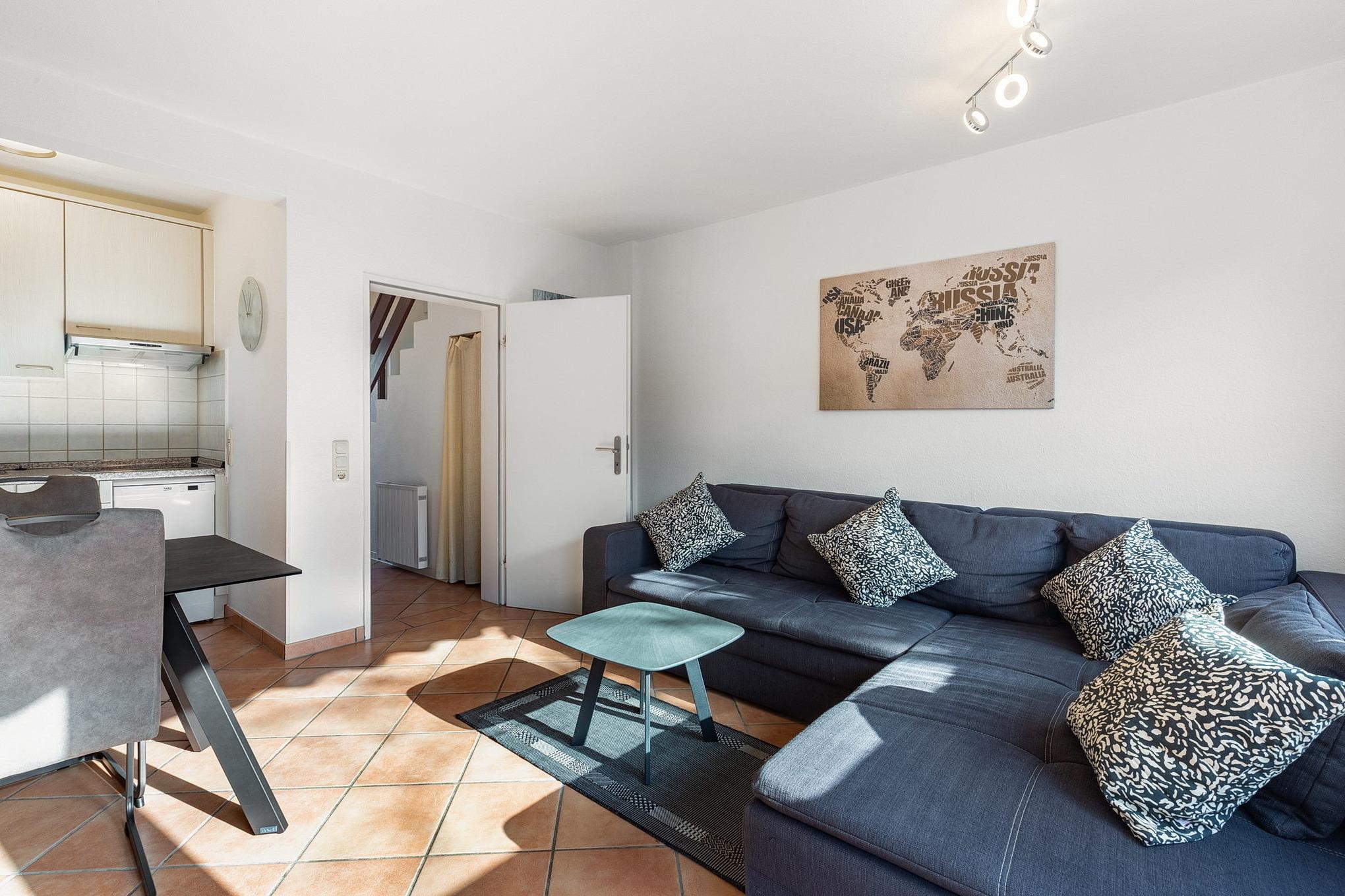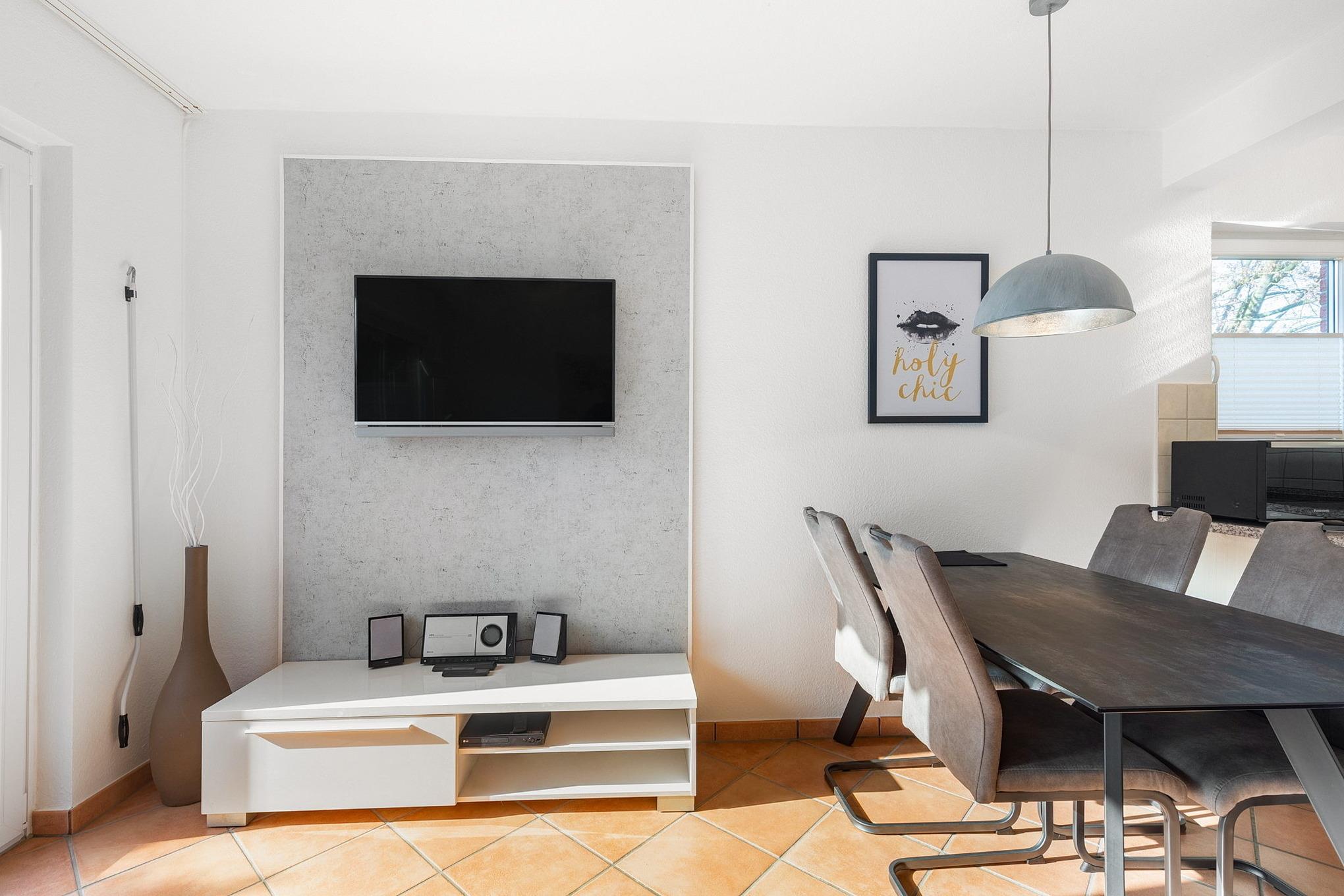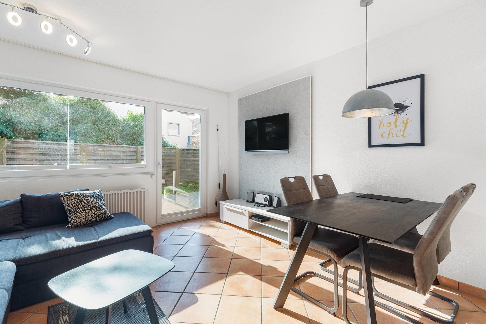 Helles gefliestes Wohn- und Esszimmer im Erdgeschoss mit einem Essplatz für 4 Personen, einer Eckcouch, Couchtisch und einer Kommode. Sat-TV, DVD-Player und eine Mini-Stereoanlage mit CD-Player stehen für die Unterhaltung bereit.