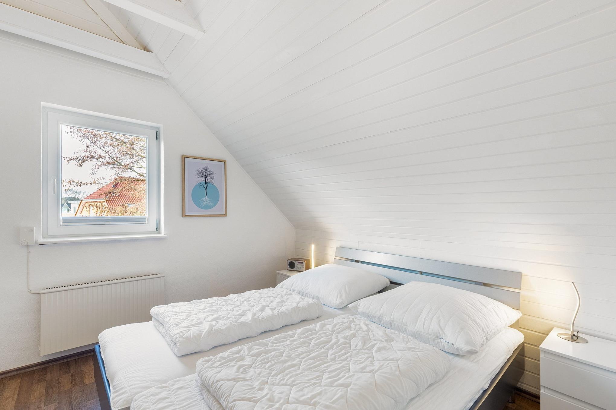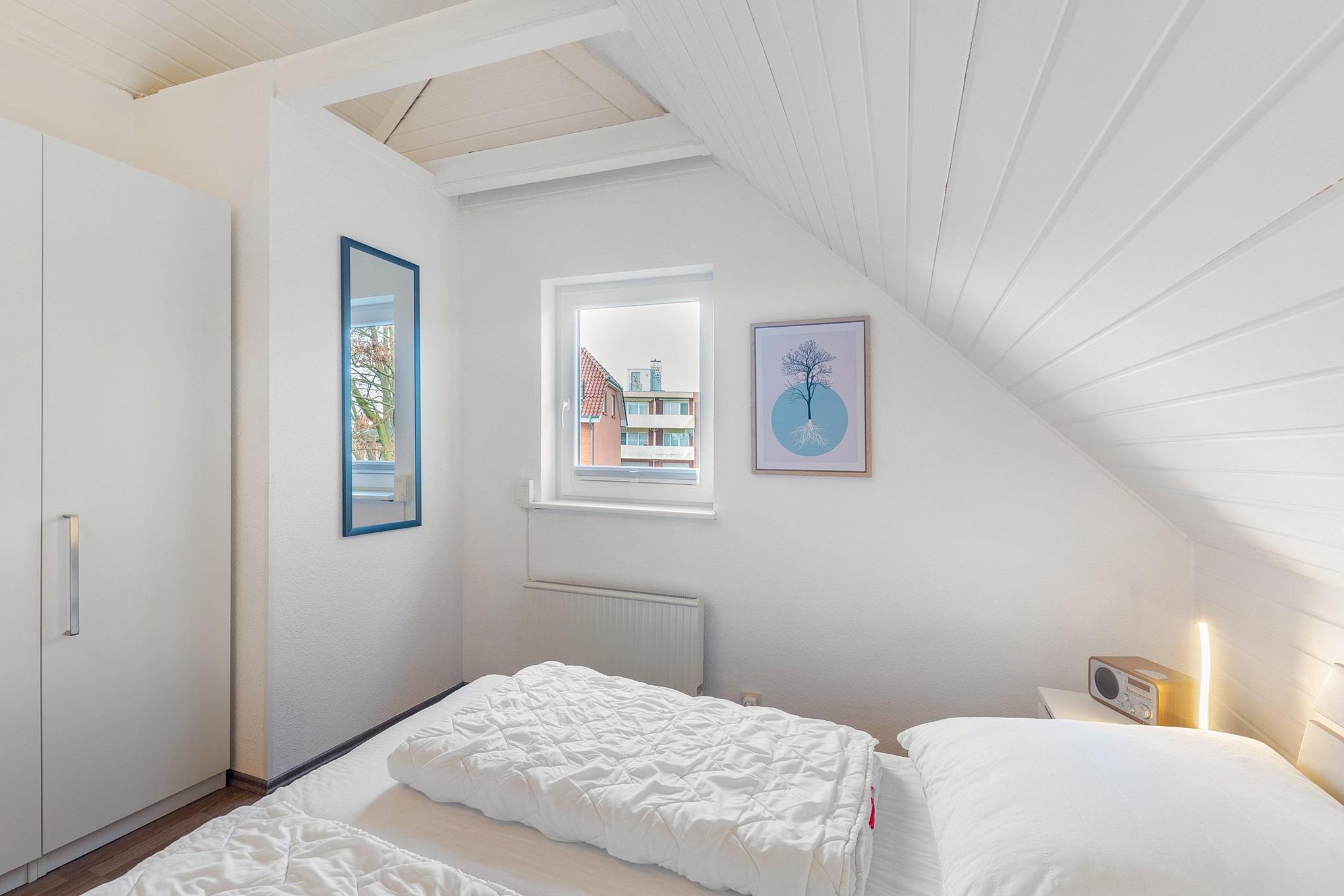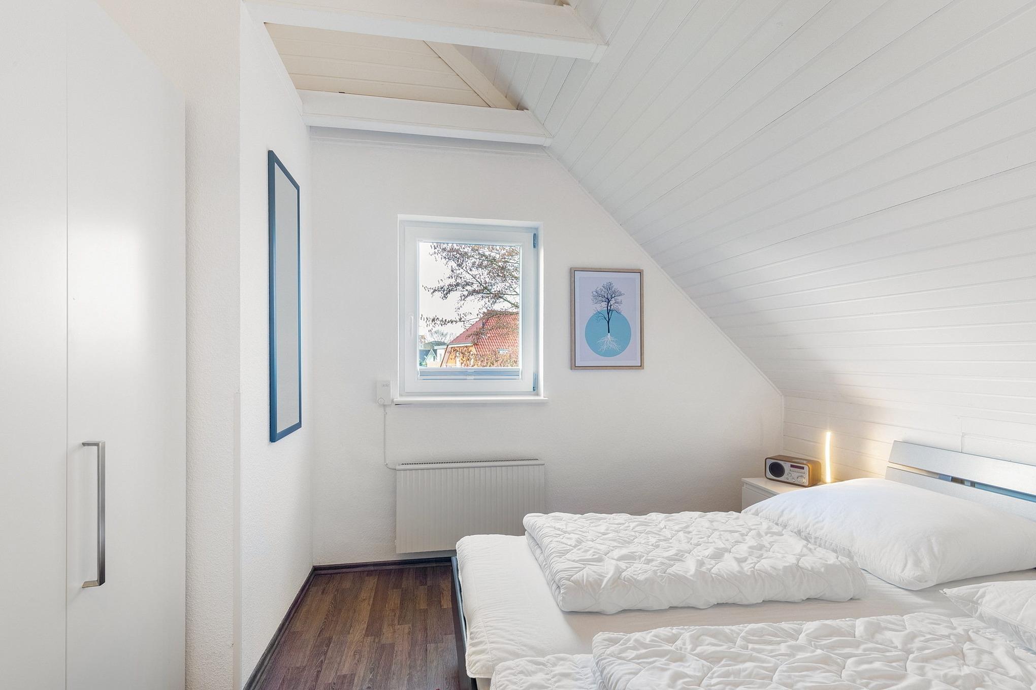 Das Schlafzimmer befindet sich im Obergeschoss und ist mit einem Doppelbett (2x 80x200cm) und einem großen Kleiderschrank mit Spiegel ausgestattet. Das Schlafzimmer ist mit Laminat ausgelegt. Das Fenster lässt sich durch ein Rollo verdunkeln
