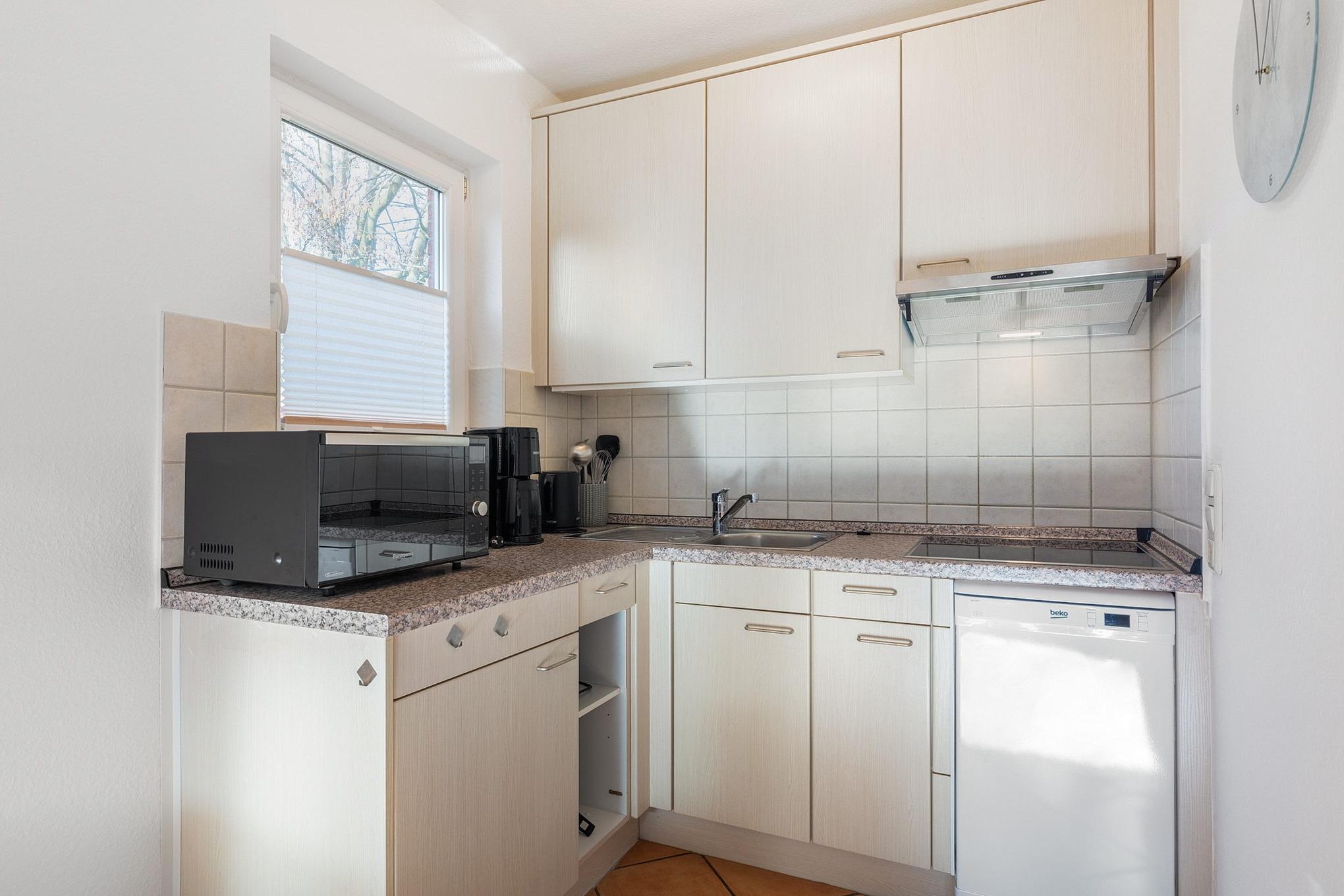 Die zum Wohnzimmer offene Küche ist komplett ausgestattete mit 4-Platten Cerankochfeld, Kühlschrank mit kleinem 3-Sterne Gefrierfach, Spülmaschine, Mikrowelle und mobilem Backofen, sowie Wasserkocher, Toaster und Kaffeemaschine.