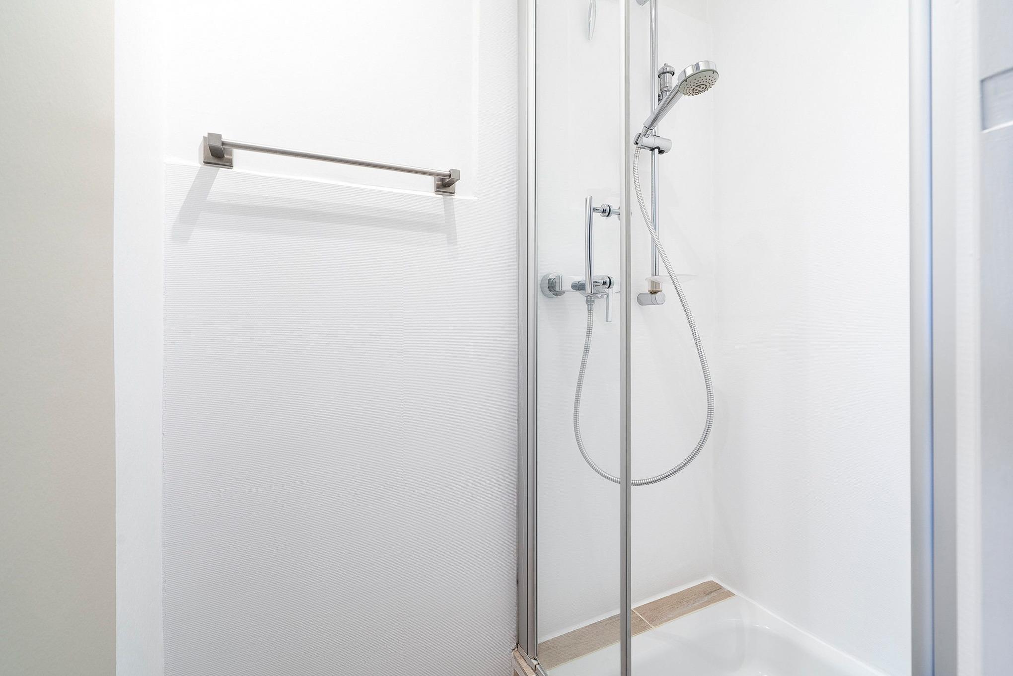Das separate Schlafzimmer ist mit einem Doppelbett (1x 180 x 200cm) und einem 1-türigen Kleiderschrank ausgestattet. Das Zimmer ist mit Designer-Planken ausgelegt. Ein weiterer Kleiderschrank befindet sich im Flur. Das Fenster zum Laubengang lässt sich blickdicht verdunkeln.