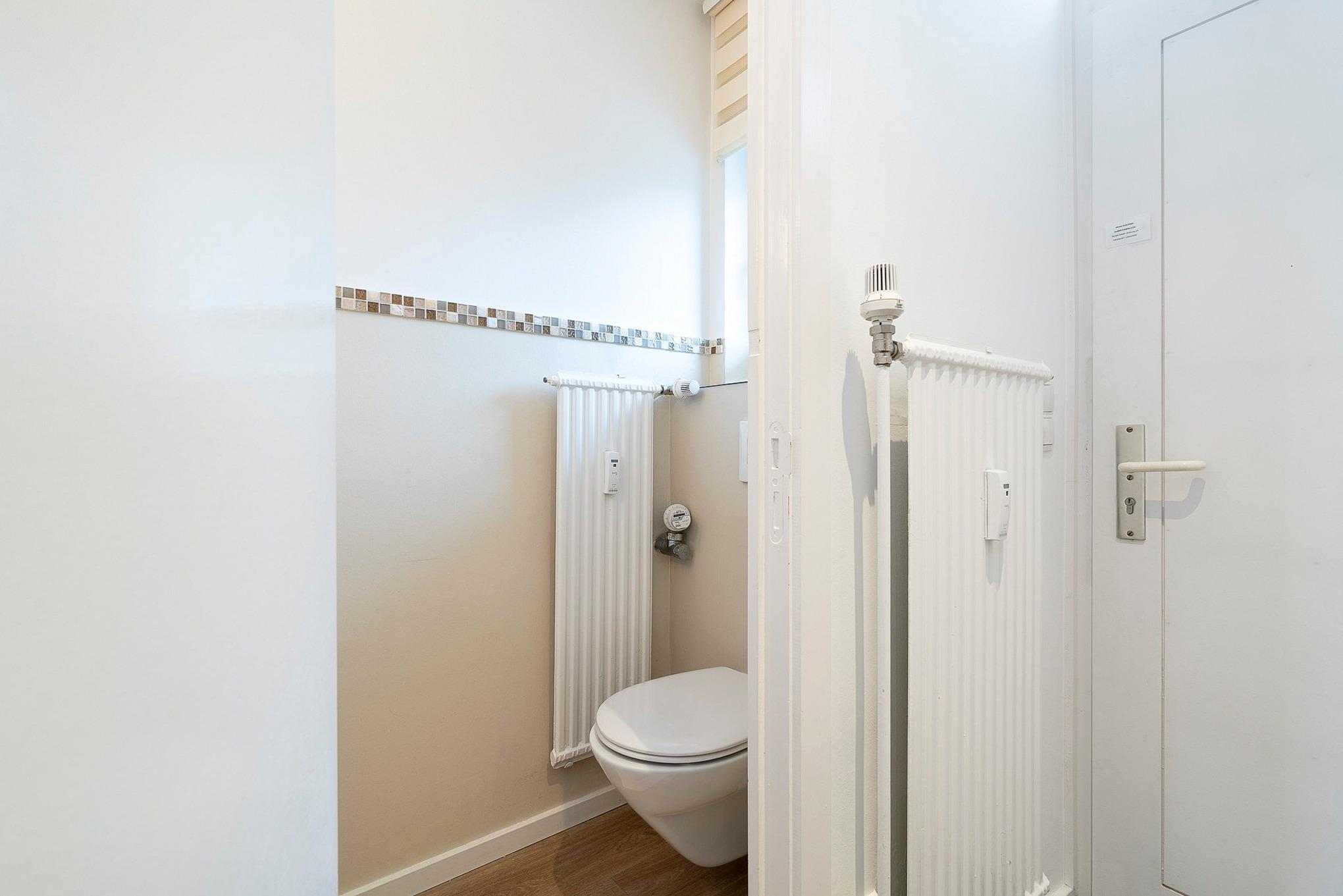 Innenliegendes modernes, hell gefliestes, kleines Bad mit Dusche und Waschbecken. Separates kleines WC mit Tageslicht.