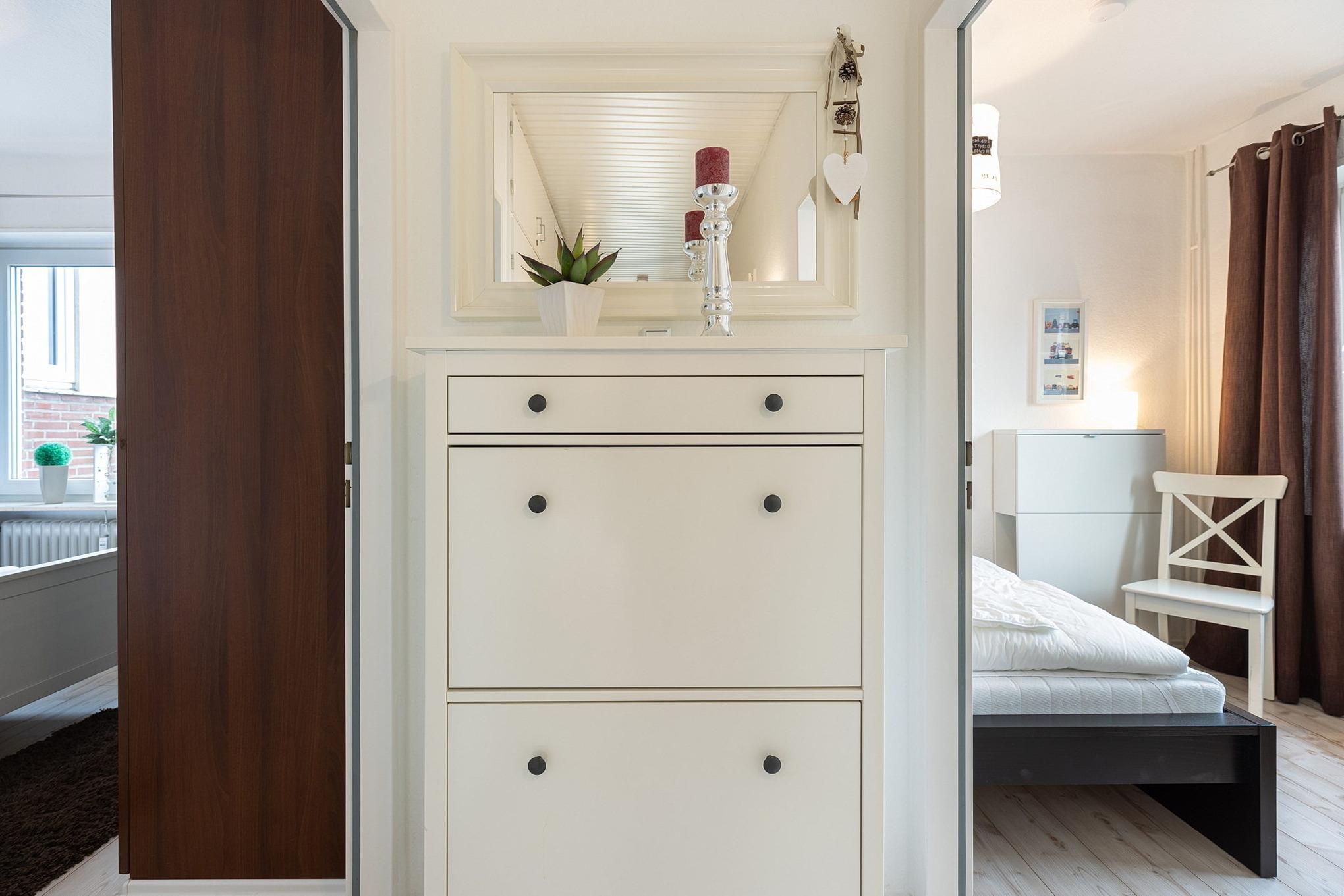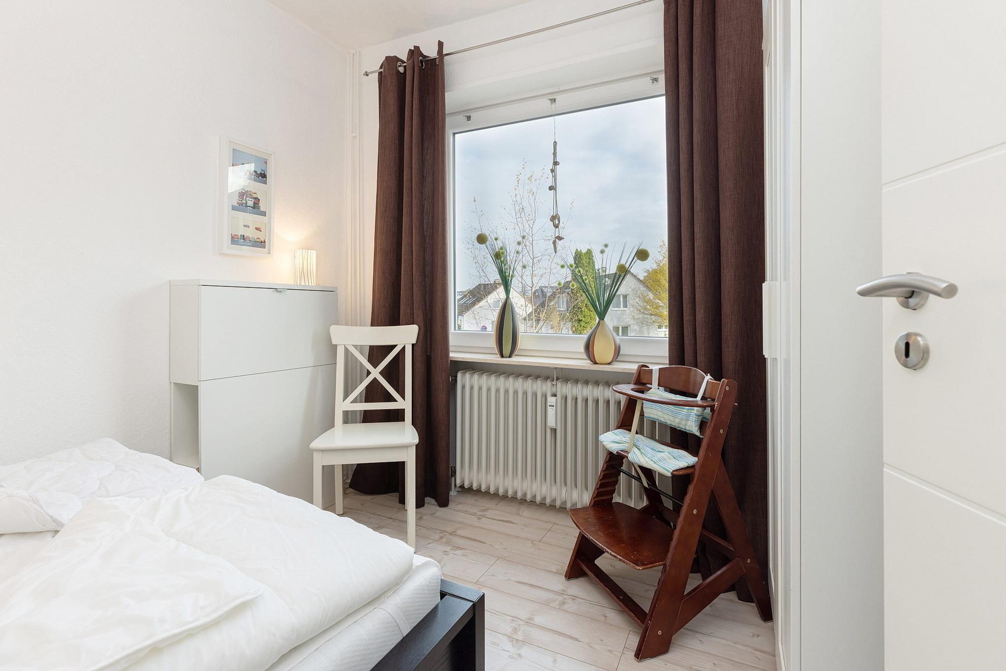 Das kleine freundliche Schlafzimmer ist ausgestattet mit einem Doppelbett (2x70x200cm) und einem kleinen Kleiderschrank.