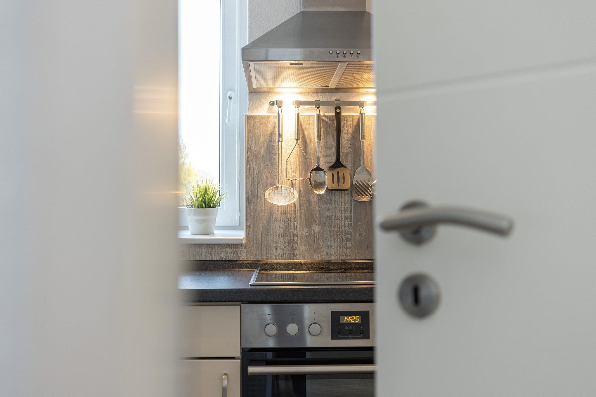 Moderne hochwertige zum Wohnbereich offene komplett ausgestattete Küche mit Kühlschrank, Spülmaschine, Mikrowelle, Backofen und 4-Platten-Cerankochfeld. Außerdem stehen eine Kaffeemaschine, ein Wasserkocher und ein Toaster zur Nutzung bereit.