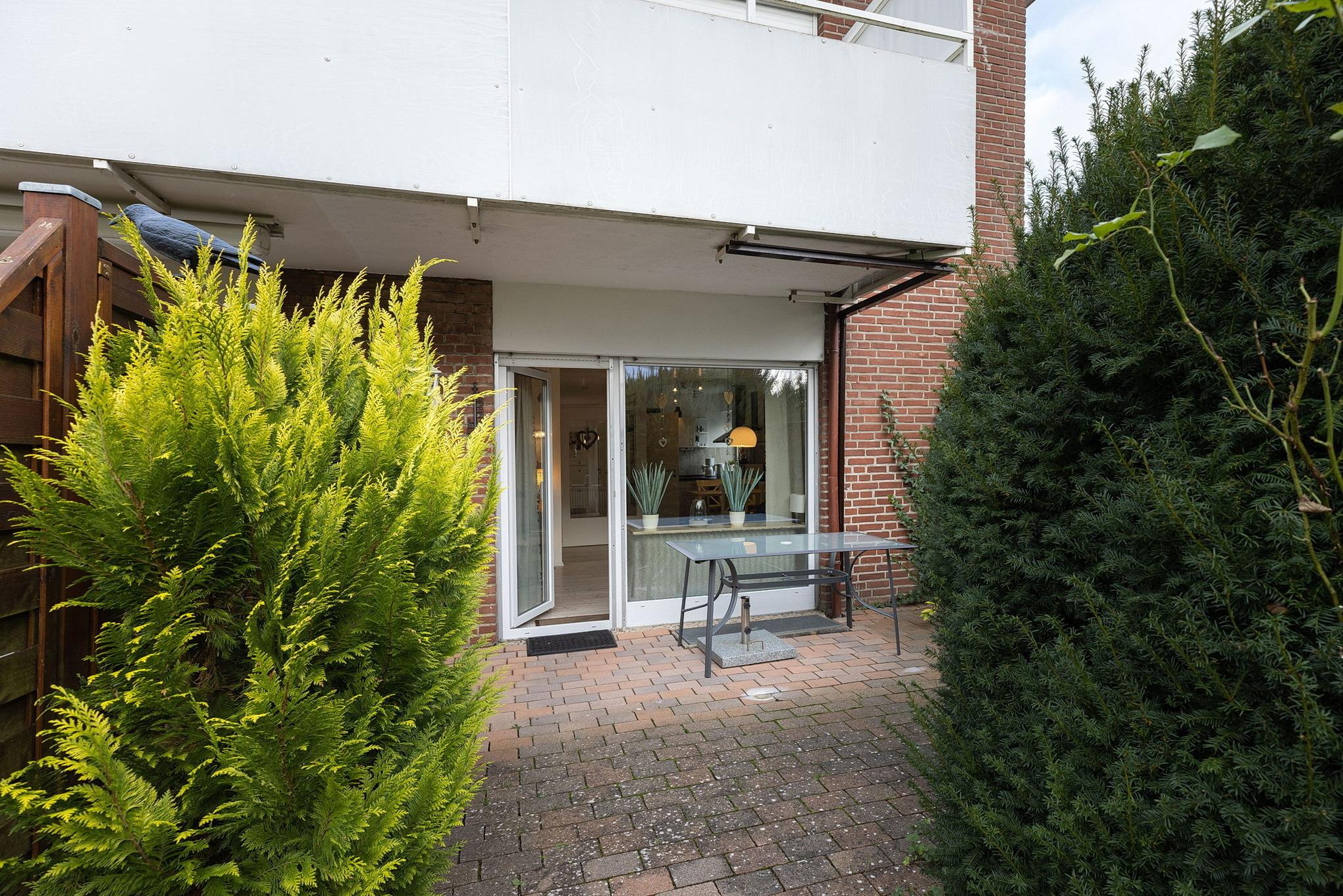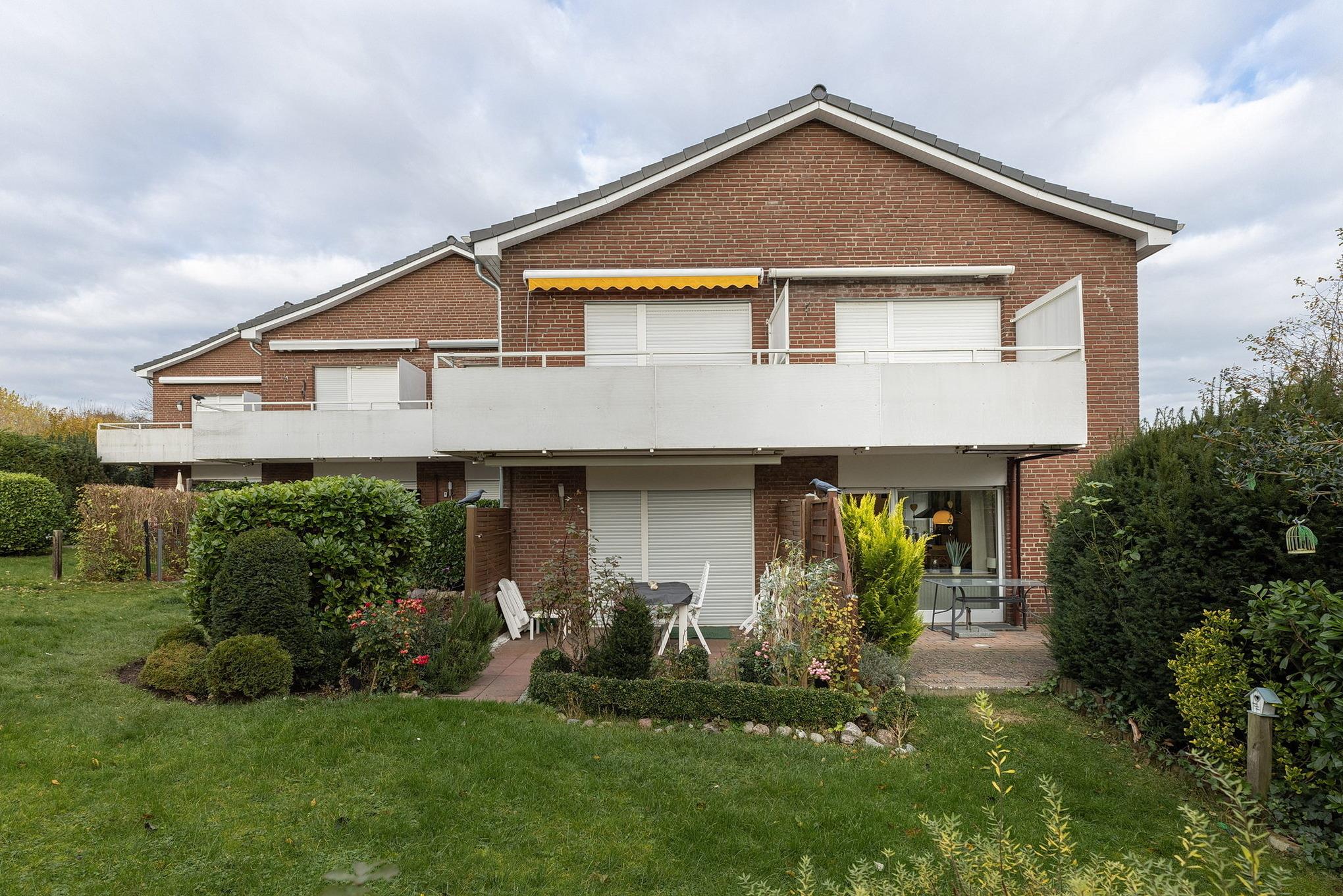 Das Appartement ist die untere Wohnung einer Reihenhaus ähnlich-gestalteten Anlage.
