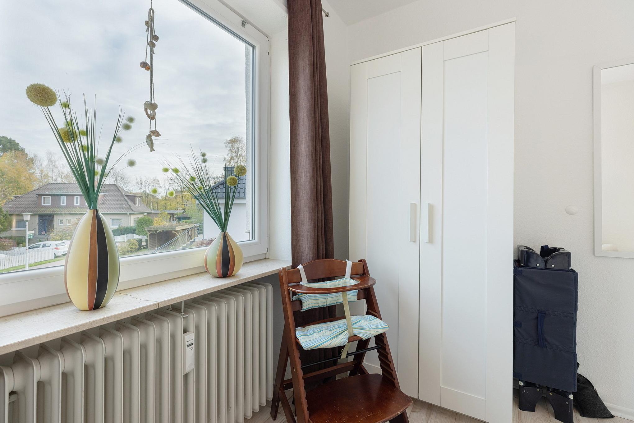 Ein zusätzliches Kinderbett, sowie ein Hochstuhl und Spielzeug gehören mit zur Ausstattung.