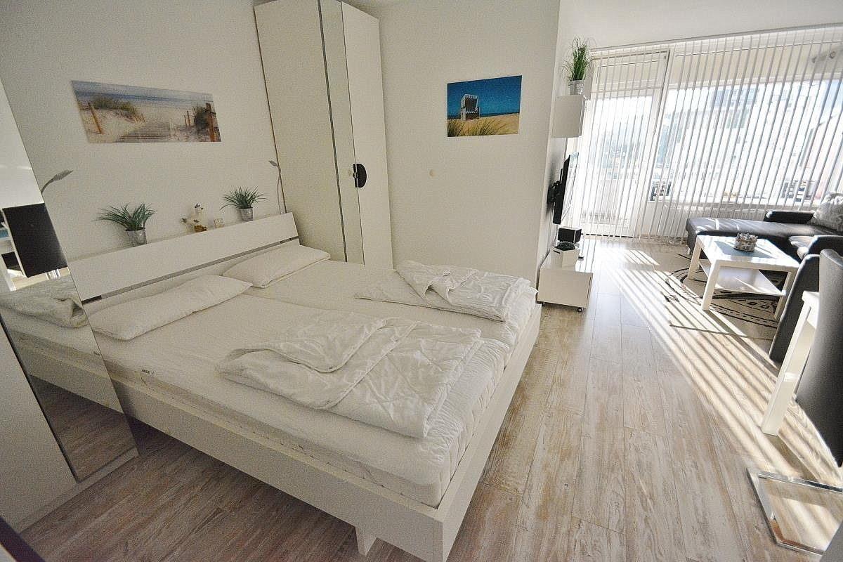 Modern eingerichtetes Wohn- und Schlafzimmer mit direktem Zugang zum Balkon. Das Wohn- und Schlafzimmer ist mit einem Essplatz für 4 Personen, einer Ledercouch, einem Couchtisch, und einem Doppelbett (2x80x200) sowie zwei Kleiderschränken ausgestattet. Zur Unterhaltung steht ein Flachbildfernseher und eine Mini-Stereoanlage mit USB und I-POD Anschluss zur Verfügung. Das Zimmer ist mit Designer-Planken ausgelegt. Die Fenster lassen sich durch Lamellen verdunkeln.