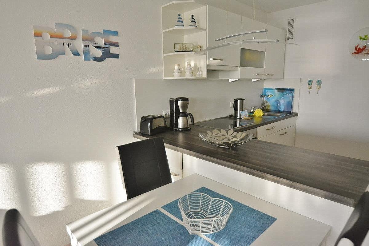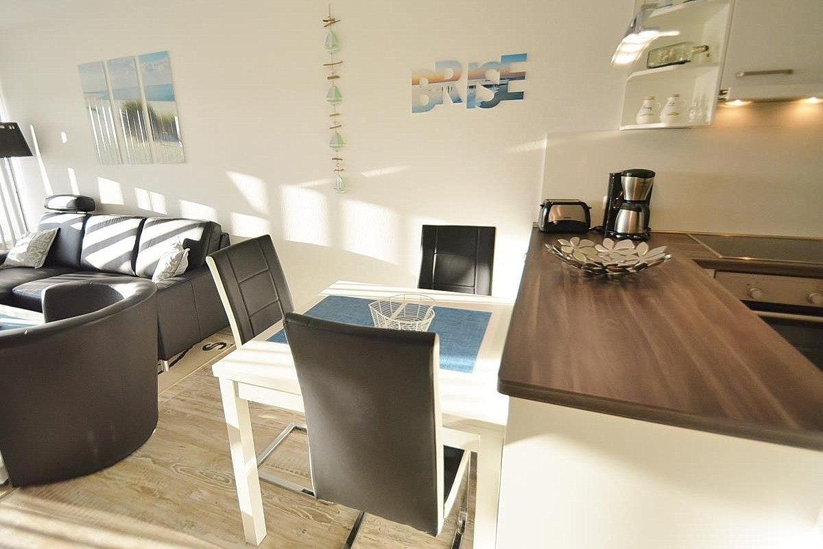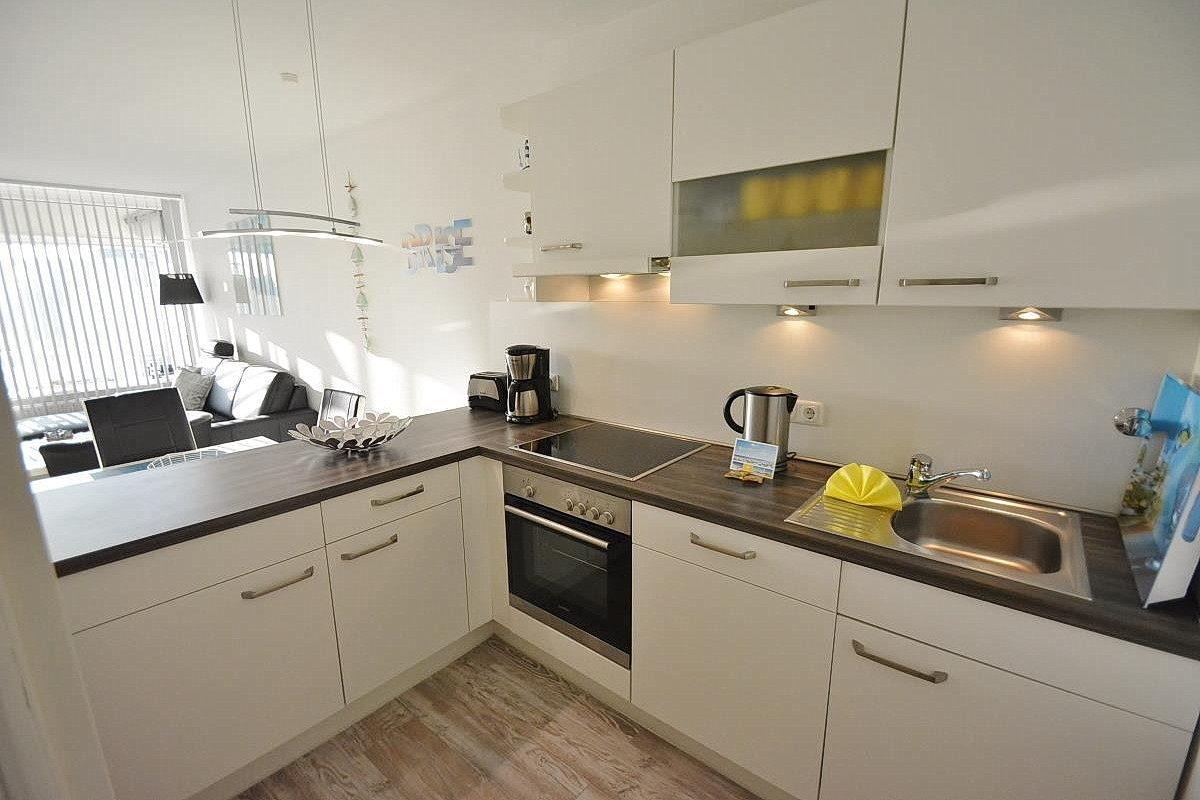 Zum Wohn- und Esszimmer offene, moderne, komplett ausgestattete Küche mit 4 Platten Cerankochfeld, Backofen, Kühlschrank mit kleinem 4-Sterne Gefrierfach, Mikrowelle, Spülmaschine, Kaffeemaschine, Wasserkocher und Toaster.